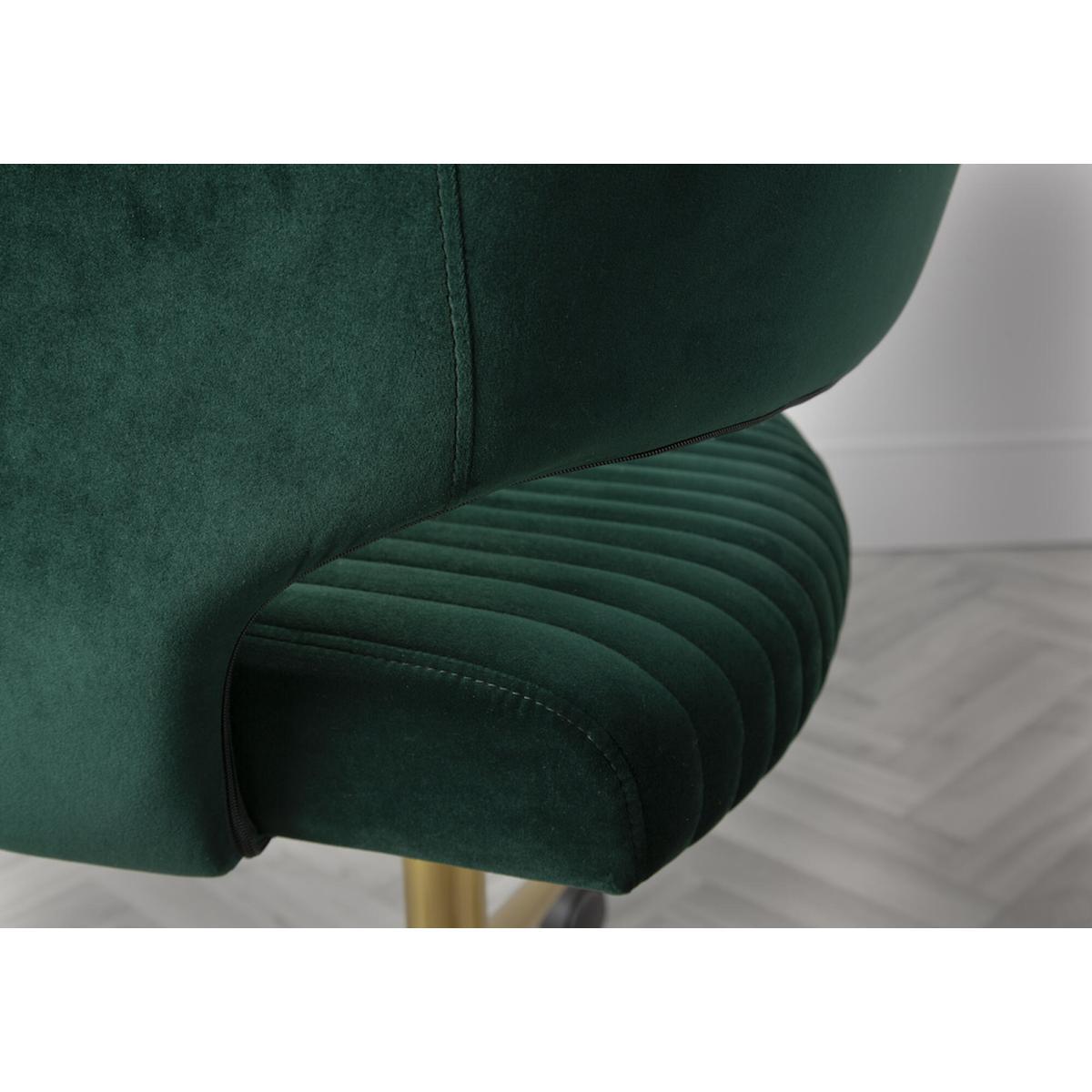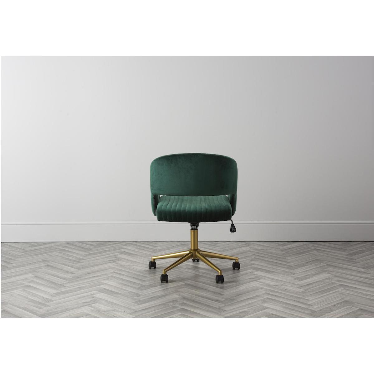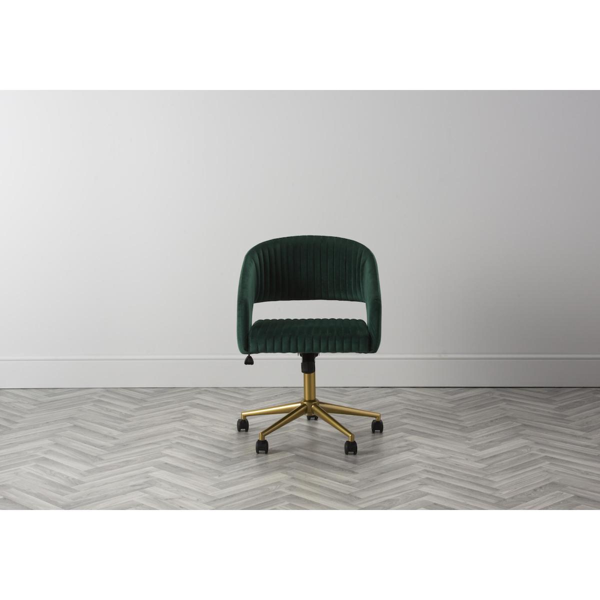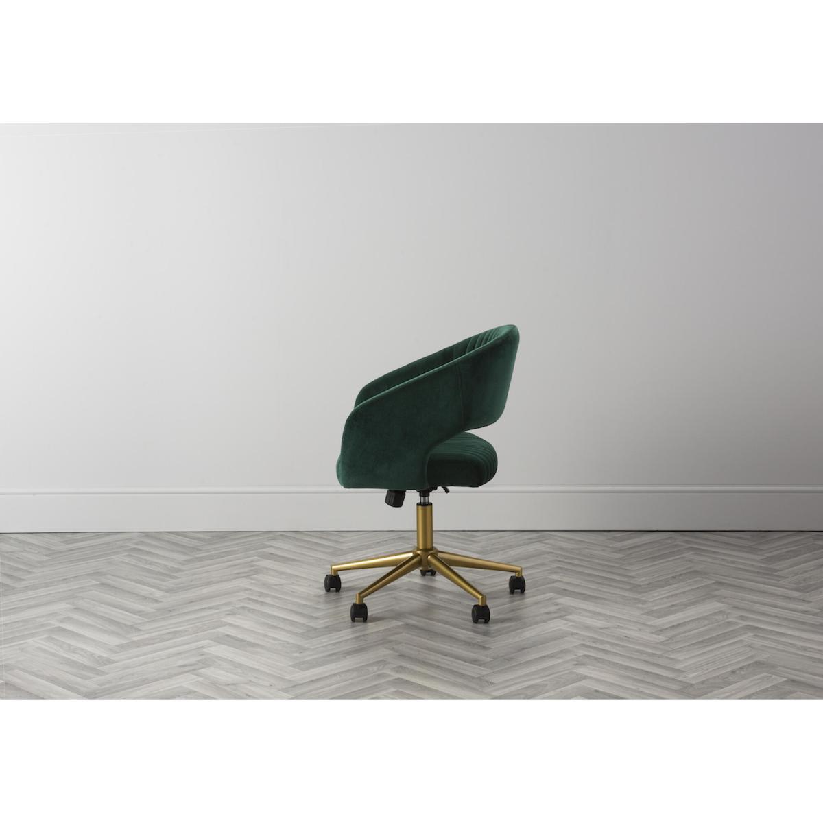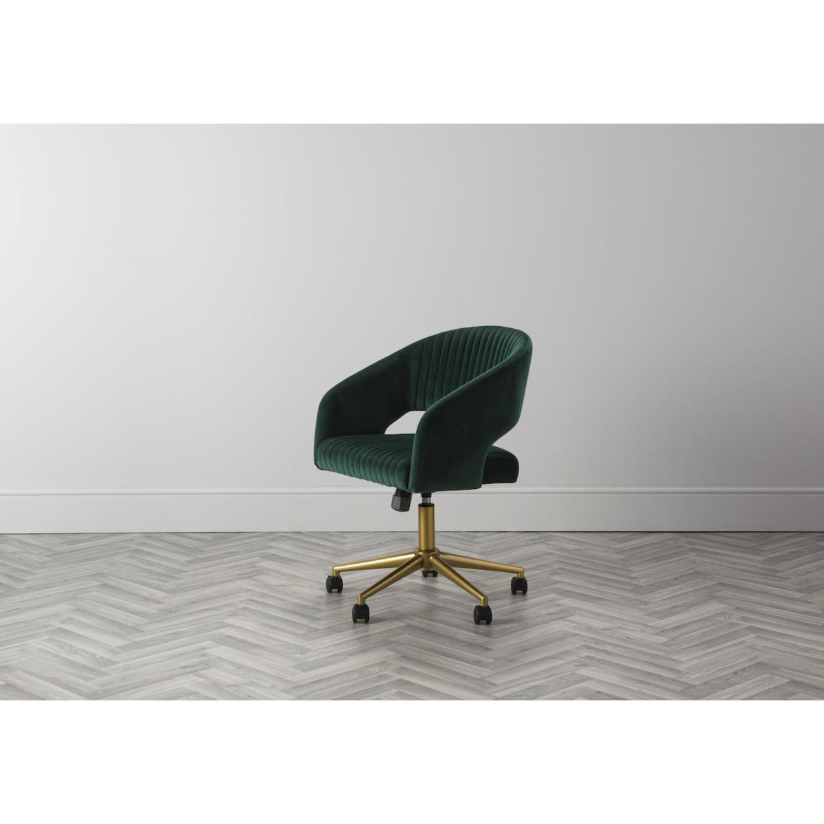 I love this office chair because of its rich, velvet upholstery that instantly elevates any workspace with a touch of luxury. The vibrant green hue makes it a statement piece, perfect for adding colour to neutral-toned interiors or complementing a bold, eclectic look. It works particularly well in contemporary or mid-century styled offices, but can also add a splash of sophistication to more traditional interiors when paired with brass or dark wood accents. For styling tips, try positioning it alongside sleek metal desks or vintage-inspired furniture to create a balanced and inviting workspace. Its swivel feature adds practical comfort, making it as stylish as it is functional.