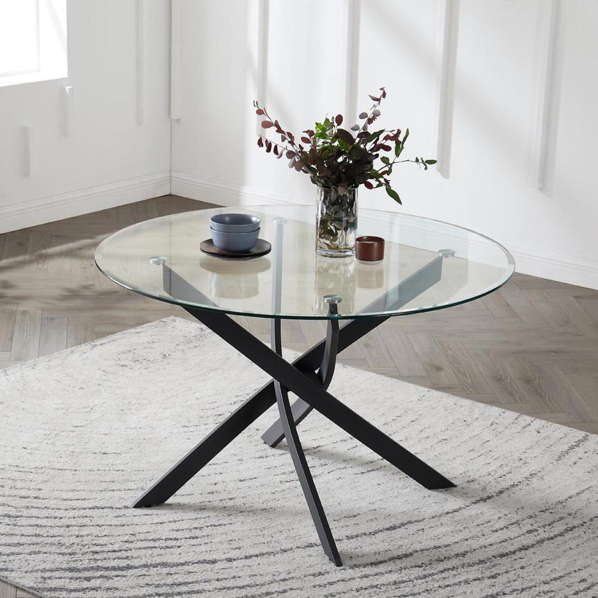 We are introducing the Nice dining table set. Nice has a round clear tempered glass tabletop available in 100cm diameter size, suitable for up to 4 people, and 120cm diameter size ideal for up to 6 people and features stunning twisted star-shaped black legs. Glass is a classic elegant look for any dining room as well as being durable, safe and easy to clean. The Lyon grey faux leather chair features diamond quilted stitch detailing on the backrest and seat, and with a sleek armless silhouette, it stands on black legs. Overall Dimensions: 4 Seater Table:W100cm x D100cm x H75cm / Weight Capacity 60kg 6 Seater Table:W120cm x D120cm x H75cm / Weight Capacity 60kg Chair (each): W42cm x D52cm x H98cm / Seat Width 42cm / Seat Depth 40.5cm / Seat Height 48cm / Back Height 45cm / Weight Capcity 150kg Package Dimensions: 4 Seater Table:Box 1 W111cm x D110cm x H6cm / Box 2 W106cm x D16cm x H11cm / Total Packaging Weight 30kg 4 Dining Chairs: Box 1 W110cm x D44cm x H19.5cm / Total Packaging Weight 19kg 6 Seater Table:Box 1 W130.5cm x D130cm x H6cm / Box 2 W128cm x D20cm x H11cm / Total Packaging Weight 40.8kg 6 Dining Chairs: Box 1 W110cm x D44cm x H27.5cm / Total Packaging Weight 27.7kg All sizes and weights are approximate, please allow for small variations. Delivered by our friendly couriers within 1-3 working days. The courier will deliver to the main door of the building only on an all-day 7 am to 7 pm service with no time slots provided.