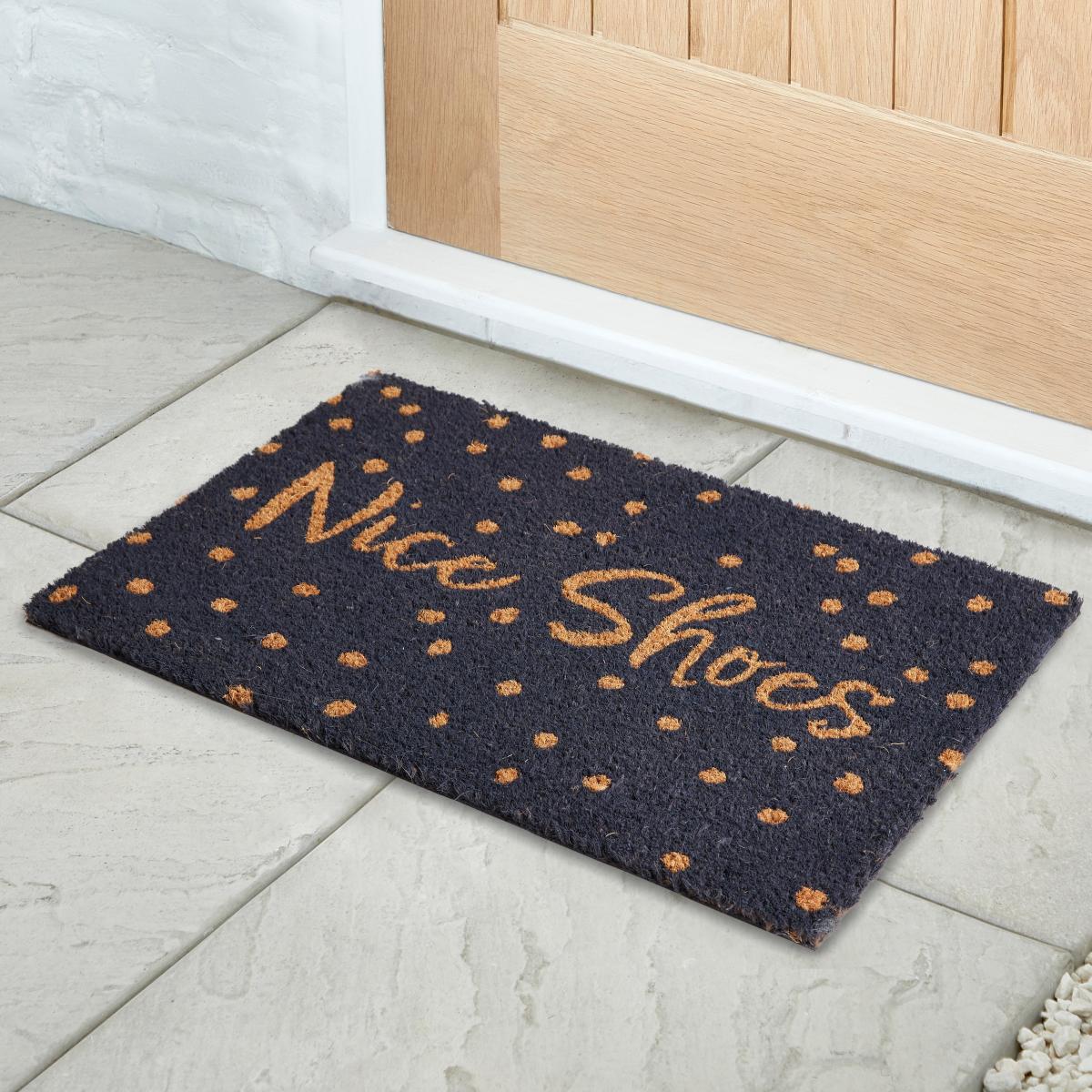 Add this simple and stylish doormat to your doorway with a ‘nice shoes’ catchphrase and dotted background. This sturdy doormat is practical under a covered entrance as the coir fibre properties are resistant to mold and mildew and the thick vinyl backing also creates an anti-slip effect. 5-year guarantee included.