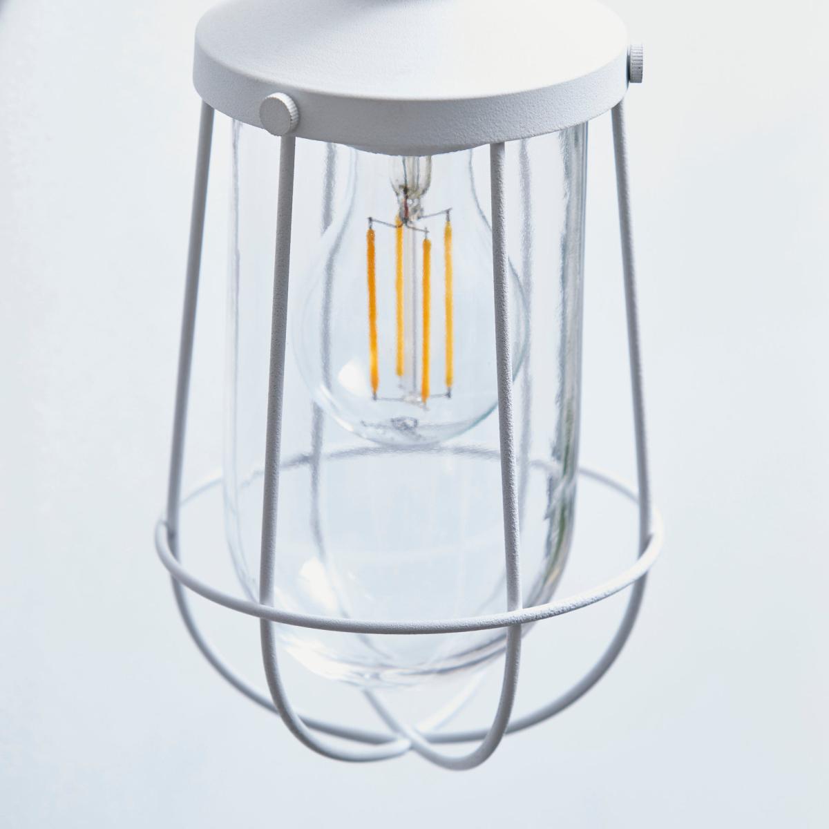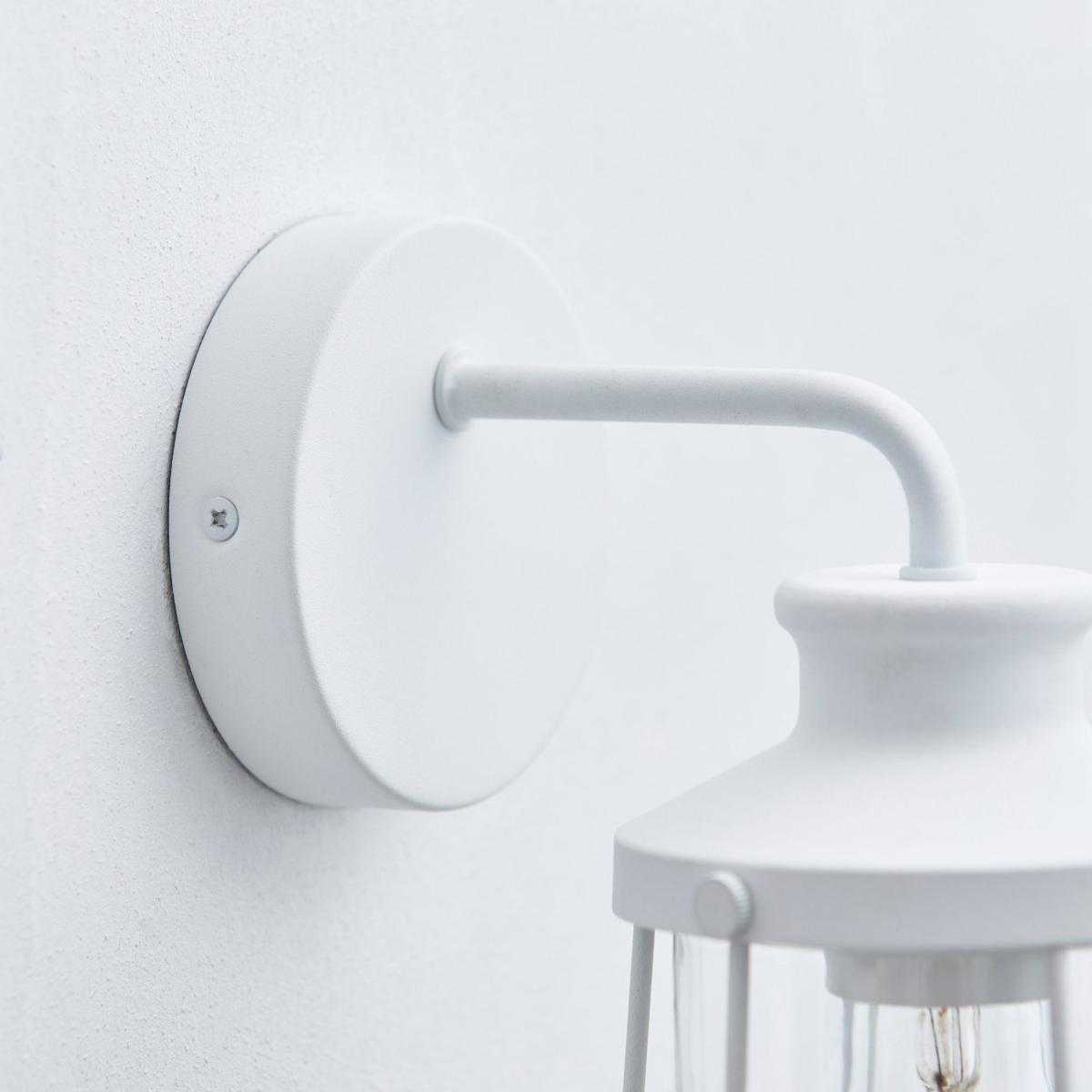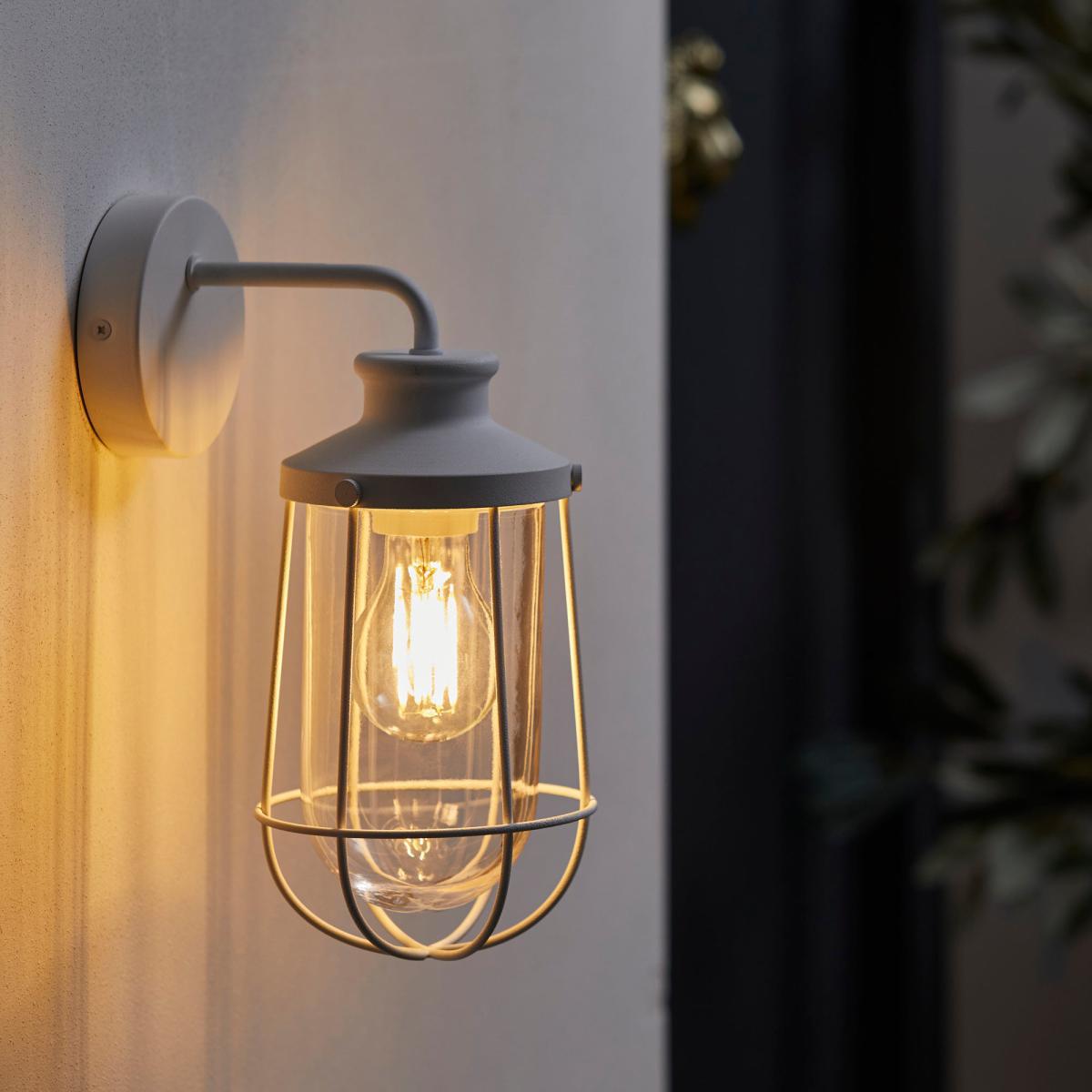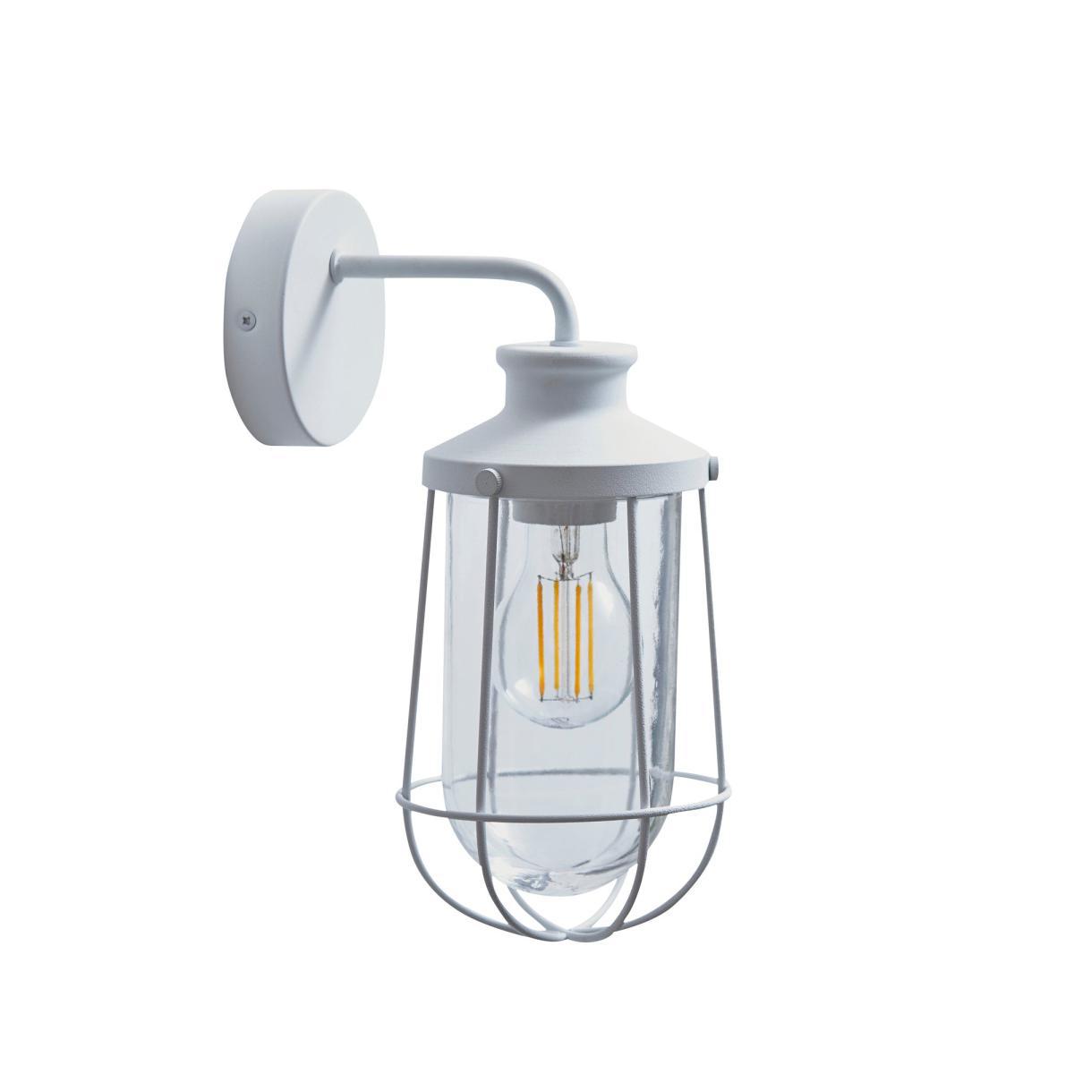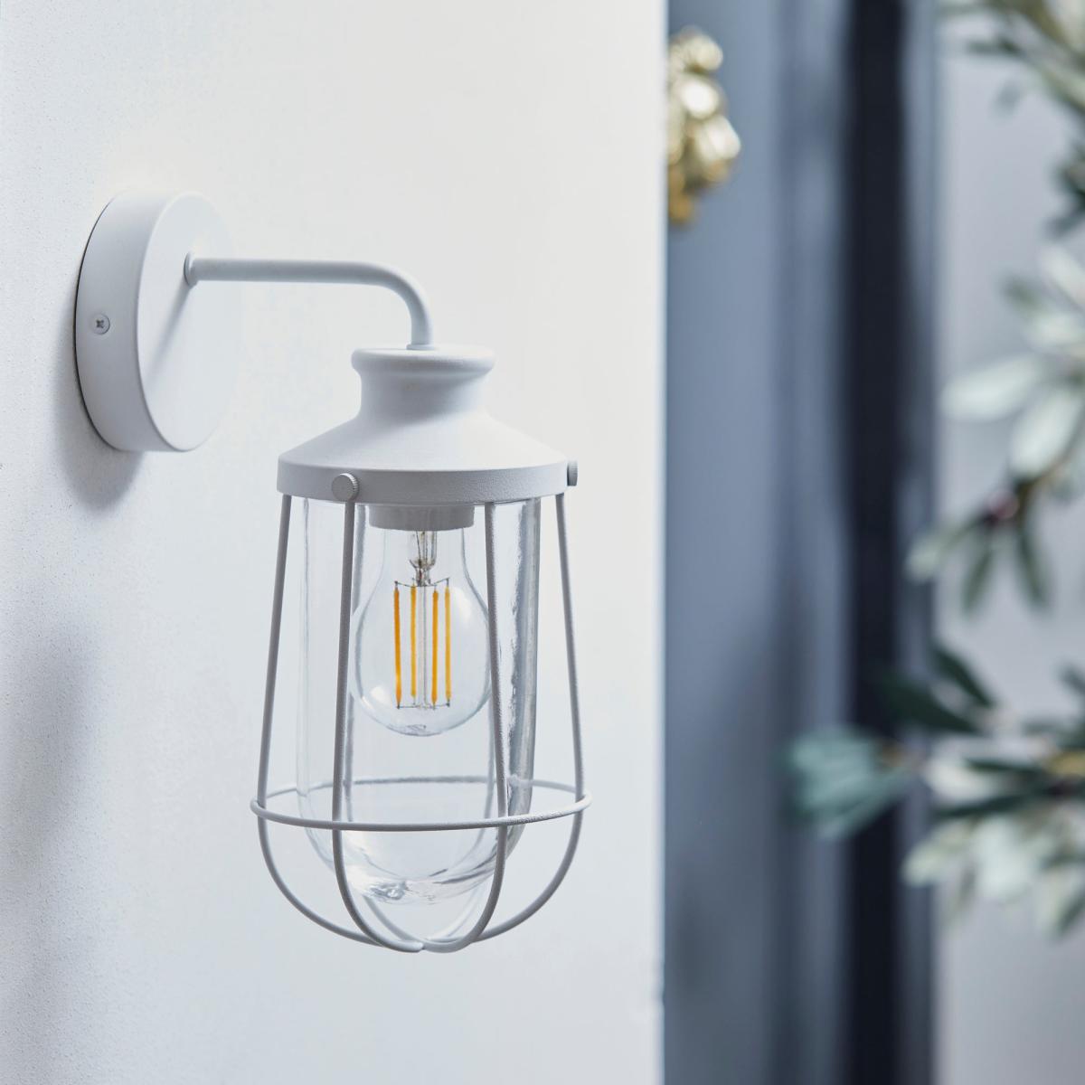 Designed in a modern industrial style, the Nichol outdoor wall light would bring a contemporary feel to any outdoor space. Finished in a white colourway with a clear glass and metal caged shade, this metal wall light is also suitable for indoor use as well, even in the bathroom thanks to the IP44 splash proof rating.