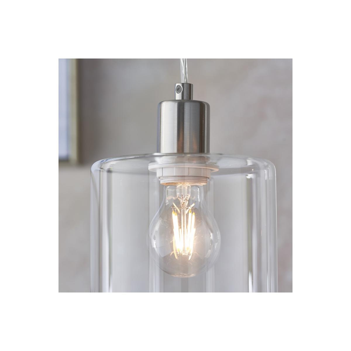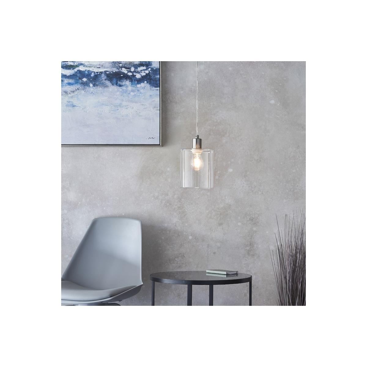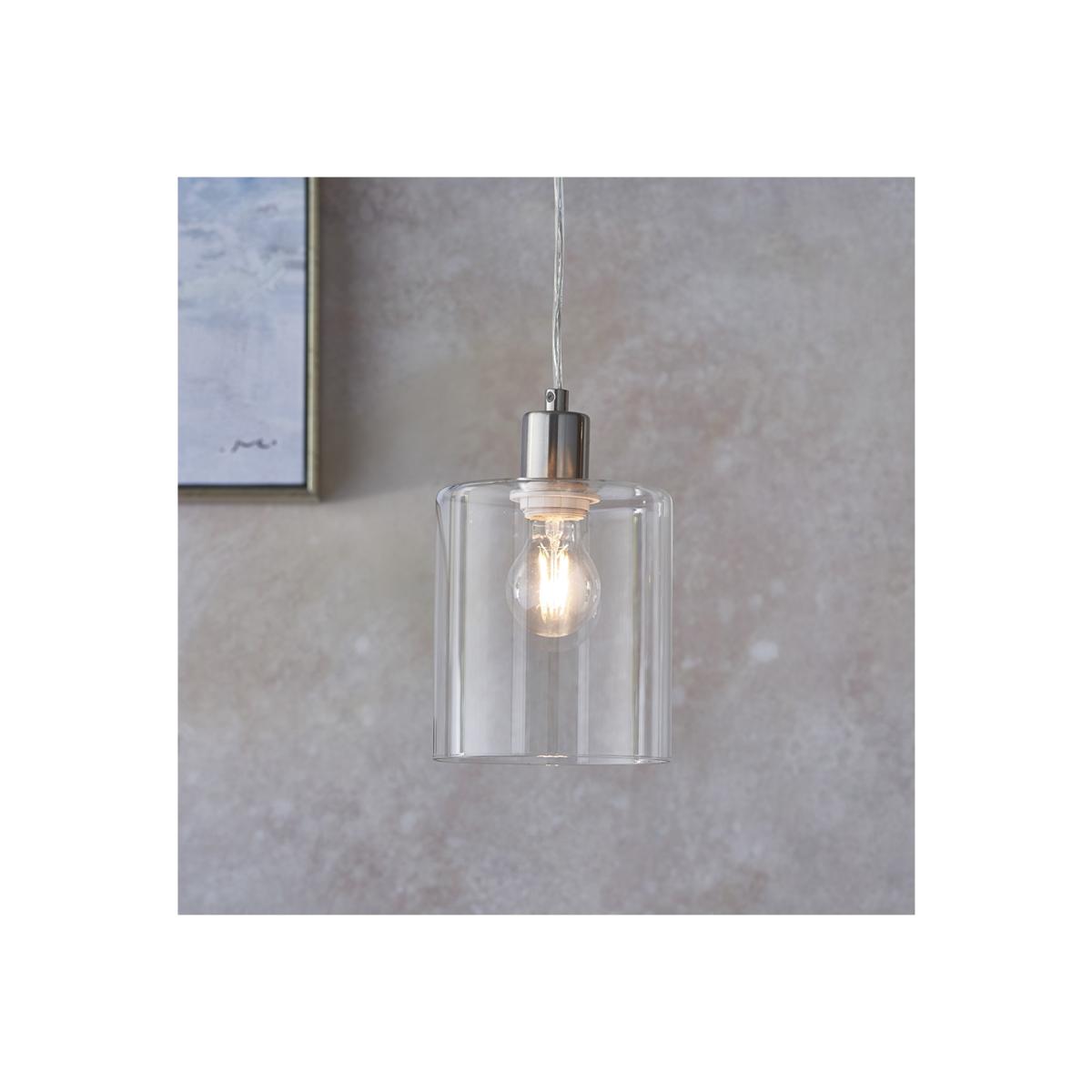 A modern pendant shade for contemporary interiors. Brushed nickel finish with clear glass shade.