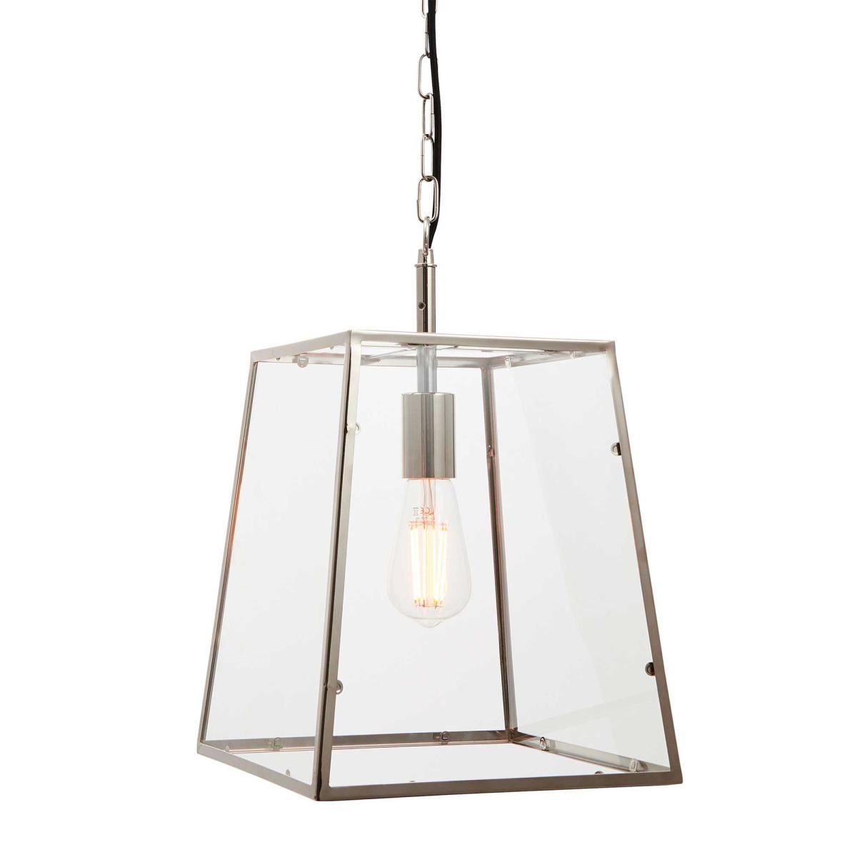 The Nickel Lantern Pendant takes its design inspiration from box lanterns and has the perfect style to complement many decoration schemes. The metal framework, chain and ceiling cap are finished in a fantastic bright nickel with clear glass panels providing a luxurious aesthetic. Place above a dinner table or in a hallway to add interest and a stunning warm glow.