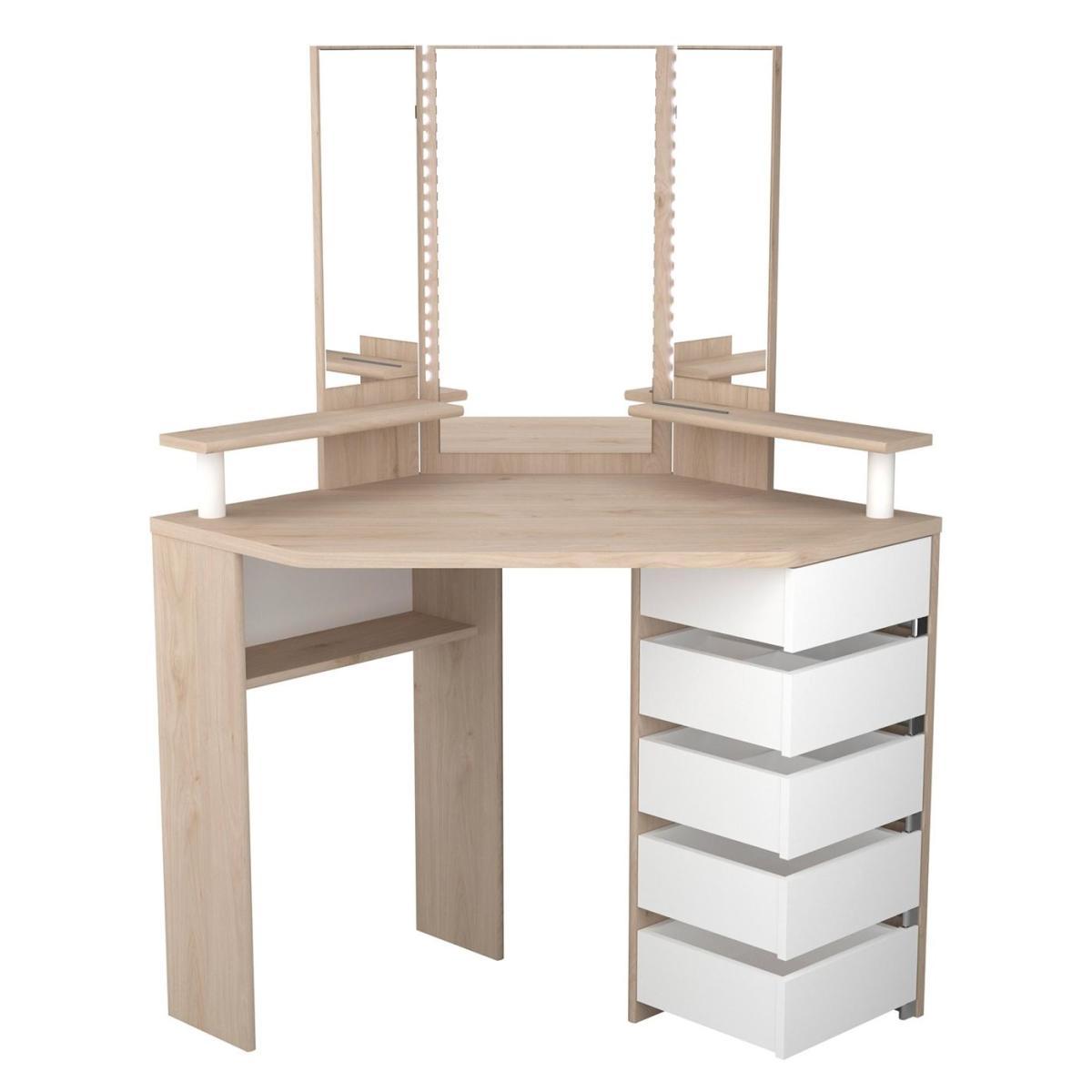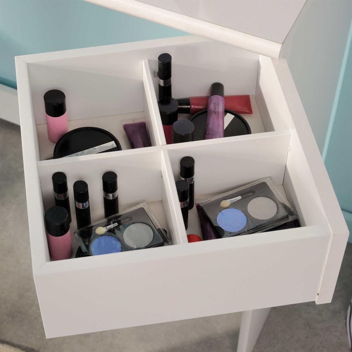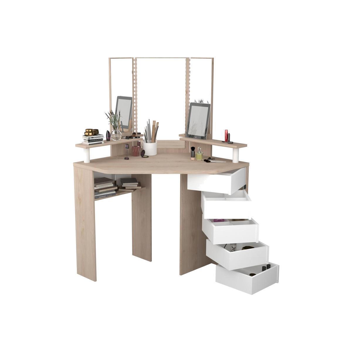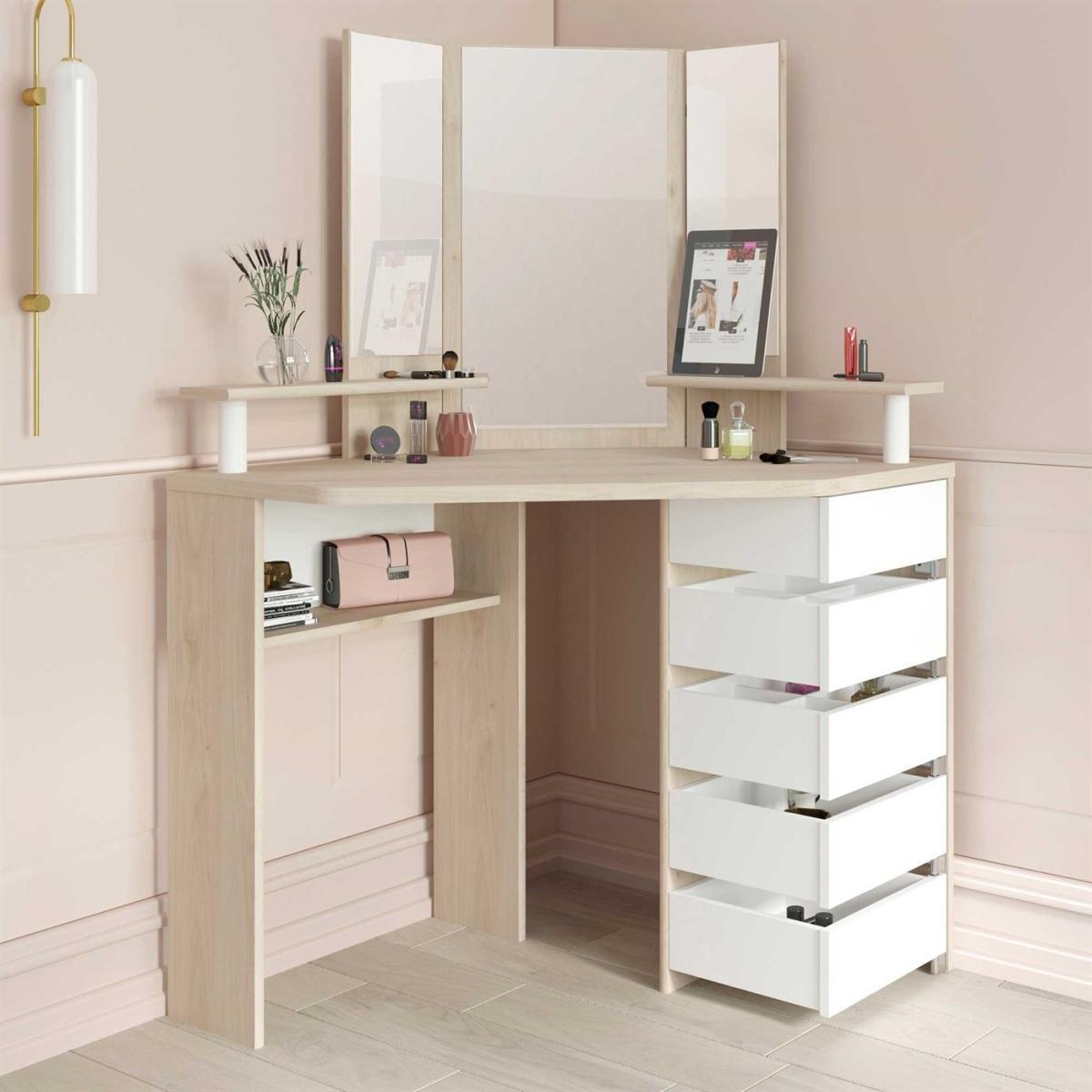 Design. Made to sit neatly in a corner the Nico beauty bar is stylish, practical and compact. The neutral white and oak finishes work effortlessly with most interior styles, featuring open shelves allowing you to style this adorable piece of furniture with the rest of the room. Designed with ample storage for organising make up and nick-nacks, and shelving to add personality and style. The triple mirrors with integrated LED lighting strips creates the perfect place for practicing the latest hair and make trends - every girls’ dream.