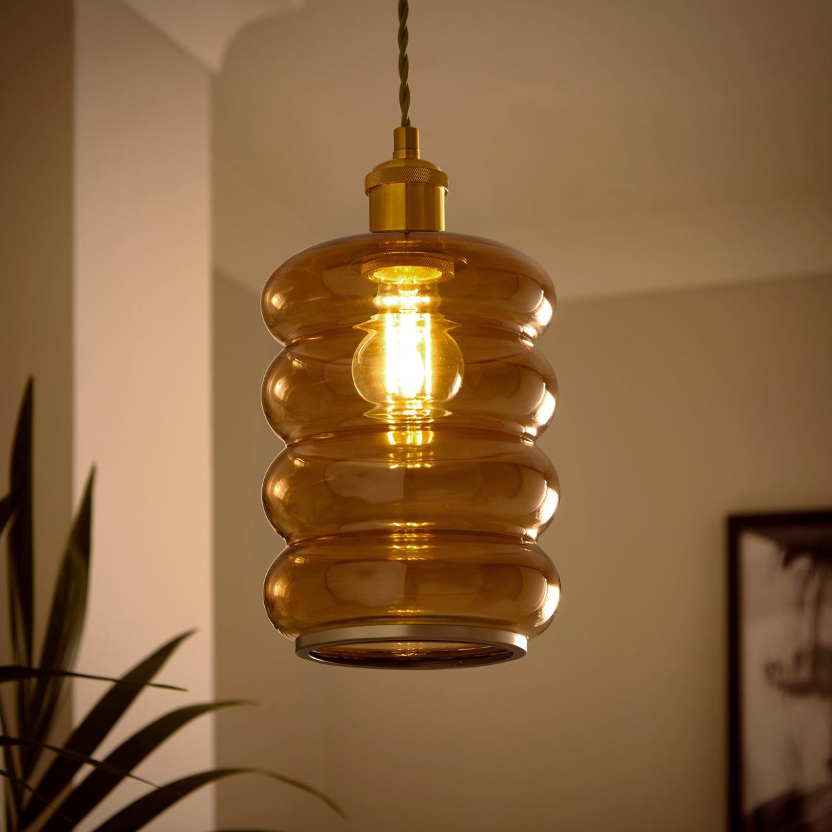 I love the ribbed pendant shade because of its distinctive textured design, which adds subtle visual interest without overwhelming the space. It works particularly well in modern or contemporary interiors, where its warm amber hue can complement brass or gold accents nicely. For styling tips, I recommend hanging it over dining tables or in cosy kitchen corners to create a welcoming glow. It also looks great in eclectic spaces paired with vintage or retro elements to emphasise its unique character. When styling, consider pairing it with simple, understated bulbs to keep the focus on its shape and finish, and keep the surrounding decor minimalist for maximum impact.