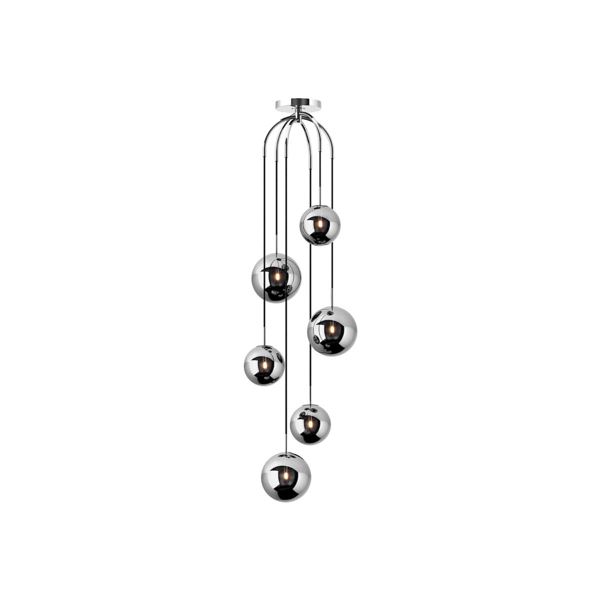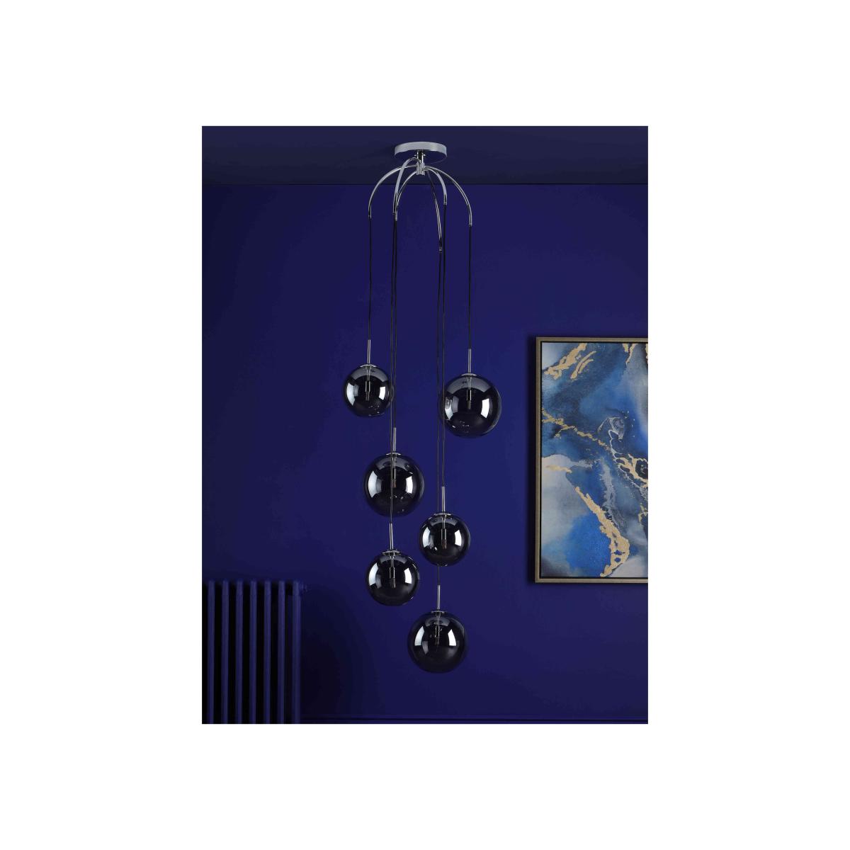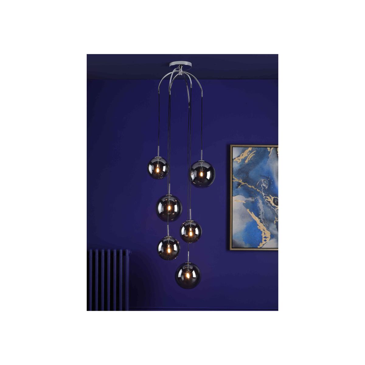In a high-ceilinged room or in a stairwell, this cluster pendant is beyond spectacular. Striking yet elegant, it features oversized smoked glass shades suspended from a chrome finished fitting. Why you'll love it Spectacular cascading cluster pendant light is the perfect centrepiece. Elegant modern style. Smoked glass shades are suspended from curved arms on black fabric cables. Polished chrome finish. Height adjustable on installation. This cluster pendant light is part of the Furniture Village accessories collection. What you need to know Made of metal with glass shades. Requires 6 x 33W G9 bulbs, not supplied. Professional installation advised. Dimensions Height: 300 cm (119 in). Depth: 52 cm (21 in). Width: 52 cm (21 in).