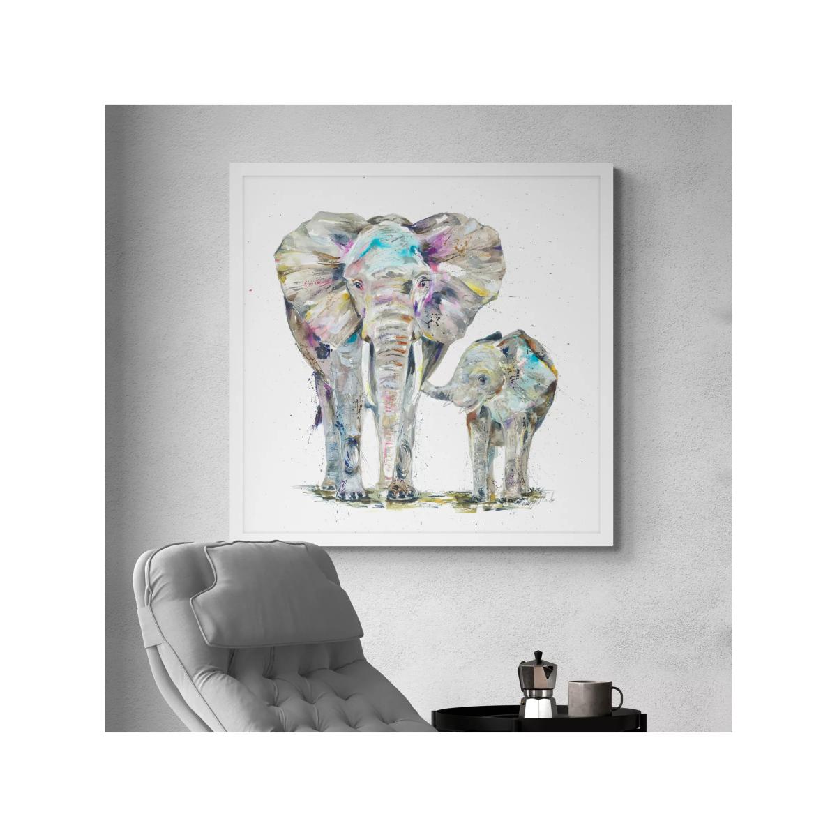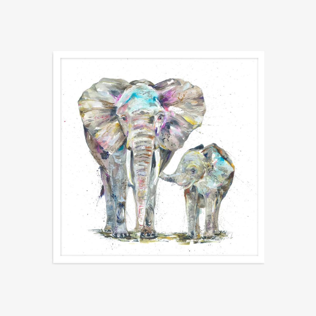 'Elephant & Baby' by artist Nicola Jane Rowles. Made in the UK, this unglazed print is presented in a matt-finish frame, ready to hang on your wall. Living in Cornwall on the edge of Bodmin moor and near to the coast, Nicola Jane Rowles is surrounded by beauty and nature. Nicola's studio and home gallery has views to Dartmoor over rolling fields, the home of animals, fur and feather, small and large giving her a wealth of inspiration. Nicola loves to create interesting paintings with movement and vibrancy using a mixture of inks and watercolour, letting the paintwork create beautiful natural marks and patterns. Have you thought about wall hooks and fittings?