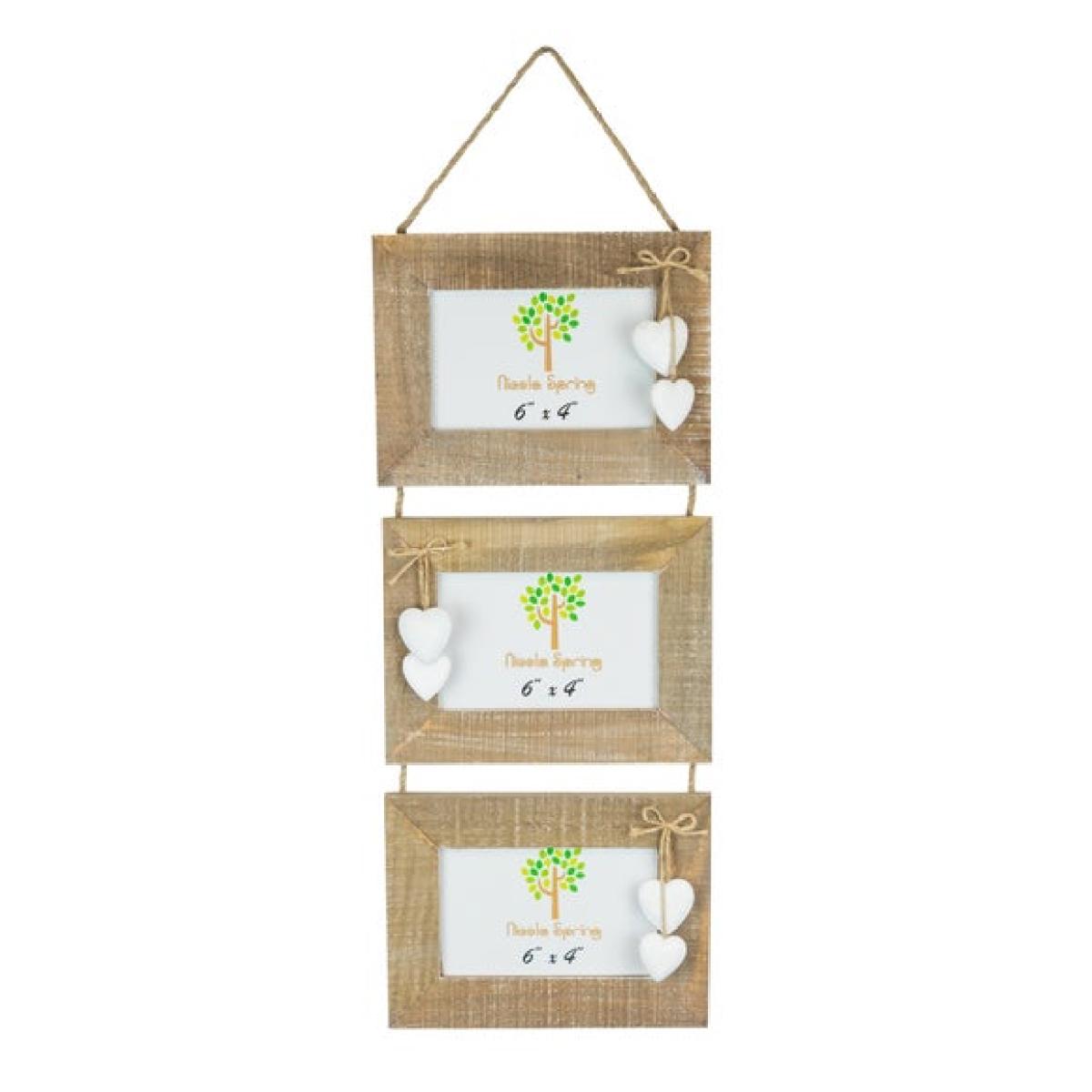 * Holds three rectangular photos * White heart detail above each frame * Vertical hanging layout A thoughtful way to display three favourite memories, this Nicola Spring triple hanging frame brings a soft touch to your wall. Each rectangular frame features a white heart detail above the photo space, adding a gentle decorative finish. Linked vertically with rustic-style string, it’s easy to hang and reposition. Designed to hold one photo per frame, it’s ideal for showcasing family moments, holidays or keepsakes. Lightweight and versatile, it works well in bedrooms, hallways or living spaces.