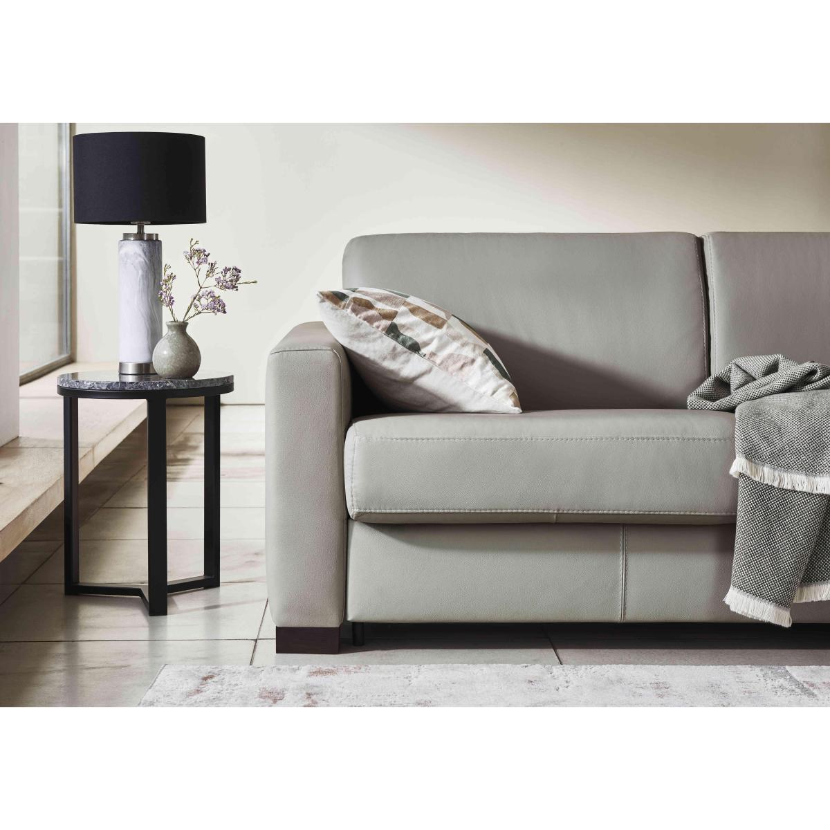 Say ‘saluti’ to Italian-made quality furniture with the Nicoletti Alcova range. With a big focus on simplicity and comfort, coming home to the Alcova is like coming home to an old friend – welcoming and warm. There’s plenty of choice on offer, from chairs to sofa beds, available in both 100% real leather and hardwearing fabric upholstery. You can even take your pick from three different arm styles, plus a huge range of colours to really make it your own. The Alcova range can do it all, from a contemporary centrepiece to a snuggly sofa bed, but there’s one thing that won’t change – the effortless Italian good looks. Handmade in Italy and exclusive to Furniture Village. This compact 2-seater leather sofa bed is the perfect sleep solution for when guests come to stay, with comfort that will keep your visitors rested and happy. Why you'll love it The versatility of this 2-seater leather sofa bed is the star of the show. Contemporary box arms that suit many interiors. Understated silhouette for a classy, minimalist aesthetic. Upholstered in 100% genuine leather. Choose from a range of stunning colours to suit your interior. Quickly and easily transforms into a sofa bed with a two-fold mechanism. Super-comfortable foam mattress won’t disappoint your guests. Features space-saving integrated pillow storage. Refined dark wood feet complete the look. Handcrafted in Italy, exclusively at Furniture Village. This 2-seater leather sofa bed is part of the Nicoletti Alcova range. What you need to know Soft yet supportive medium comfort level. Seat and back suspension: elastic webbing. Seat and back cushioning: padded ecological foam. Foam mattress depth: 12 cm. Leather has unique marks and characteristics with variance in colour and texture. Leather softens with use. Smoothing the tops of leather cushions prevents signs of visual comfort. Please read our upholstery care guide for more advice. This sofa bed is also available with slim arms and scroll arms.