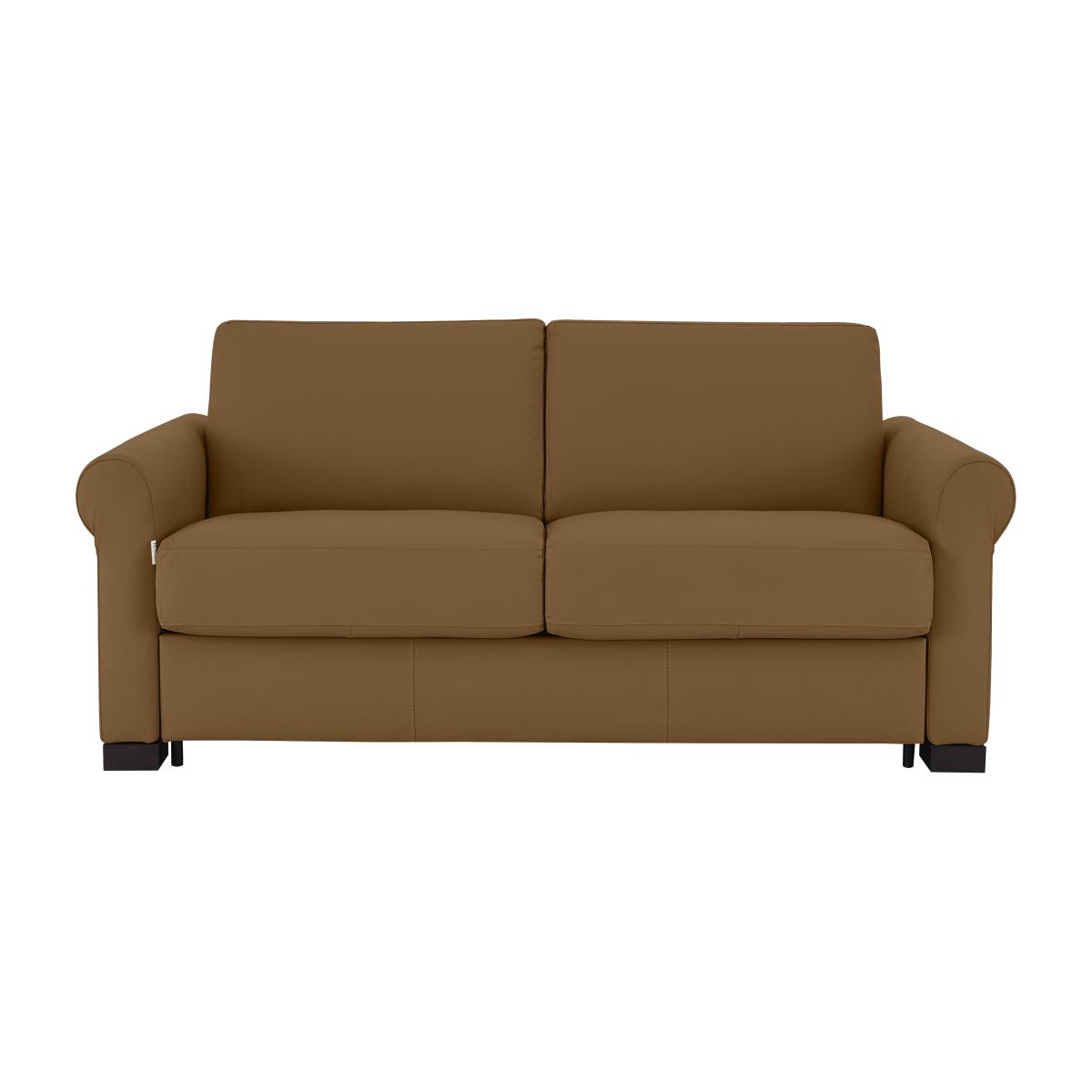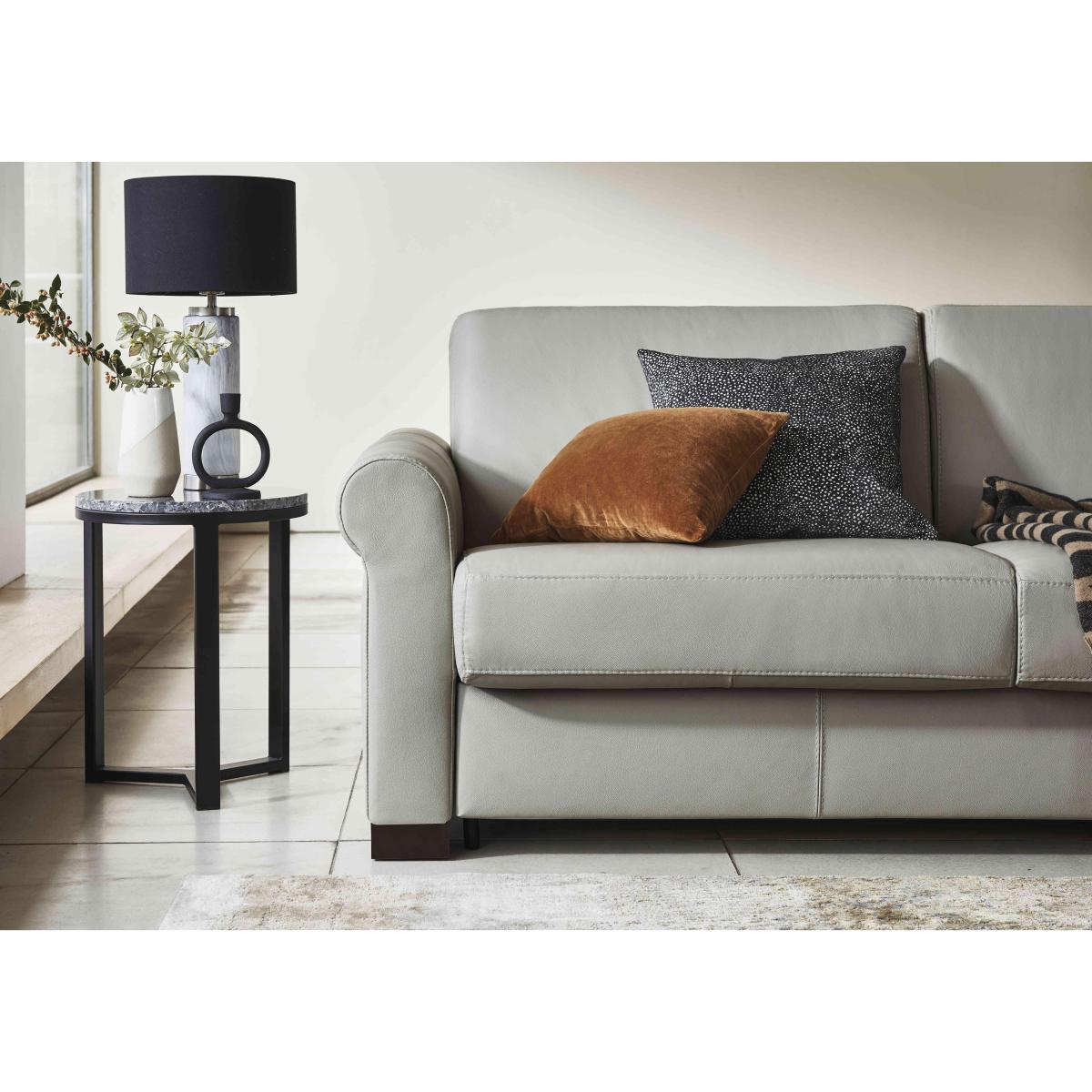 Say ‘saluti’ to Italian-made quality furniture with the Nicoletti Alcova range. With a big focus on simplicity and comfort, coming home to the Alcova is like coming home to an old friend – welcoming and warm. There’s plenty of choice on offer, from chairs to sofa beds, available in both 100% real leather and hardwearing fabric upholstery. You can even take your pick from three different arm styles, plus a huge range of colours to really make it your own. The Alcova range can do it all, from a contemporary centrepiece to a snuggly sofa bed, but there’s one thing that won’t change – the effortless Italian good looks. Handmade in Italy and exclusive to Furniture Village. Maximise your space with this 2-seater leather sofa bed and give your guests a comfy bed for the night without sacrificing style. Why you'll love it Effortless Italian good looks make this 2-seater leather sofa bed a real showstopper. Timeless scroll arms for a traditional touch. Understated silhouette for a classy, minimalist aesthetic. Upholstered in 100% genuine leather. Choose from a range of stunning colours to suit your interior. Quickly and easily transforms into a sofa bed with a two-fold mechanism. Super-comfortable foam mattress won’t disappoint your guests. Features space-saving integrated pillow storage. Dark wood feet round off the modern look. Handcrafted in Italy, exclusively at Furniture Village. This 2-seater leather sofa bed is part of the Nicoletti Alcova range. What you need to know Soft yet supportive medium comfort level. Seat and back suspension: elastic webbing. Seat and back cushioning: padded ecological foam. Foam mattress depth: 12 cm. Leather has unique marks and characteristics with variance in colour and texture. Leather softens with use. Smoothing the tops of leather cushions prevents signs of visual comfort. Please read our upholstery care guide for more advice. This sofa bed is also available with slim arms and box arms.