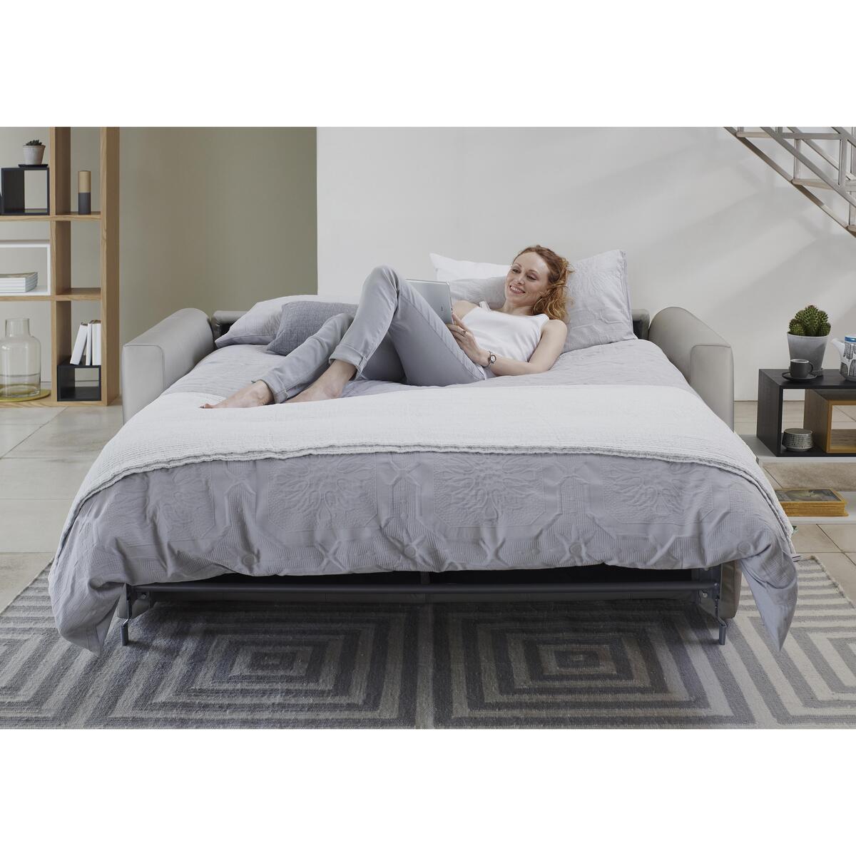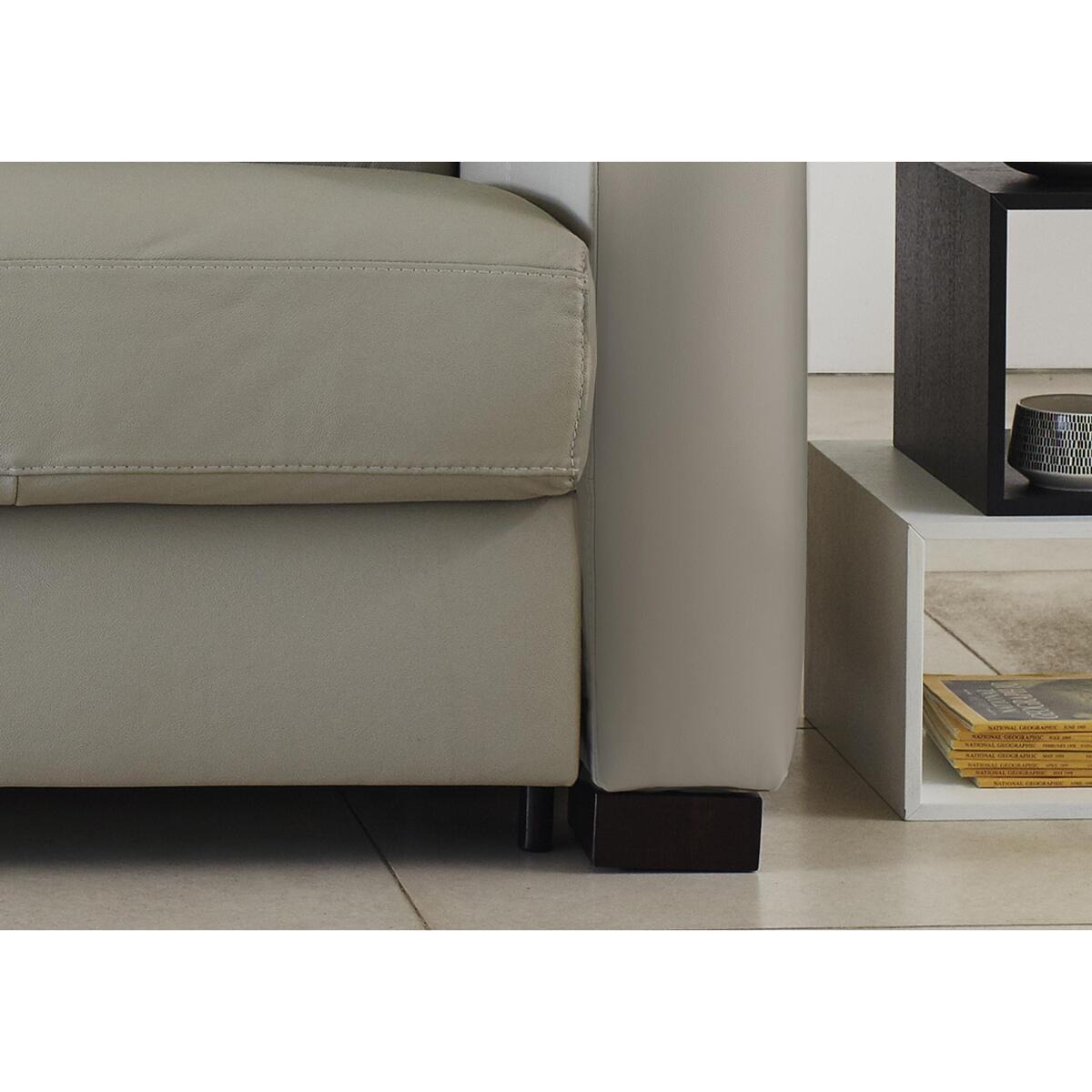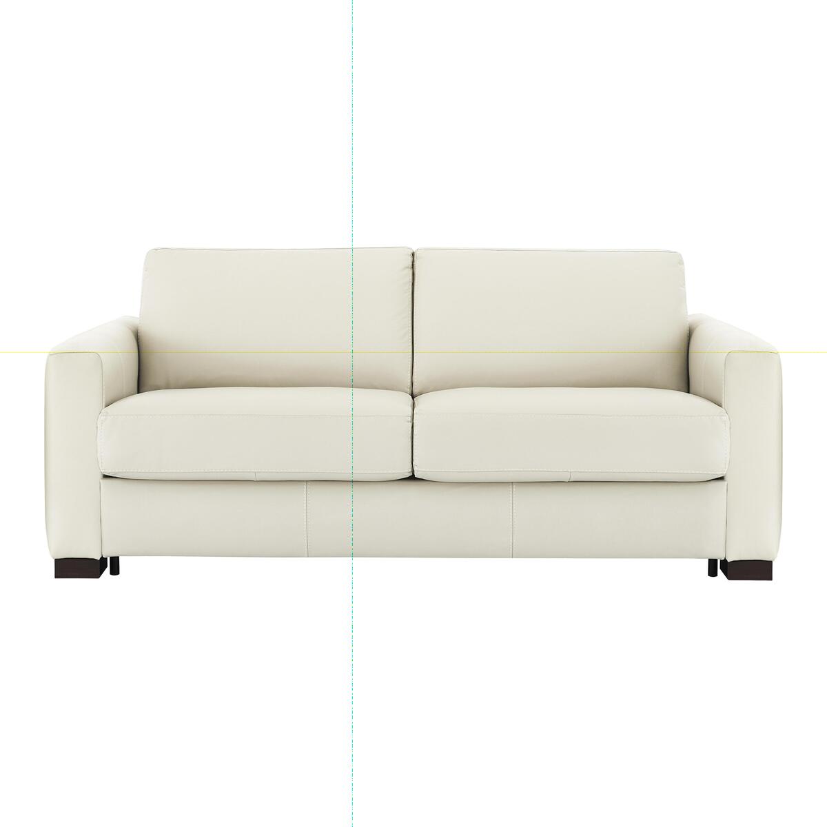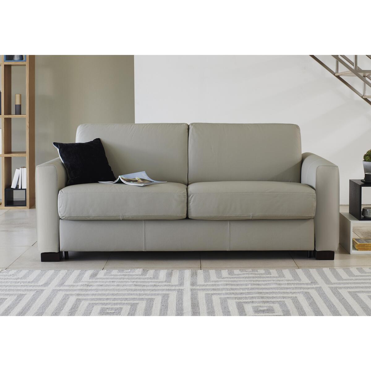 Italian-made, wonderfully comfortable large 3 seater sofa bed. Soft, family-friendly leather upholstery in a range of colours. Simple, modern sofa with statement box arms that are removable. Supportive webbing suspension and foam cushions. Removable feet in a choice of colours. Ultra-comfortable foam mattress and integrated pillow storage. Mattress depth 13cm. Exclusive to Furniture Village