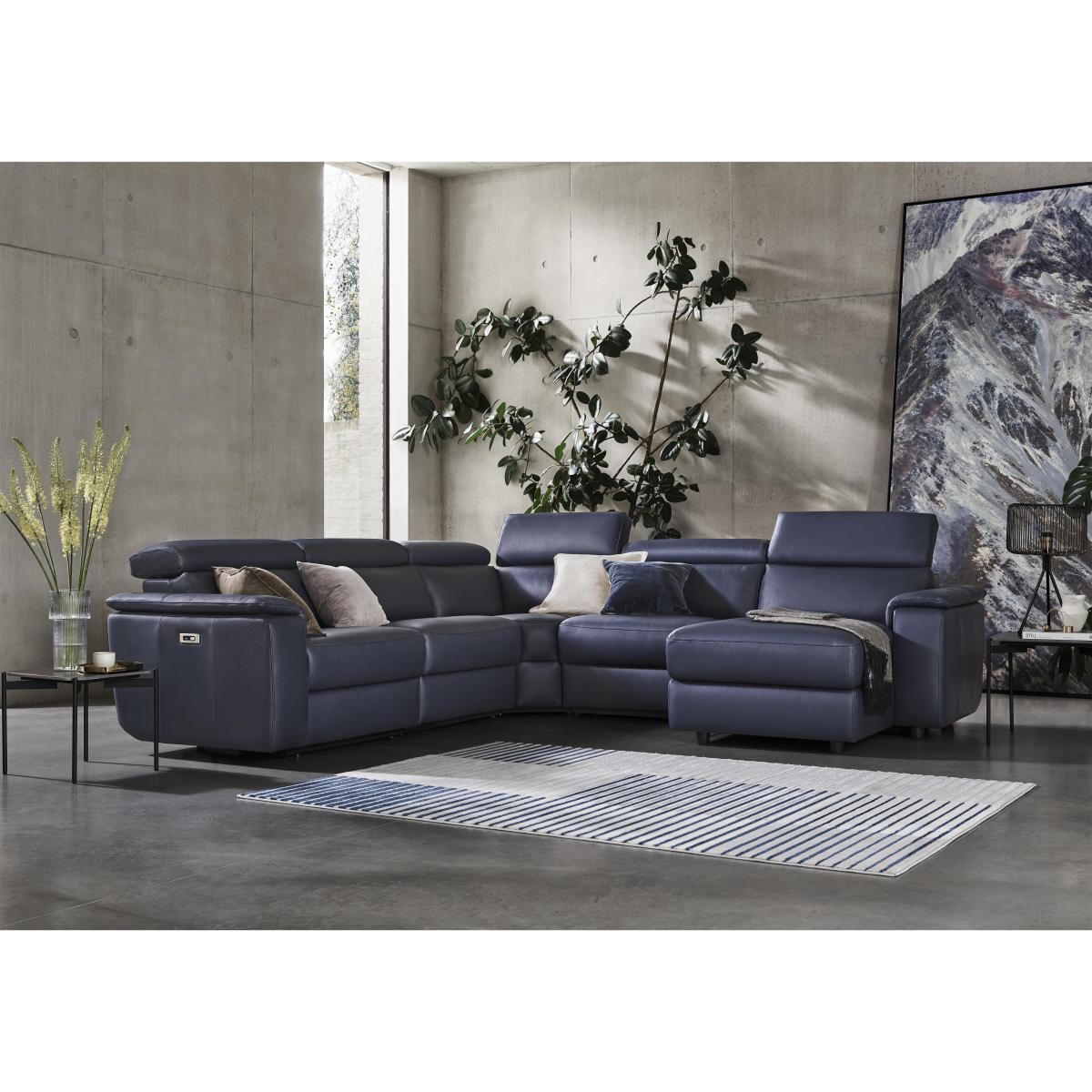 I love this corner sofa for its sleek, contemporary design and the rich Torello Blu leather, which adds a sophisticated touch to any living space. It works particularly well in modern or minimalist interiors, providing ample seating without overwhelming the room. Practical styling tips include pairing it with neutral or contrasting cushions to soften the look or layering with textured throws for added comfort. Its clean lines and generous size make it a versatile choice for open-plan living areas or family rooms, where both style and functionality are key. Keep accessories minimal for a streamlined feel, or add statement pieces to create a personalised, inviting atmosphere.