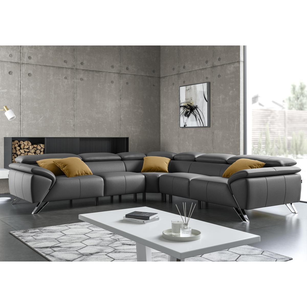 The Nicoletti Tesla range is everything a beautifully designed sofa should be: well-made, endlessly comfortable and easy on the eye. Boasting Nicoletti’s new and improved seat comfort, relaxing feels indulgent yet supportive – and that’s before you get to the adjustable headrests. They let you play with the height of your sofa while you find your perfect position and stretch out, courtesy of Nicoletti’s perfect positioning technology. As for style, it draws a decidedly modern silhouette with sleek, angled arms that finish in a striking metal leg. Available in a choice of plush fabric or 100% premium leather made from the finest South American hides. This range is handmade in Italy by master craftspeople exclusively for Furniture Village. Max your comfort with this elegant Nicoletti Tesla large leather corner sofa. Ultra-modern by design, it boasts a sleek silhouette and adjustable headrests for effortless relaxation the second you sit down. Why you'll love it. An ultra-modern large leather corner sofa for sophisticated urbanites who love indulgent comfort. Features Nicoletti’s new and improved seat comfort. 100% premium leather made from the finest South American hides. Stylish angled arms that finish in a striking metal leg. Nicoletti’s perfect position technology lets you create the best sit for you. Available in Nicoletti’s full catalogue of fabrics and colours. Handmade in Italy by master craftspeople. Exclusively available at Furniture Village. What you need to know. Medium comfort level. Seat suspension: Elastic webbing. Seat cushions: Foam with padding. Back cushions: Fibre. Leather has unique marks and characteristics with variance in colour and texture, and softens with use. Smoothing the cushioned top directly after use helps prevent ‘puddling’. Please read our upholstery care guide for more advice. Part of the Nicoletti Tesla collection.