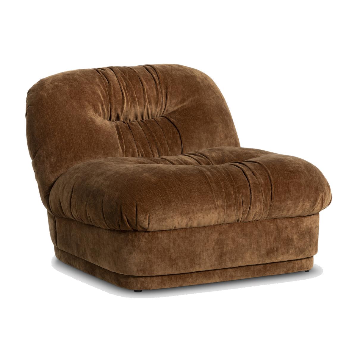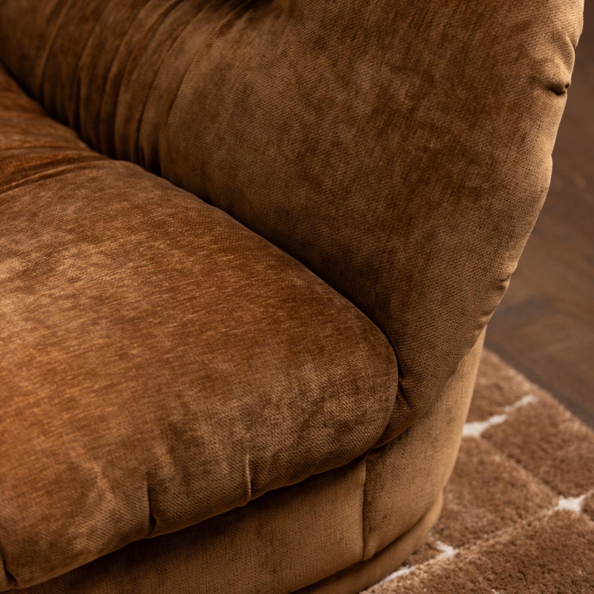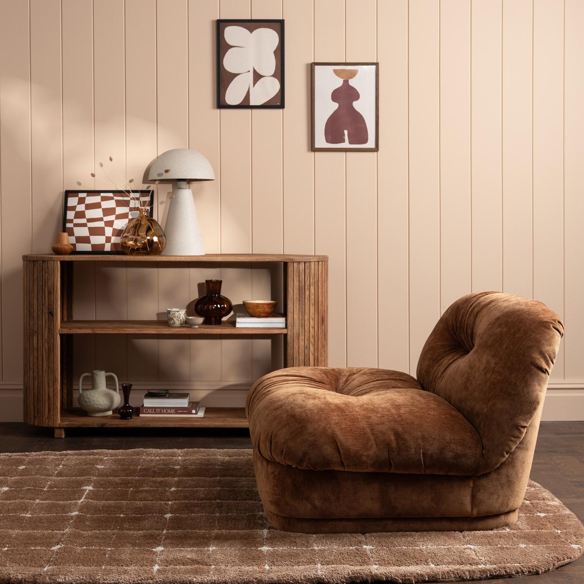 This Nicolo Brown Fabric Armchair offers a retro-inspired silhouette with modern-day comfort. Its low-slung profile, rounded edges, and tufted detailing create a relaxed and inviting seat. Upholstered in velvety fabric, it exudes warmth while adding a soft, tactile touch to your decor. The generously cushioned base and backrest provide cosy support, making it ideal for reading, lounging, or creating a laid-back corner. With its sculptural shape and versatile design, this chair works beautifully as a standalone piece or as part of a modular seating arrangement.
