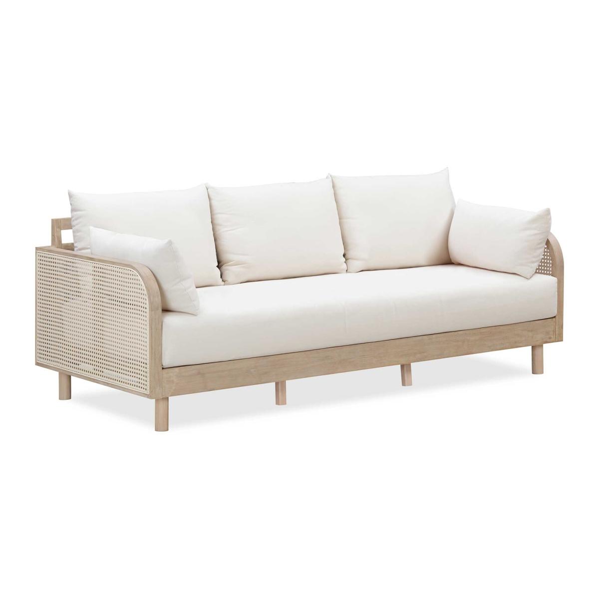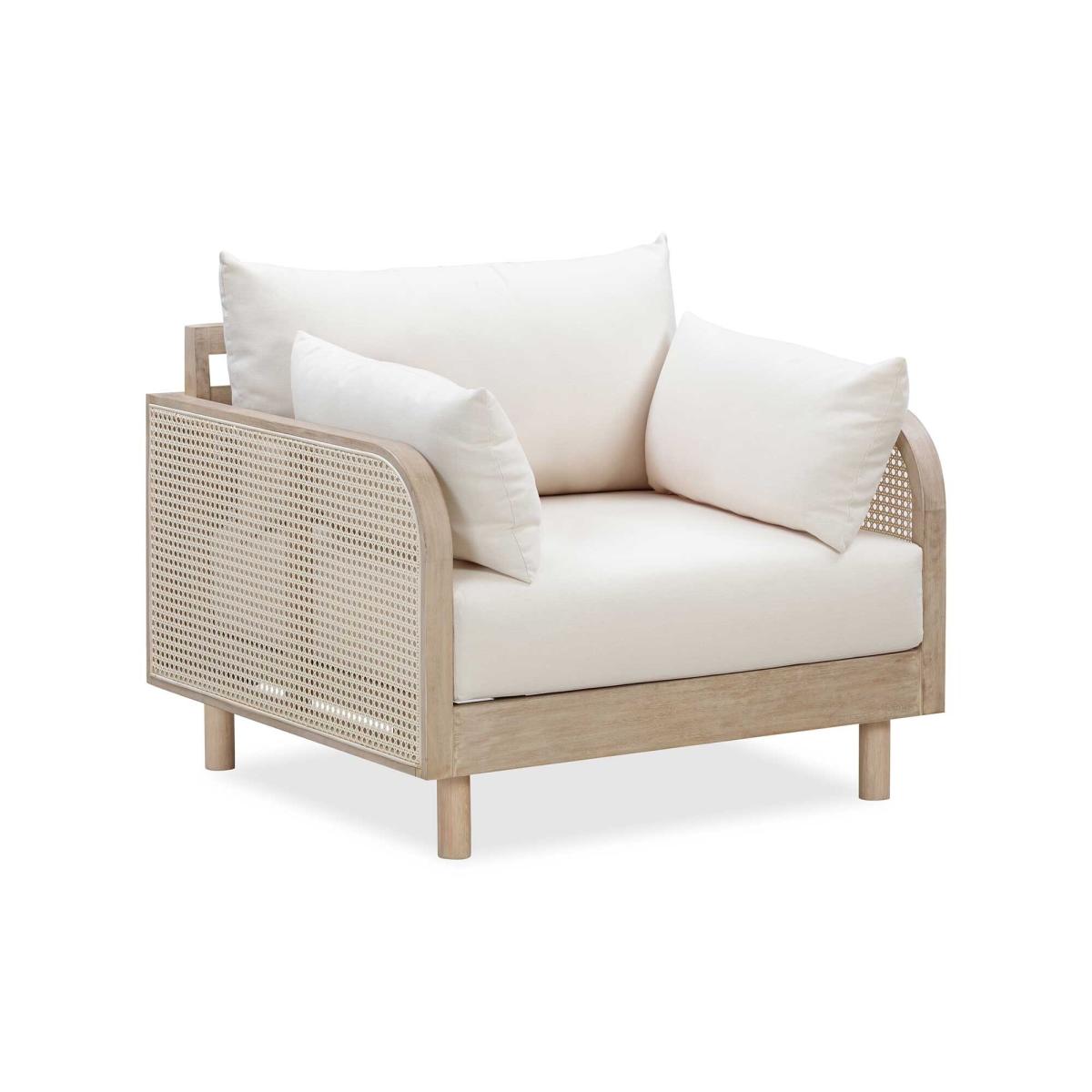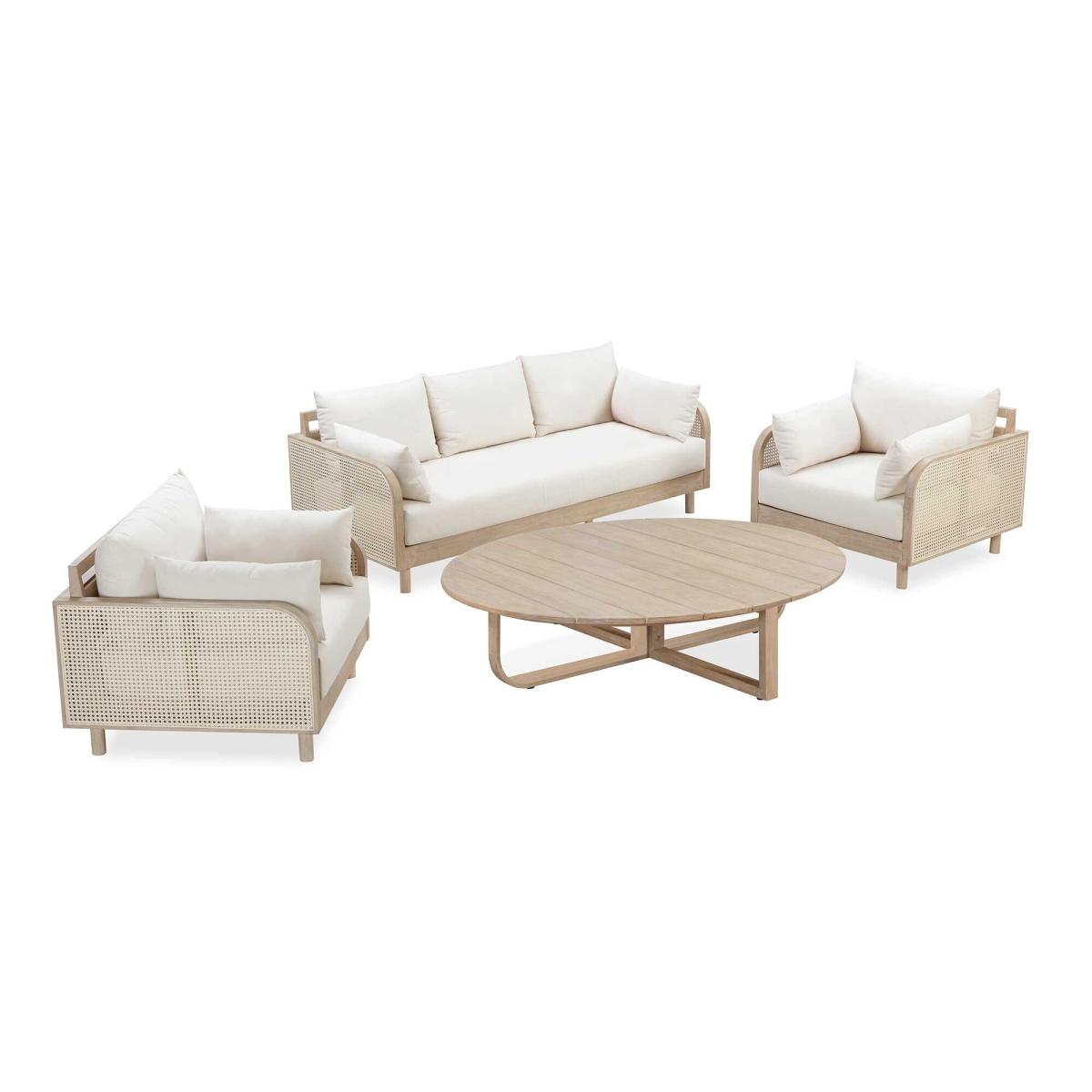 The Nicosia Natural Garden Lounge Set is a modern and uniquely designed outdoor sectional, featuring curved lines and thick shaped arms. With cream-colored cushions that complement the woven style, it exudes elegance. Crafted from high-quality materials, including a powder coated aluminium frame, it's durable for year-round use. Perfect for enjoying sunny days with family and friends, it offers both style and comfort on any patio. We recommend storing cushions inside overnight.