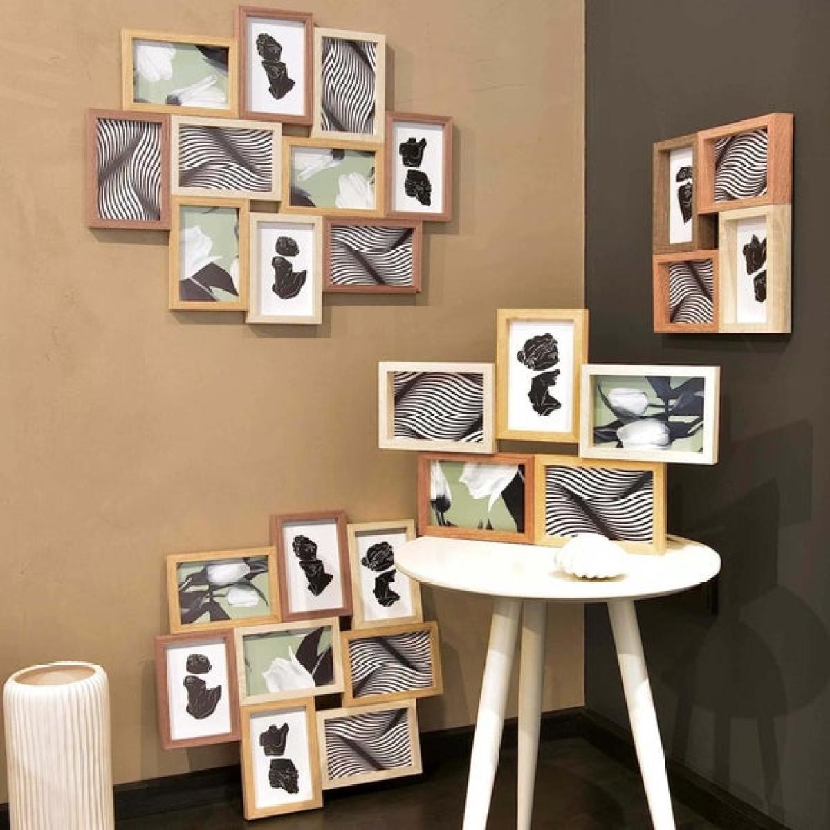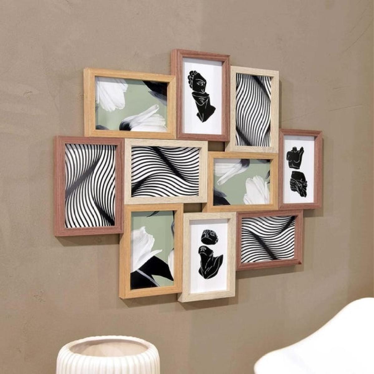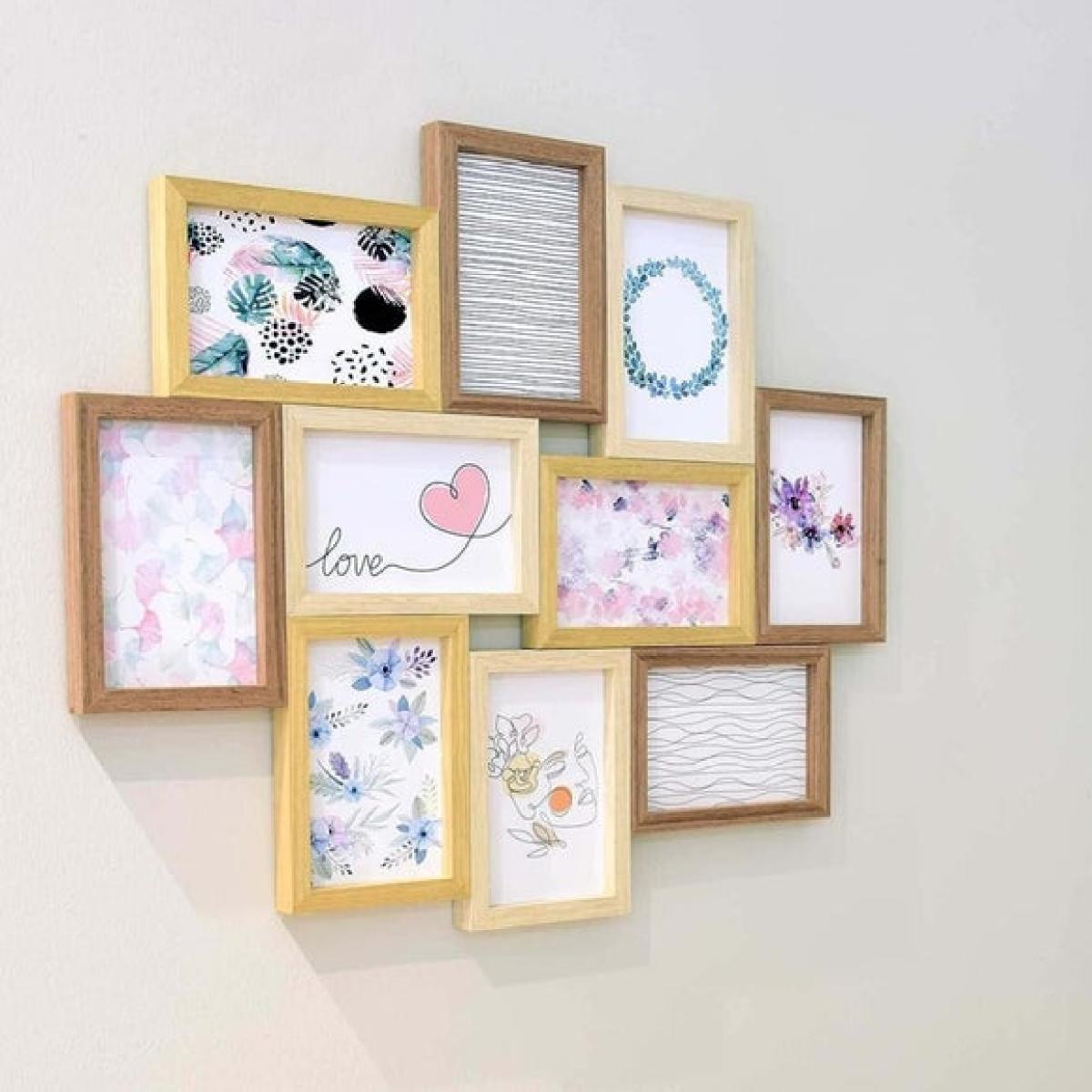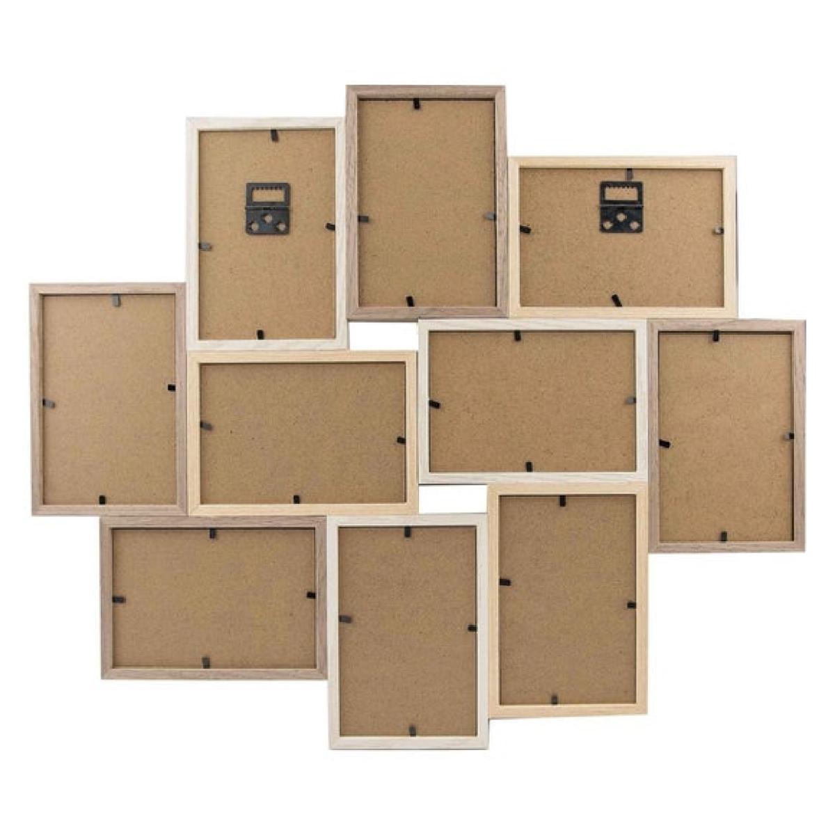 * Collage photo frames * Stylish wood * Synthetic glazing Tell your story in ten frames with this beautifully simple collage design, perfect for displaying wedding snaps, sunny getaways or everyday family moments. Crafted with a warm natural finish and lightweight wooden build, this frame makes a stylish statement while protecting your prints with clear synthetic glazing. Whether you hang it portrait or landscape, the included metal hanger makes the job easy – so you can enjoy your memories, all in one place.