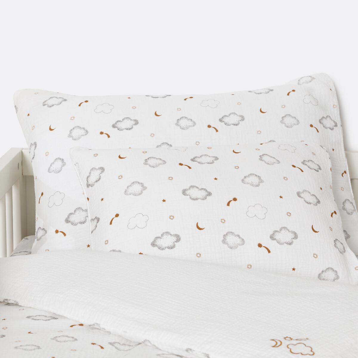 For sweet nights of dreaming, between clouds and shooting stars, the Nieva bed linen will gently accompany your baby. Created by La Redoute Interiors. Cotton muslin is light, supple and super soft. Delicately embossed, it does not require ironing. Product Details • 100% cotton, 135g/m2 • Cotton muslin • Both sides printed with clouds and shooting stars. As the seasons go by, add your own personal touch by mixing the Nieva range with our Kumla range in cotton muslin. Care Advice • Machine washable at 40°C • Product will regain its texture after tumble drying. Dimensions • 35 x 45cm : Rectangular pillowcase • 40 x 60cm: Rectangular pillowcase • OEKO-TEX® Standard 100. Standard 100 certification by OEKO-TEX® tests textile products for harmful substances via an independent, international label.