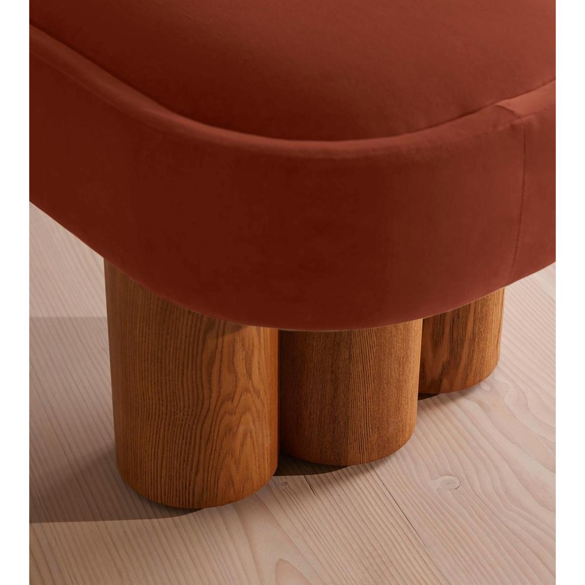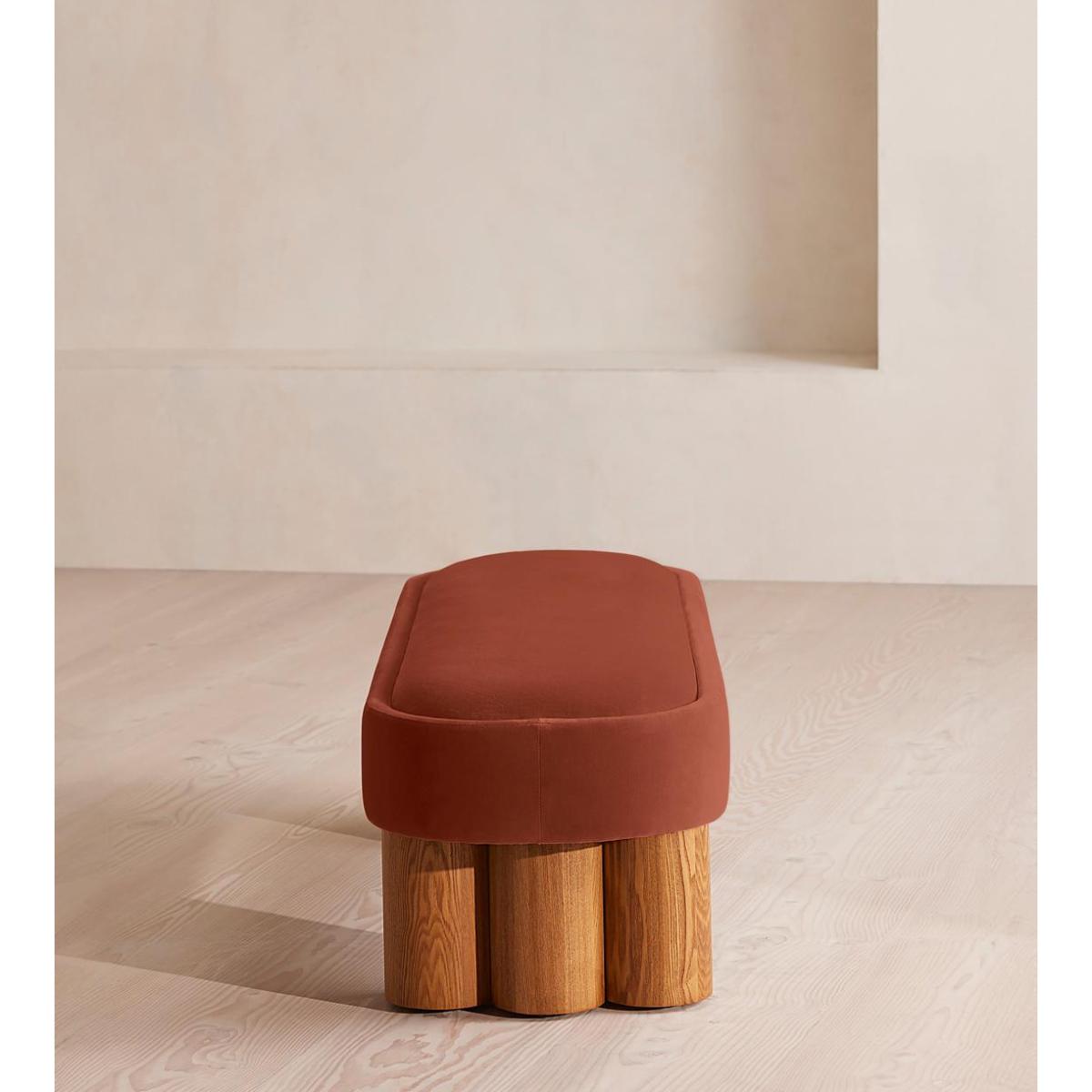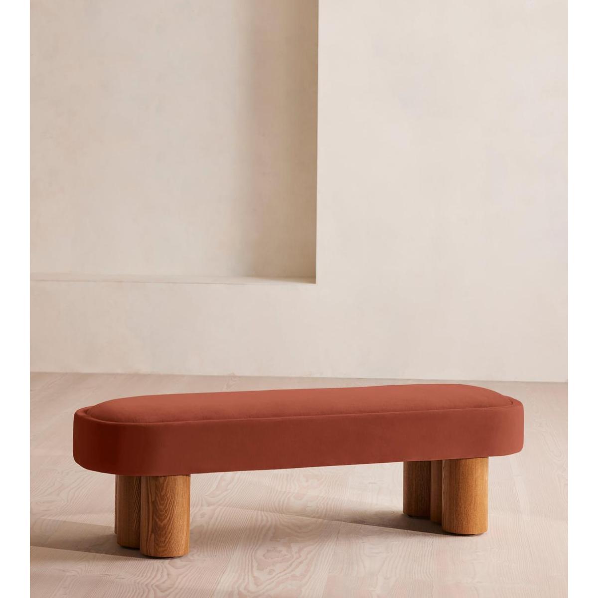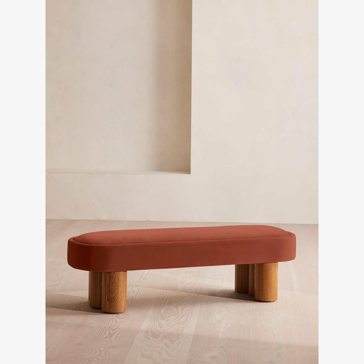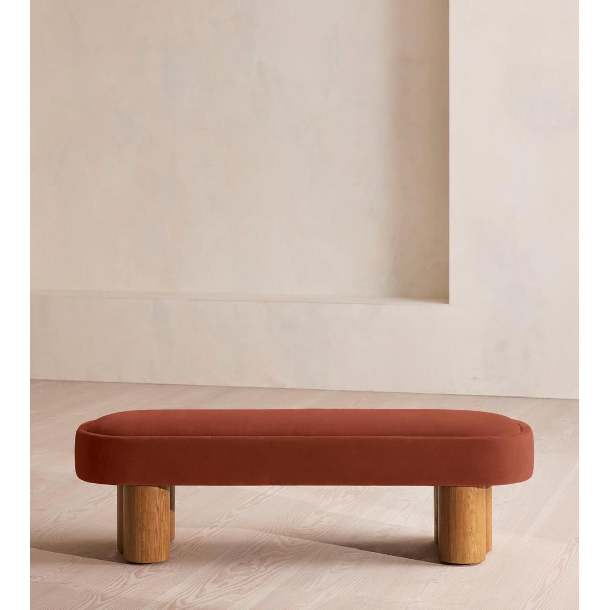 I’m a big fan of this rust velvet bench for its clean lines, soft finish and sculptural oak legs. The warm tone works equally well in contemporary, mid-century and Scandinavian-inspired rooms, pairing effortlessly with neutrals or deeper jewel colours to add depth without overpowering. I’d use it in an entrance hall with a folded throw and woven basket underneath for storage, or at the foot of the bed topped with a slim tray. In the living room, soften its look with a low-profile cushion and a small sheepskin draped over one end.