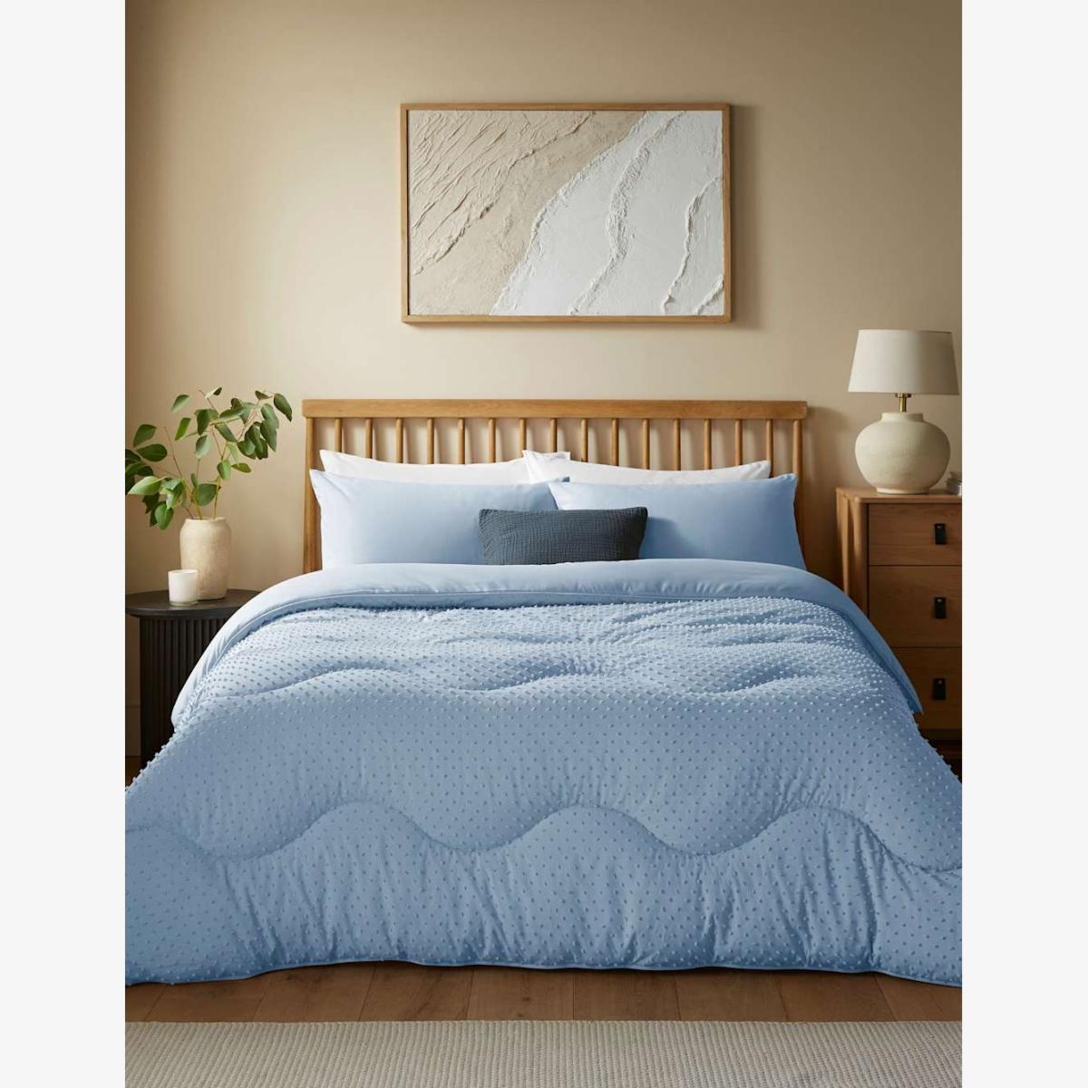 I love this light blue duvet for its soft, versatile look that works well in both contemporary and understated traditional interiors. The tufted dot design adds a subtle texture that provides visual interest without overwhelming a space, making it ideal for calmer bedrooms. It's perfect when layered with other neutral or pastel tones, and pairs well with materials like natural wood, linen, or woven accessories to create a cosy, inviting feel. Practical styling tips include pairing it with crisp white or grey pillowcases for contrast, and adding a textured throw or cushions to introduce depth. Because it's coverless, it’s also easy to shake out and clean, making it a practical choice for those who appreciate simplicity and elegance.