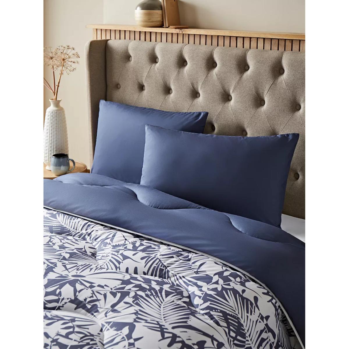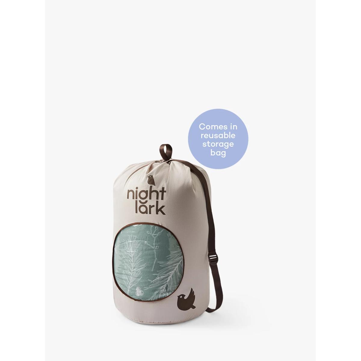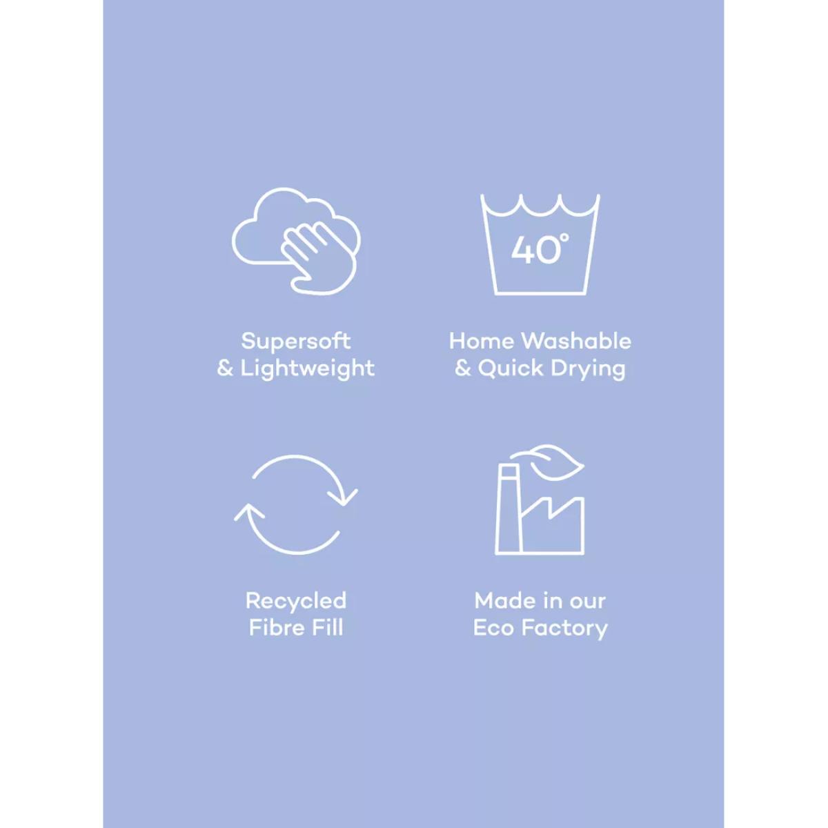 Experience an innovative bedding solution and take the hassle out of laundry and linen changes with the Night Lark® Coverless Duvet. This cosy duvet offers warmth without weight, and it's designed with an in-built, silky soft microfibre cover. It also comes in a handy reusable duffle bag. The soft Smartfil® filling is made from 100% recycled PET plastic bottles and it's both shape-retaining and ultra-washable. It's also quick-drying, so wash it at home and air or tumble dry it, and it will be back on your bed on the same day. The Winter Palms print on this coverless duvet is a soothing and simplistic design complete with palm shapes. Complete with co-ordinating pillowcases. The single includes one pillowcase and all other sizes include a pair Made in a B Corp™ certified European Eco Factory in Estonia