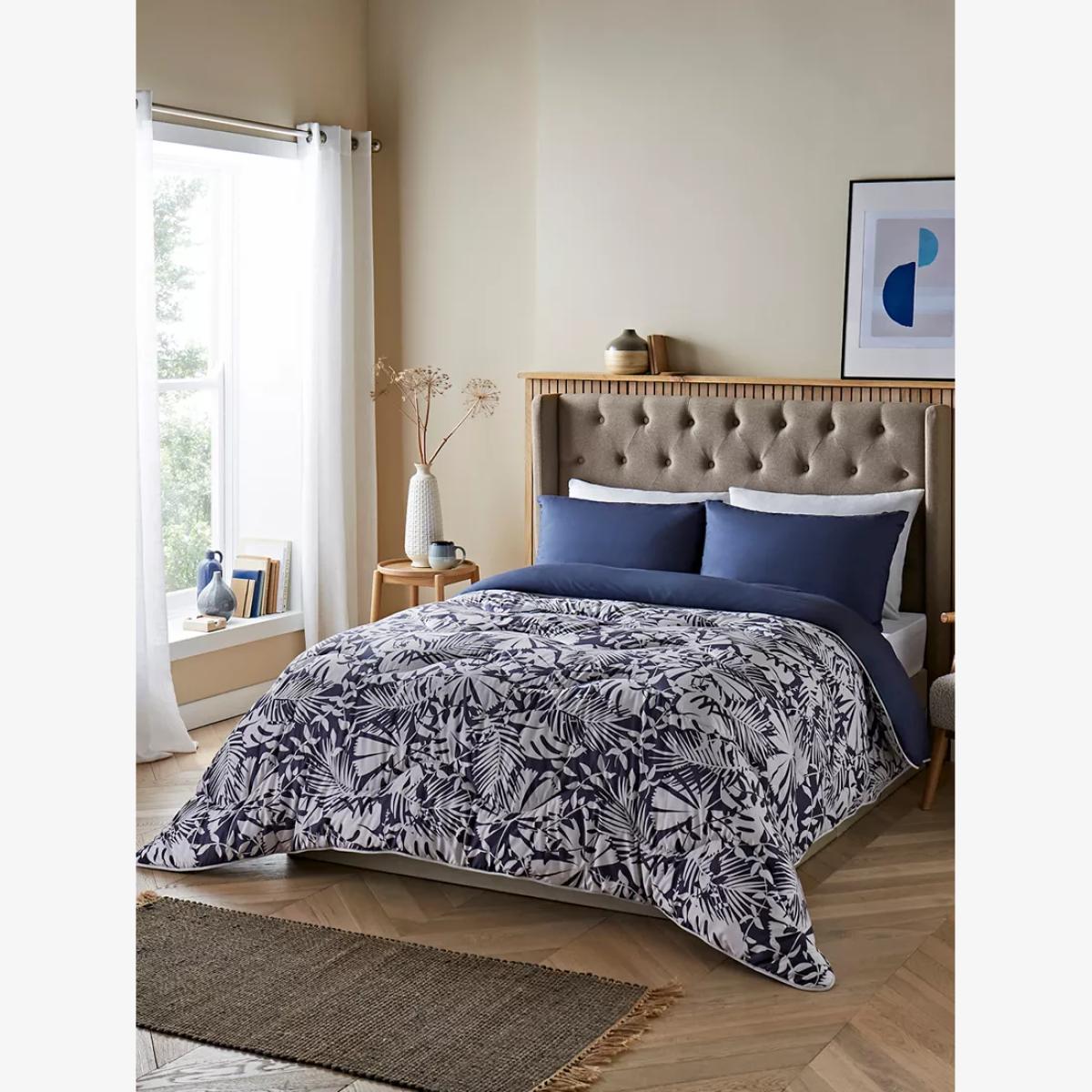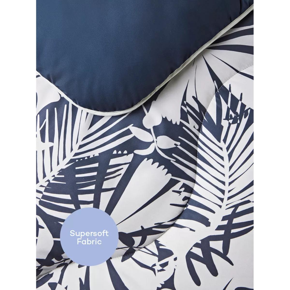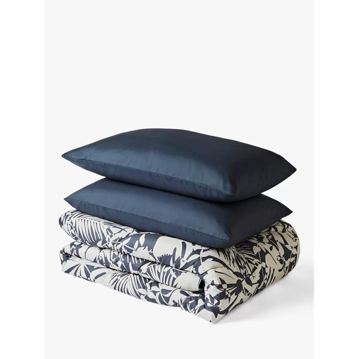 Experience an innovative bedding solution and take the hassle out of laundry and linen changes with the Night Lark® Coverless Duvet. This cosy duvet offers warmth without weight, and it's designed with an in-built, silky soft microfibre cover. It also comes in a handy reusable duffle bag. The soft Smartfil® filling is made from 100% recycled PET plastic bottles and it's both shape-retaining and ultra-washable. It's also quick-drying, so wash it at home and air or tumble dry it, and it will be back on your bed on the same day. The Winter Palms print on this coverless duvet is a soothing and simplistic design complete with palm shapes. Complete with co-ordinating pillowcases. The single includes one pillowcase and all other sizes include a pair Made in a B Corp™ certified European Eco Factory in Estonia