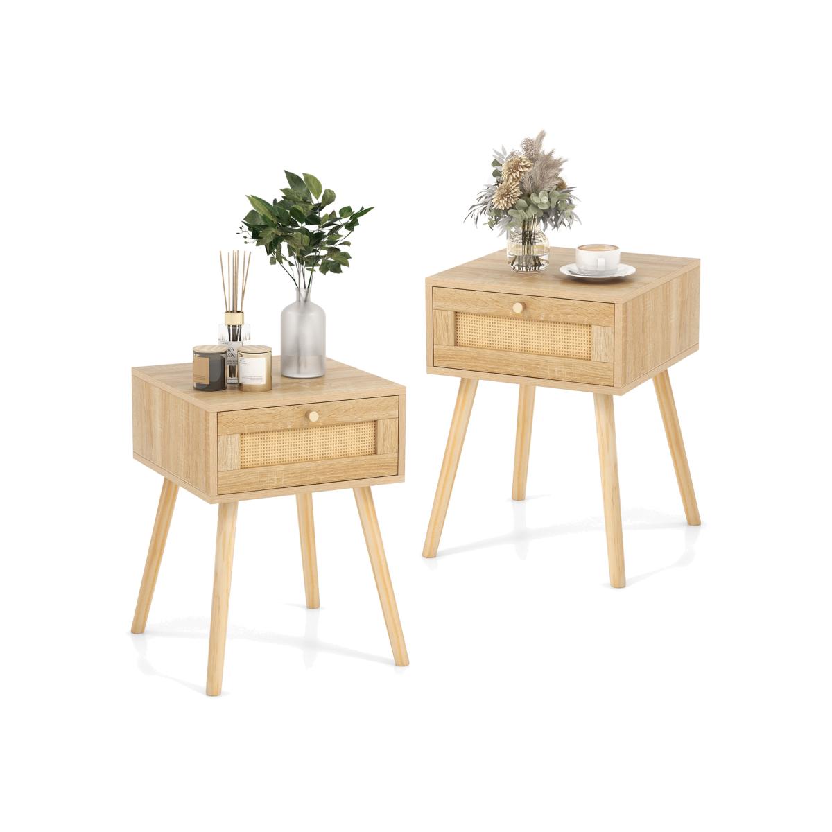 Featuring a rattan-look door and oak finish, the Boho bedside table is an attractive addition to your bedroom, living room or hallway. It is also a perfect storage organizer to be set beside the sofa, bed or desk, bringing extra storage space with a open top and a pull-out drawer. Say No to mess! With its handy storage space, you can keep clocks, lamps, cups, eyeglasses, and remote control well-organized. Meanwhile, the tapered wood legs not only contribute to a sturdy construction, but also adds a mid-century modern flair.