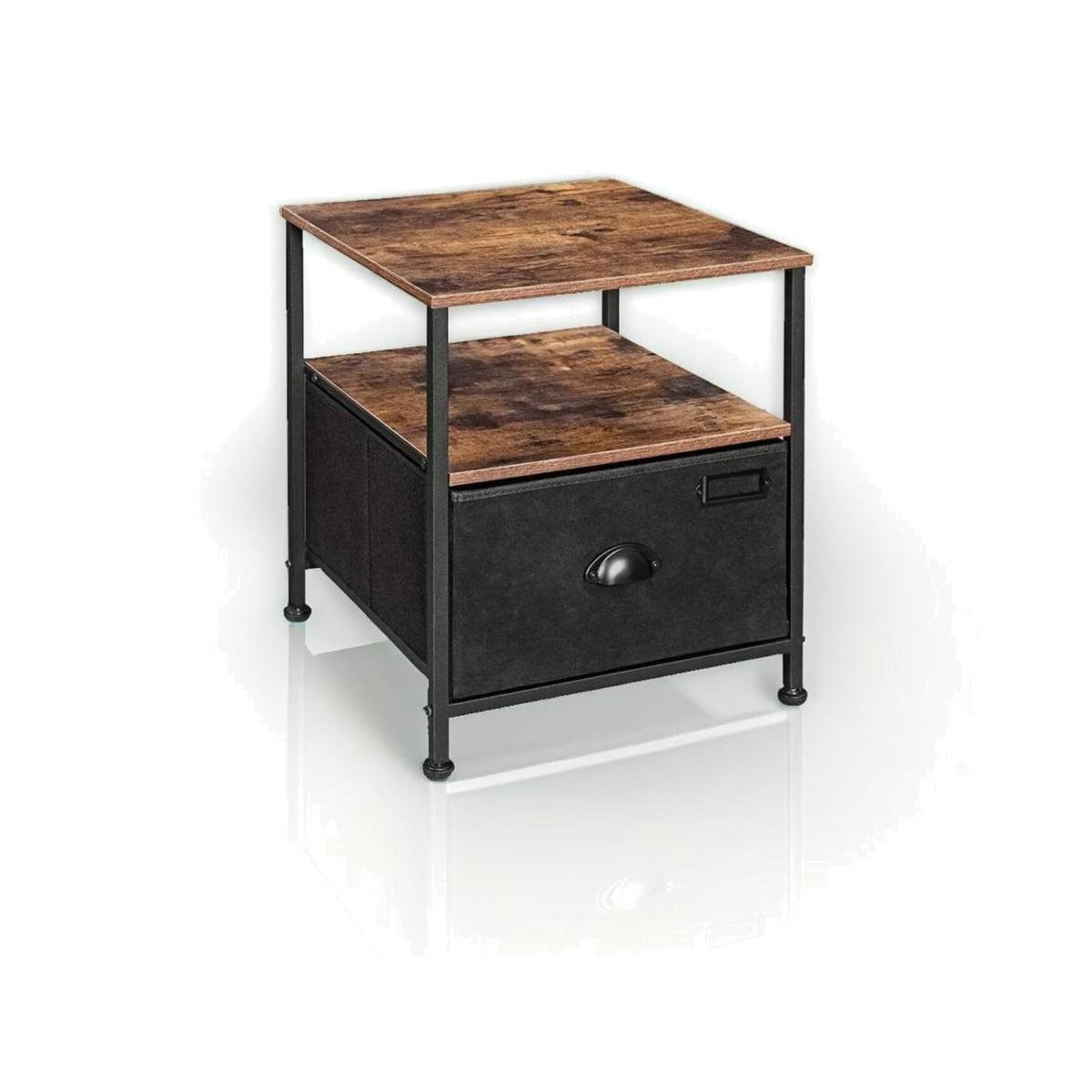 This end table blends rustic charm with its rustic brown tabletop, black metal frame, soft faux suede fabric front, and metal cup pull, creating a statement piece that uplifts your space with a charming rustic flair. Combining fabric, metal frame, and wooden top results in a stable, durable, and lightweight bedside table that effortlessly supports everything you need by your side. Beyond serving as a companion for lazy nights, this versatile table also excels as a side table in your reading nook. It provides a cozy spot for your coffee, books, pens, and all your creative ideas, big and small.