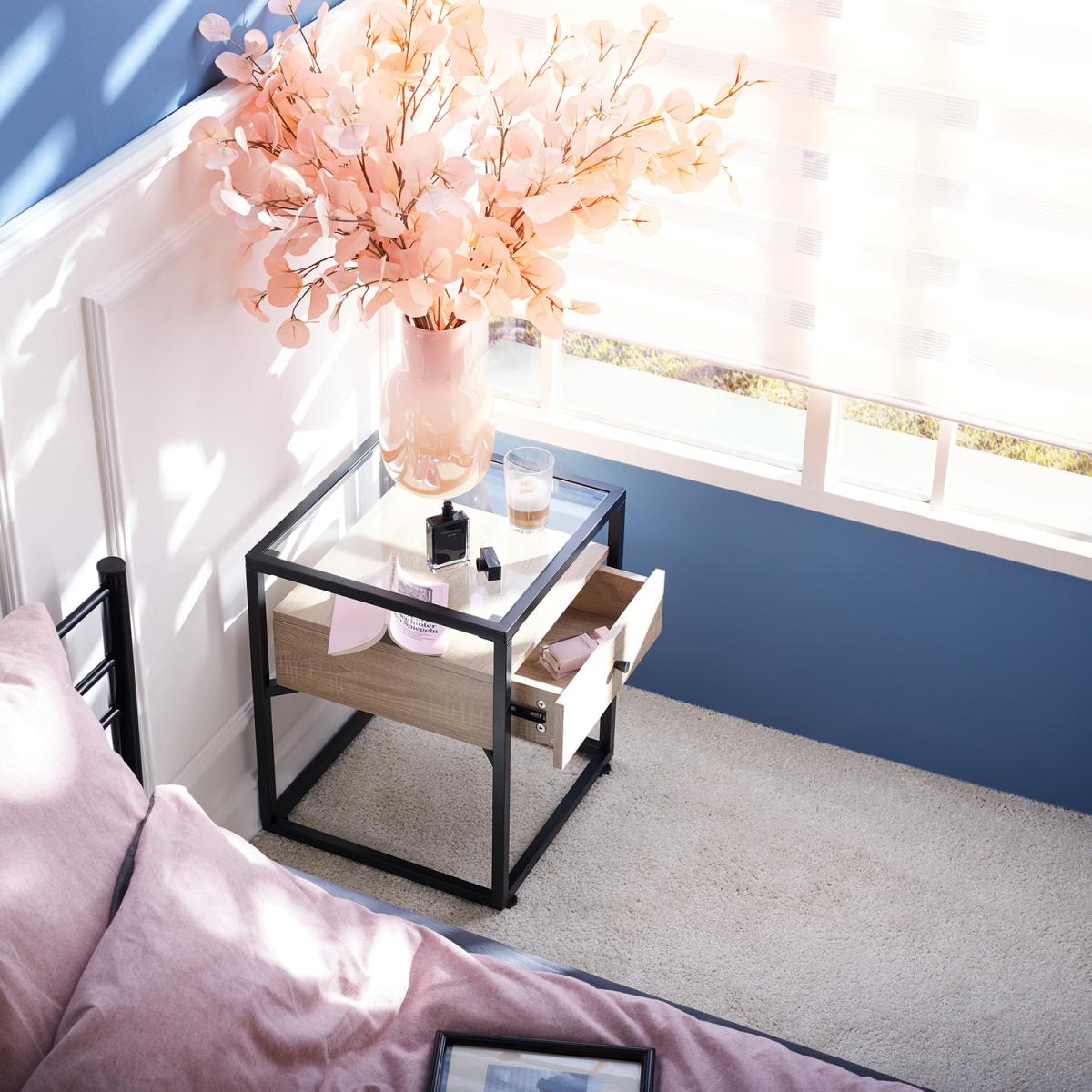I love this nightstand for its versatile industrial look that pairs well with both modern and rustic interiors. The mix of dark metal framing with the warm wood drawer creates a balanced aesthetic that feels both sturdy and stylish. Its glass surface offers a contemporary edge, making it perfect for bedroom schemes that lean towards minimalism or urban styles. Practical styling tips include keeping the surface clear for a lamp or decorative item, while a few small styled essentials on top can add personality. The drawer provides handy storage for bedside bits, making it as functional as it is good-looking. Overall, this piece works well in eclectic spaces or industrial-themed bedrooms, adding a statement without overwhelming the room.