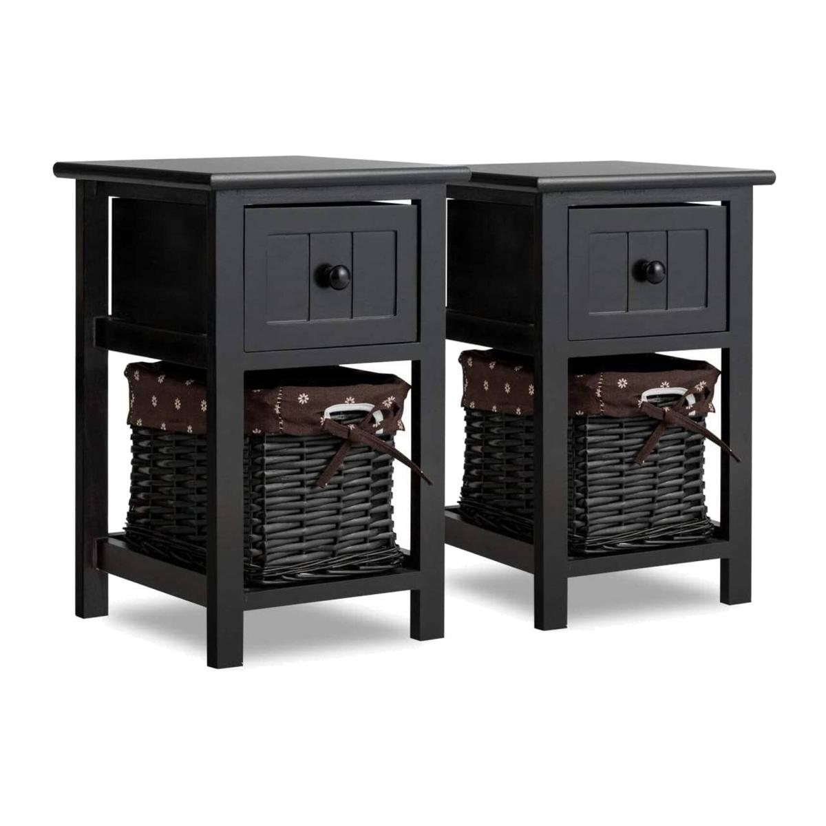 Nightstand Side Table with Wicker Basket - Black / 2