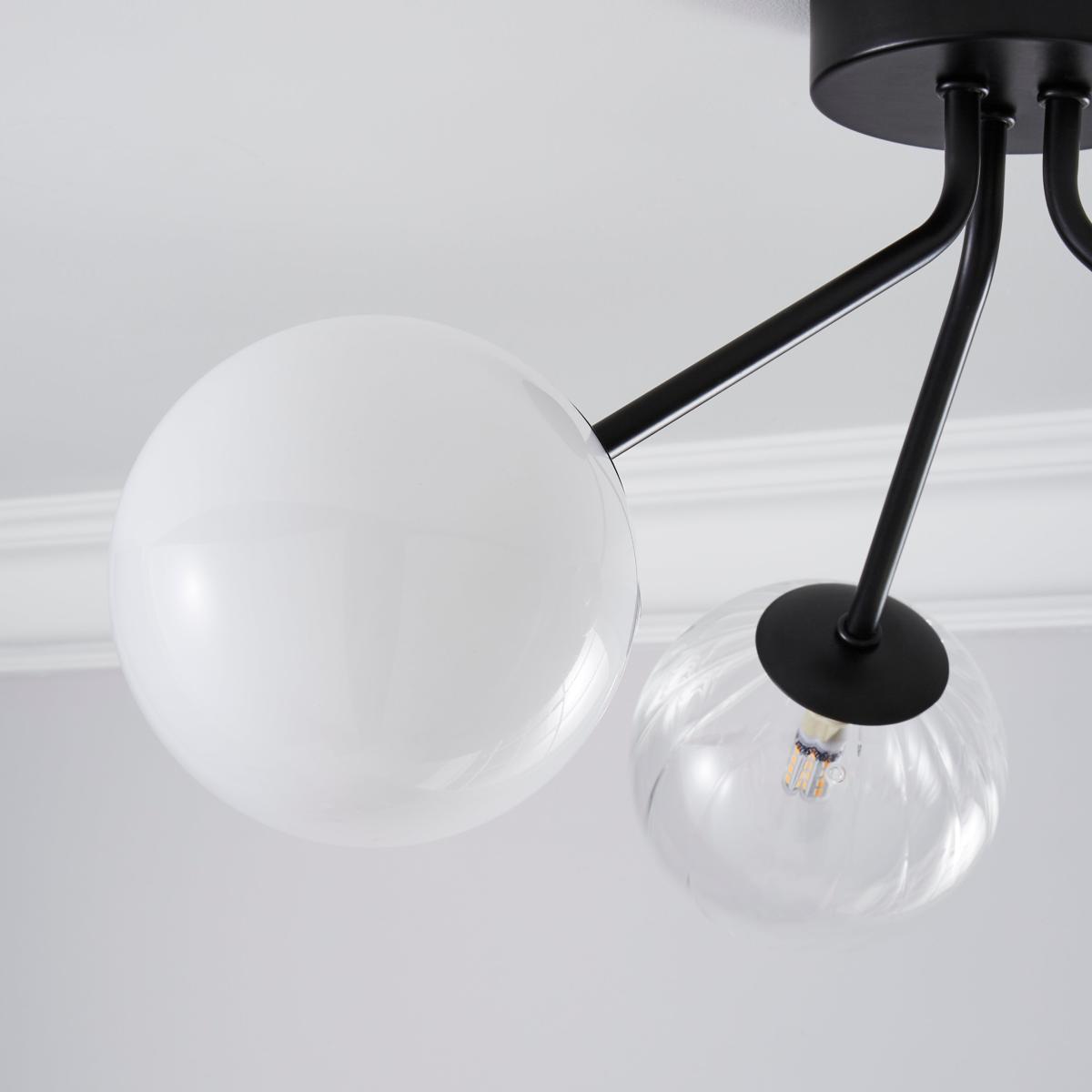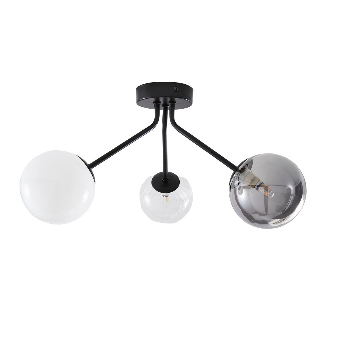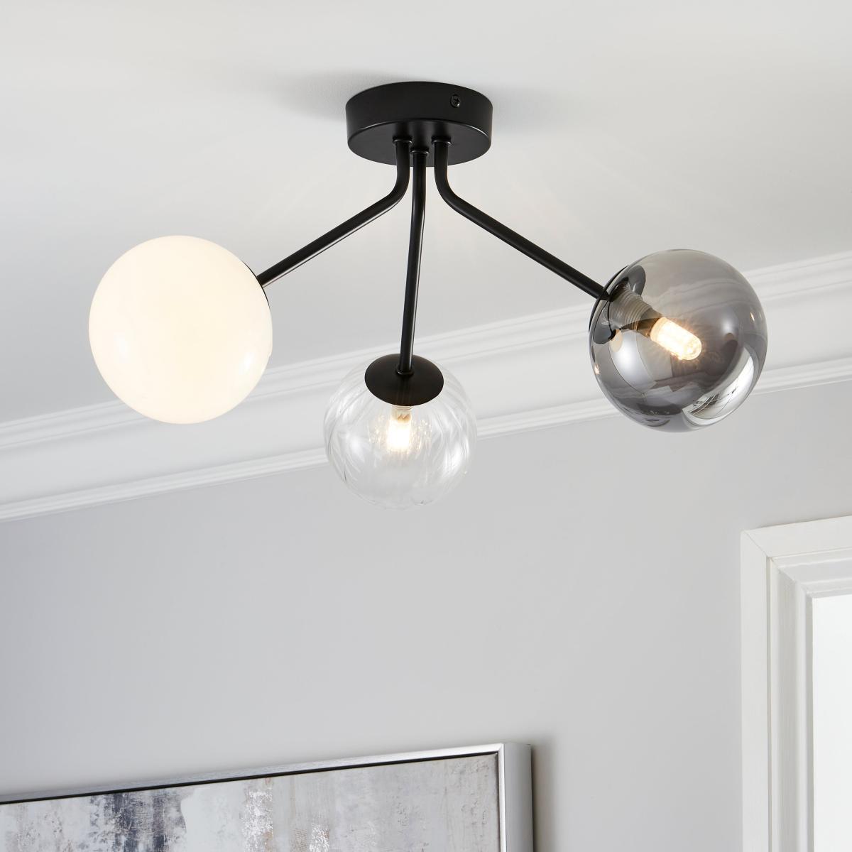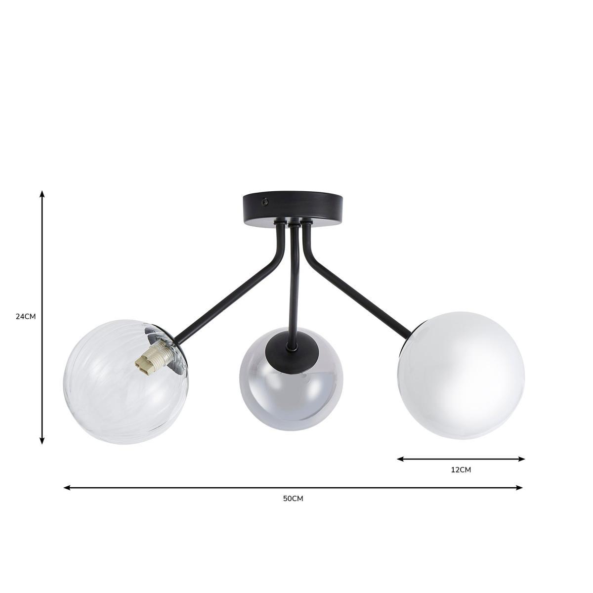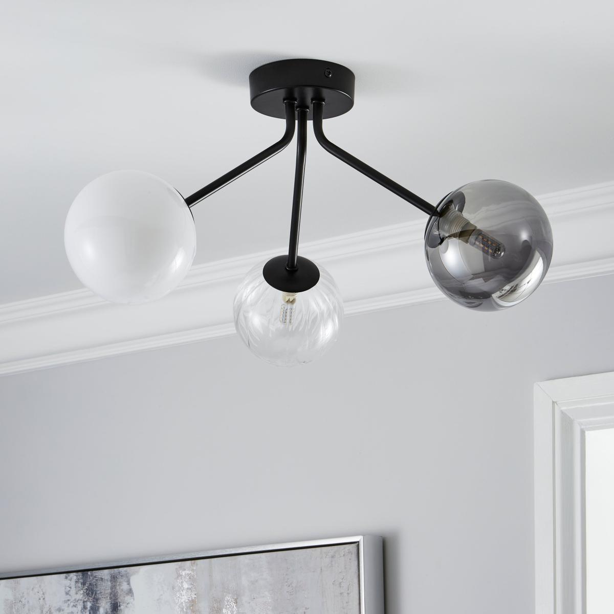 * Bulb required: 3 x 2.2W LED G9 Capsule* Bulb not included* Dimmable compatible* 3 Light Luxe Semi-flush Ceiling Fitting* Available in a larger size* Matching family items* 2 year guarantee Perfect for adding a luxurious touch to your home décor, this stunning Nila 3 Light Ceiling Fitting is stylishly crafted with a painted black metal base and frame. Beautifully finished with clear, white and smoke round glass shades. The semi-flush design makes it perfect for any home, specially homes with low ceilings and the dimmable feature will help to create the perfect ambiance for any occasion. This light is the ultimate combination of futuristic style and functionality.