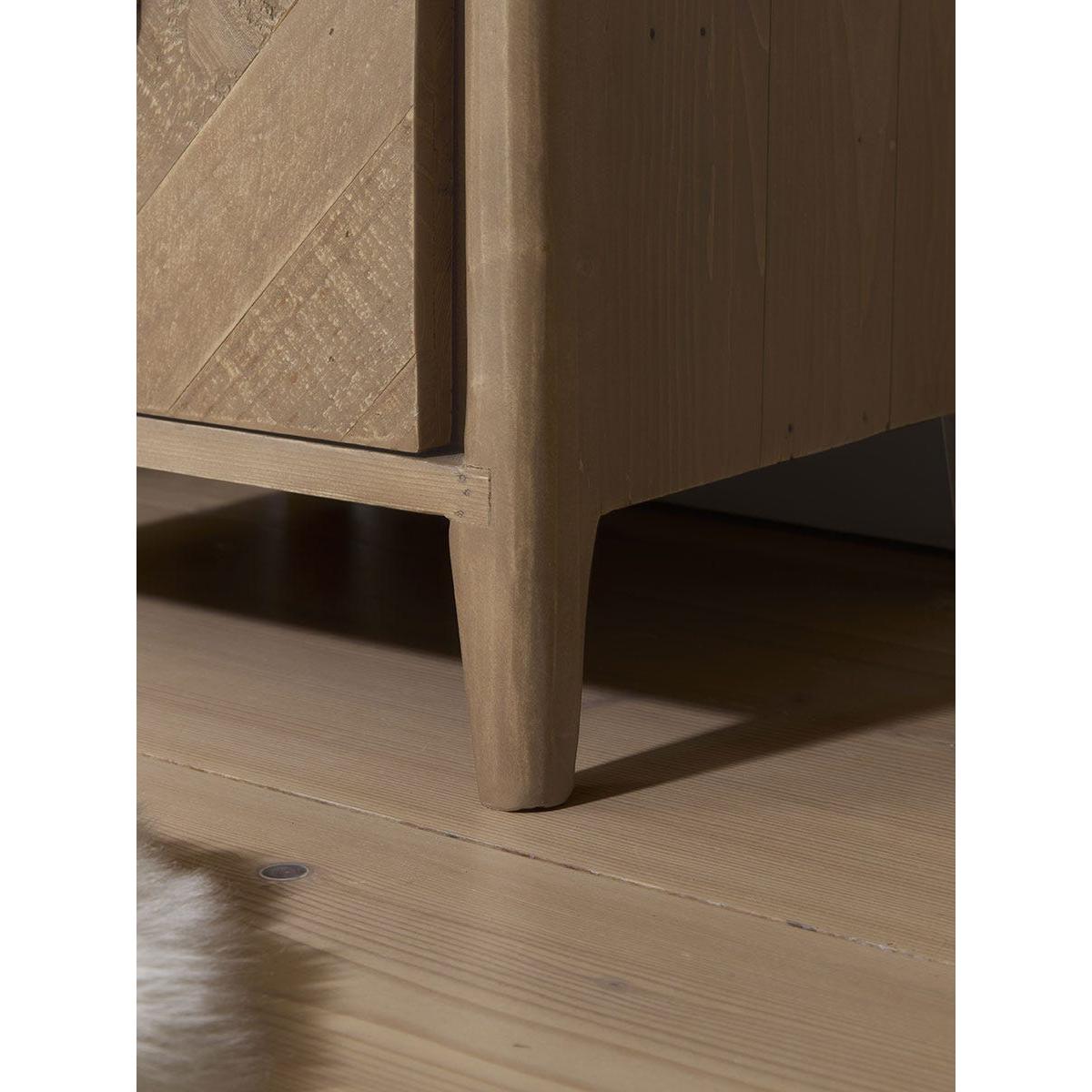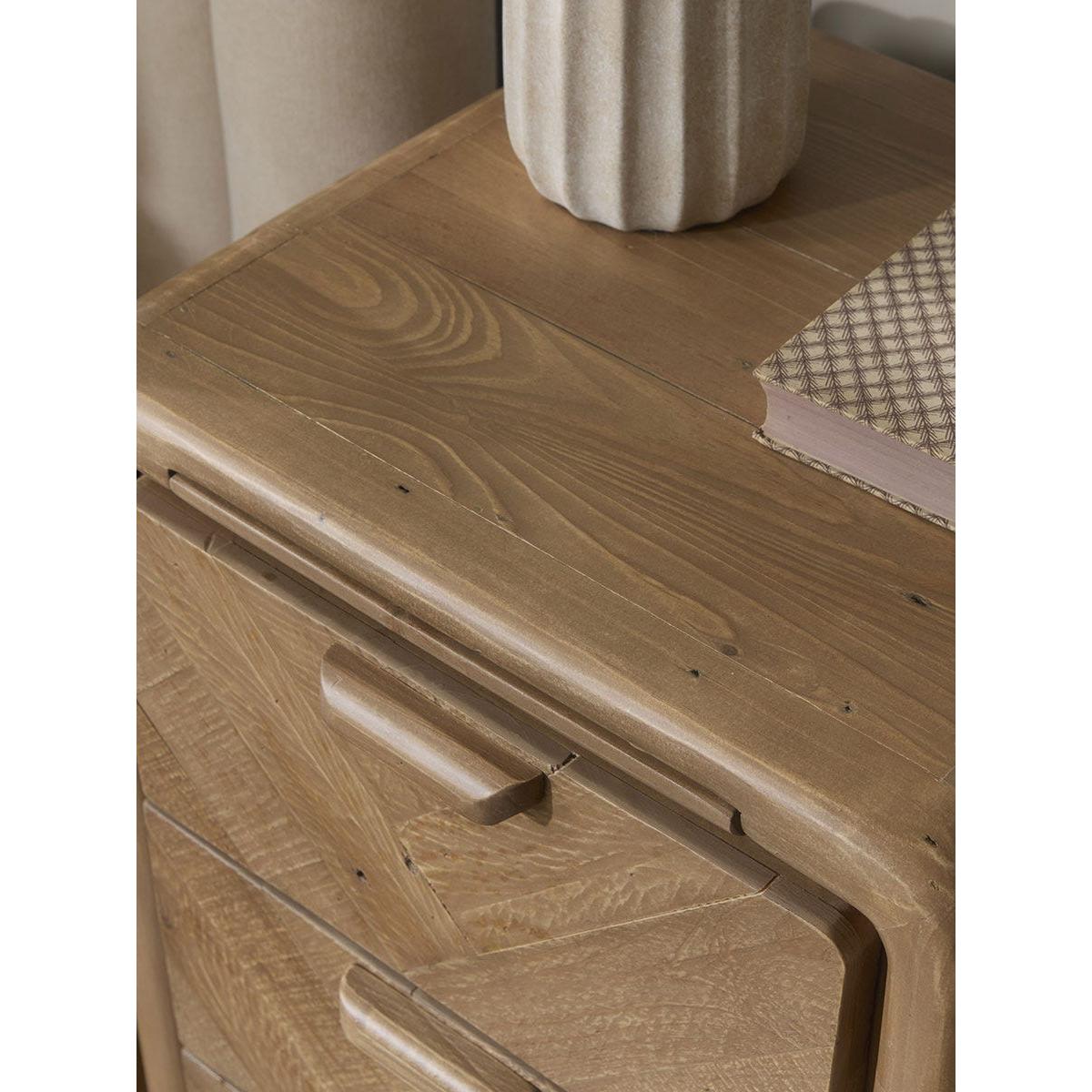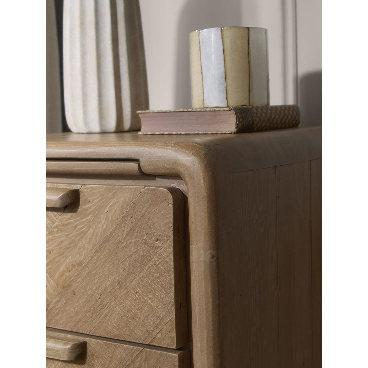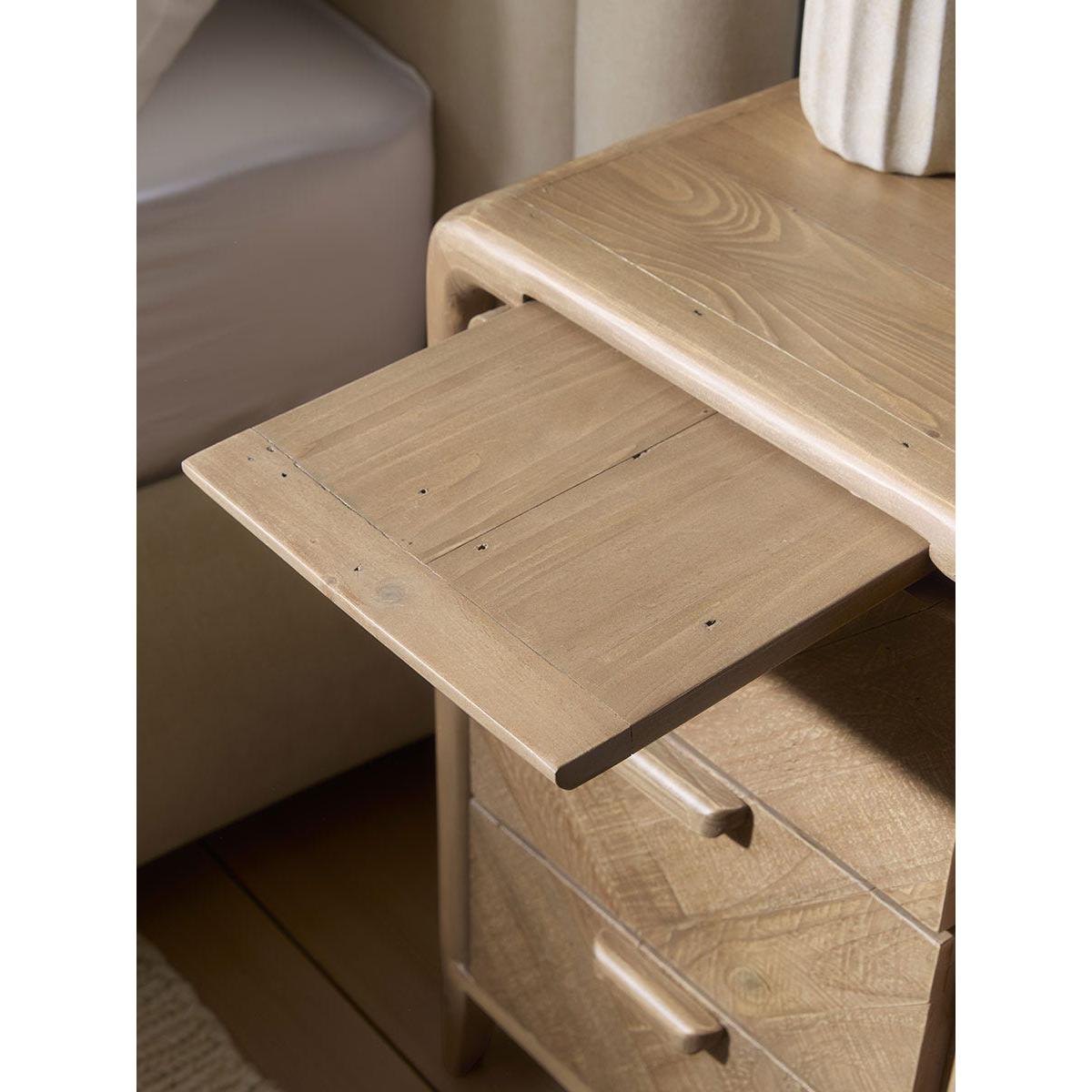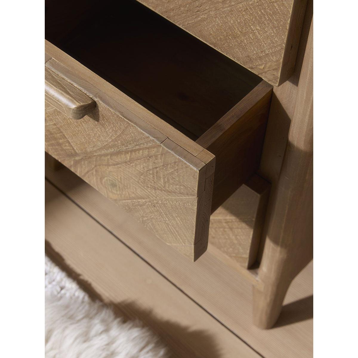 Crafted from reclaimed wood, our Nils bedside table has a solid frame that is softened by curved corners and delicately tapered legs. With three drawers, finished with wooden handles, that are perfect for keeping nighttime essentials tucked away, there is also a hidden shelf that extends your tabletop, ideal for keeping a drink or your phone during the night.