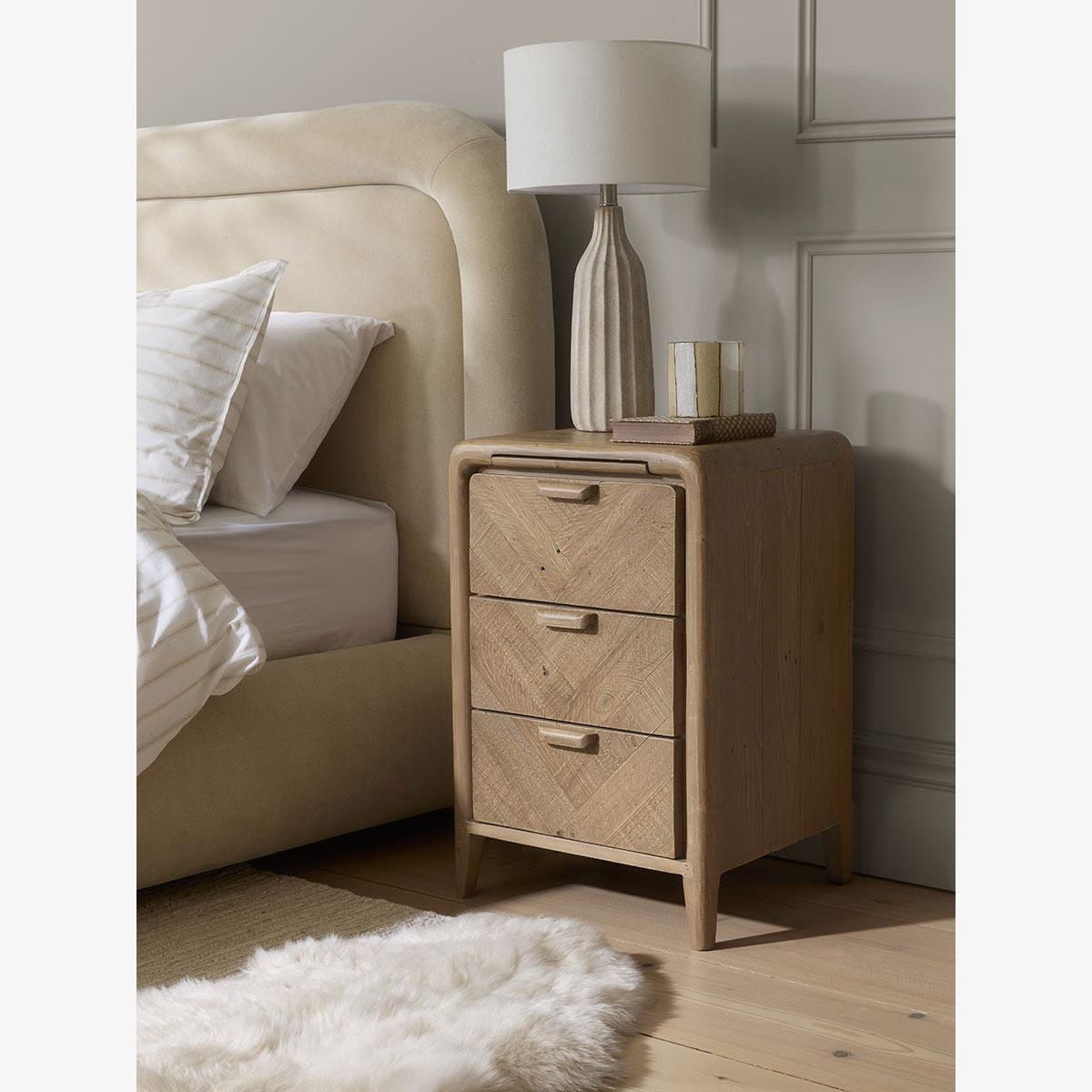 I love this little bedside table for its simple yet elegant design, which makes it versatile across a range of interior styles - from Scandi and minimalist to more traditional schemes. Its natural wood finish adds warmth to a bedroom and works particularly well with neutral palettes or layered textures. Practical styling tips include keeping the top surface uncluttered with a favourite lamp, a small tray for essentials, or a vase of fresh flowers. Its compact size makes it ideal for smaller spaces, while the three drawers provide useful storage for bedtime essentials, helping to keep the space looking tidy. Overall, it’s a practical piece that seamlessly blends form and function.