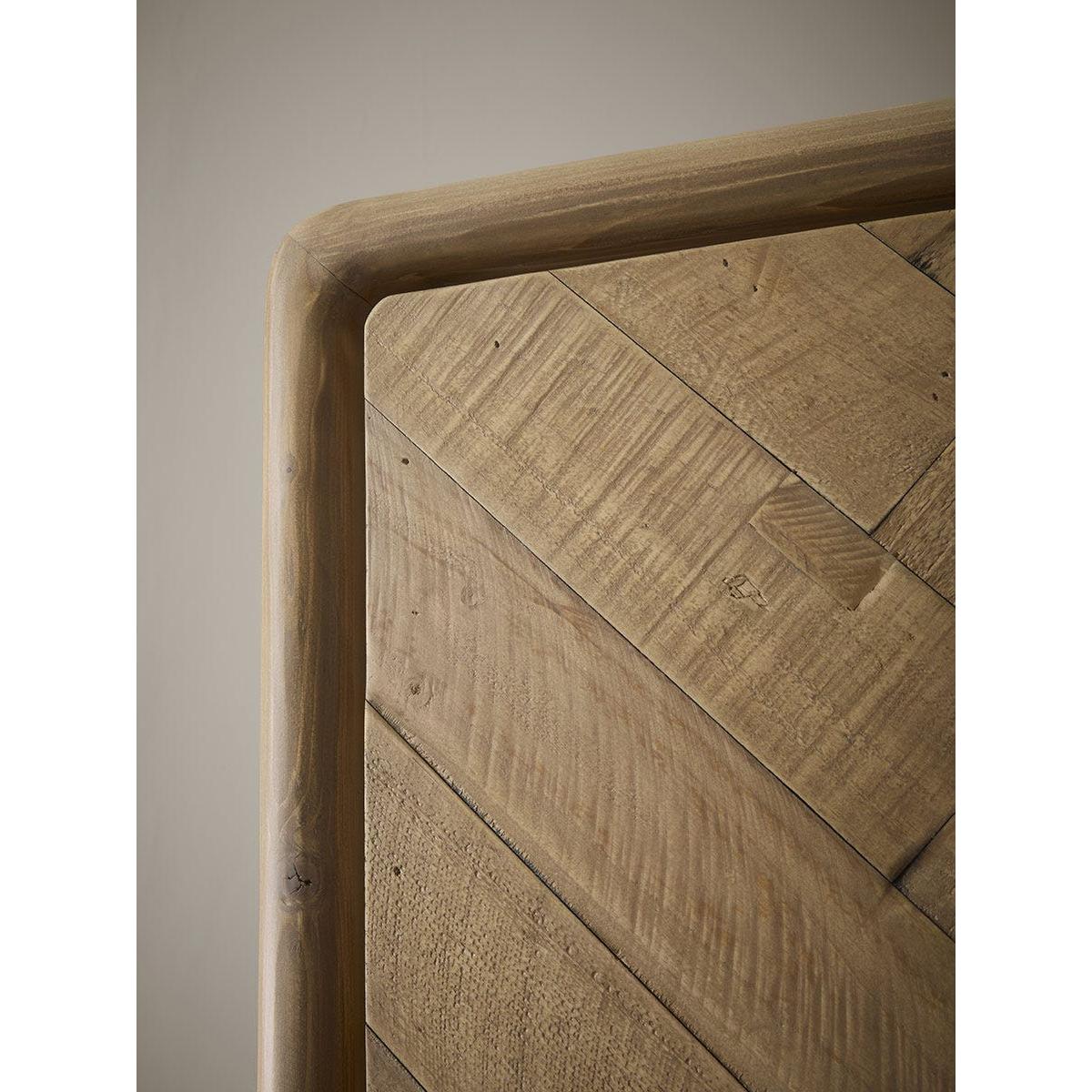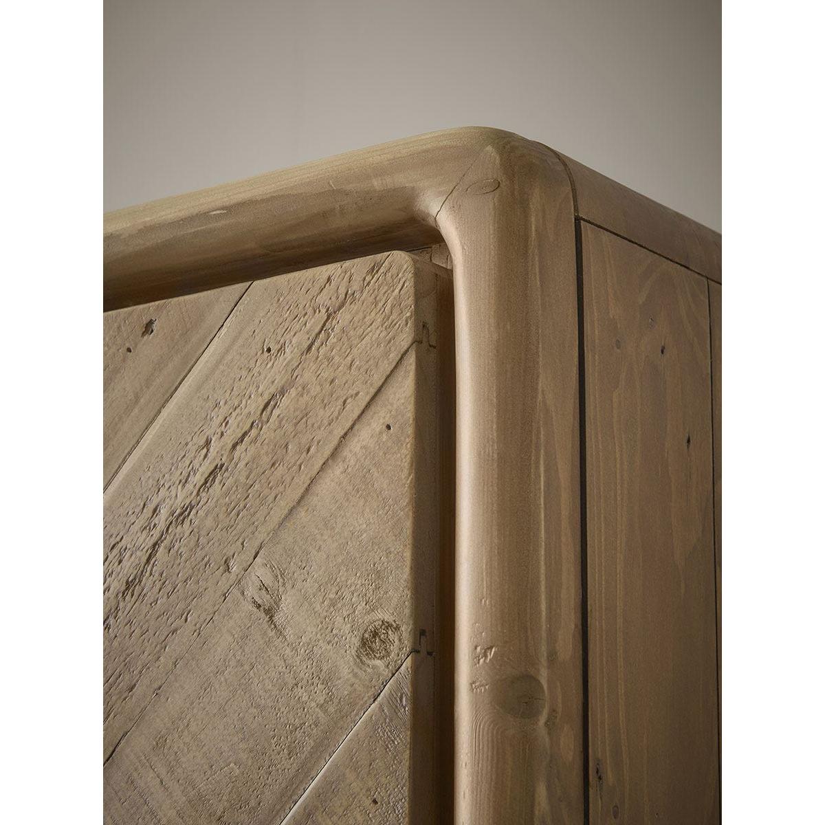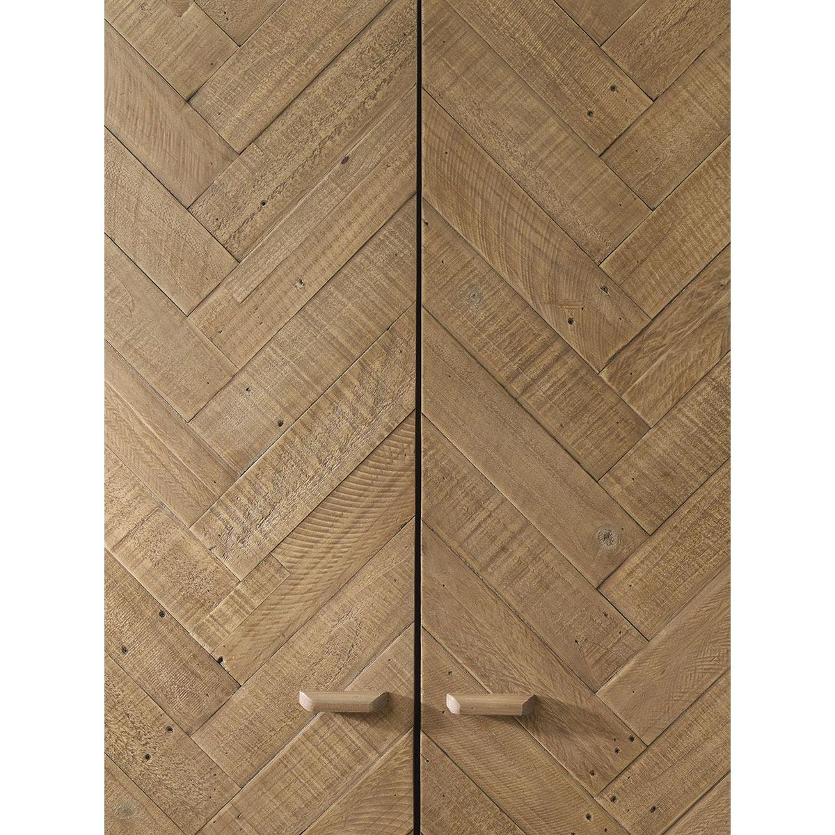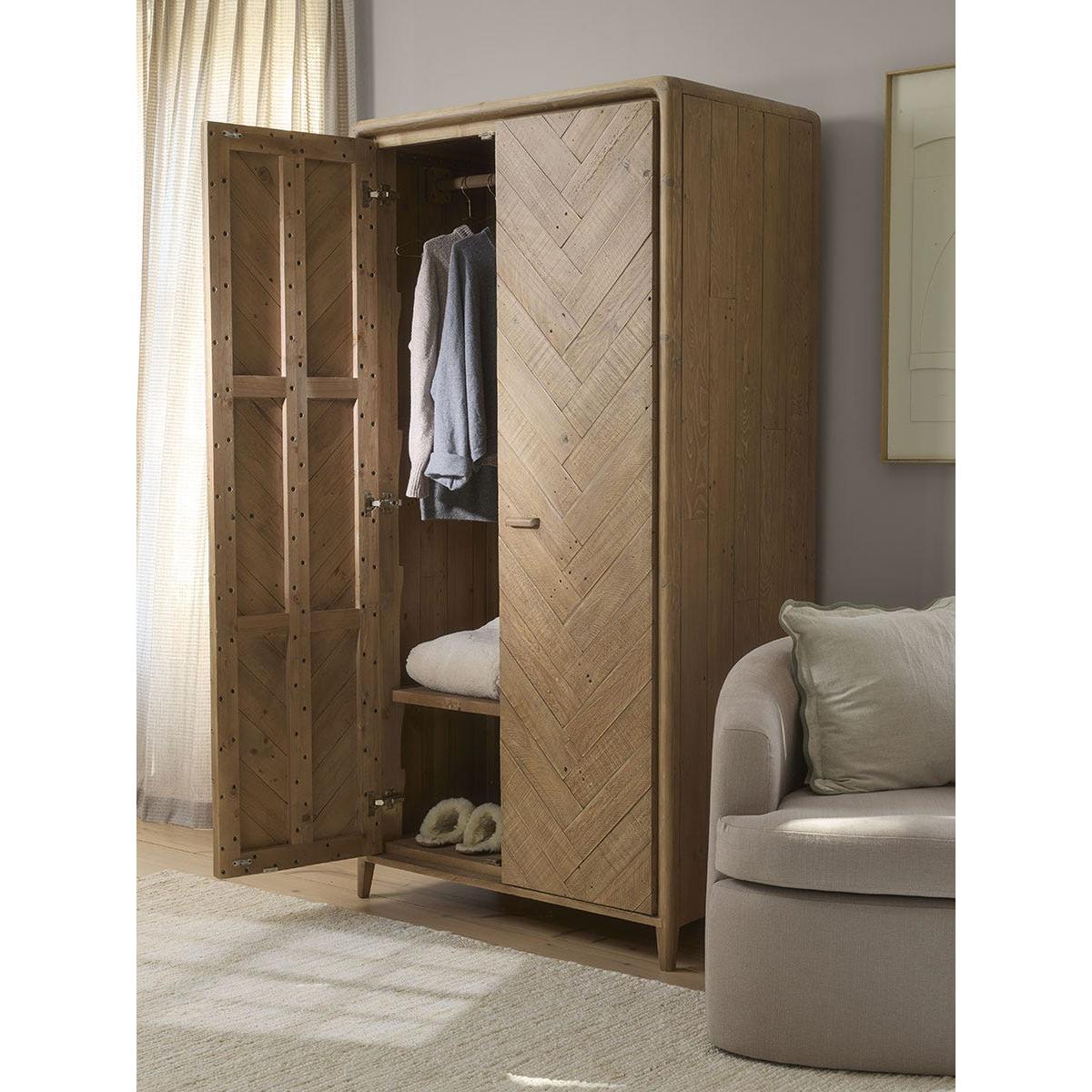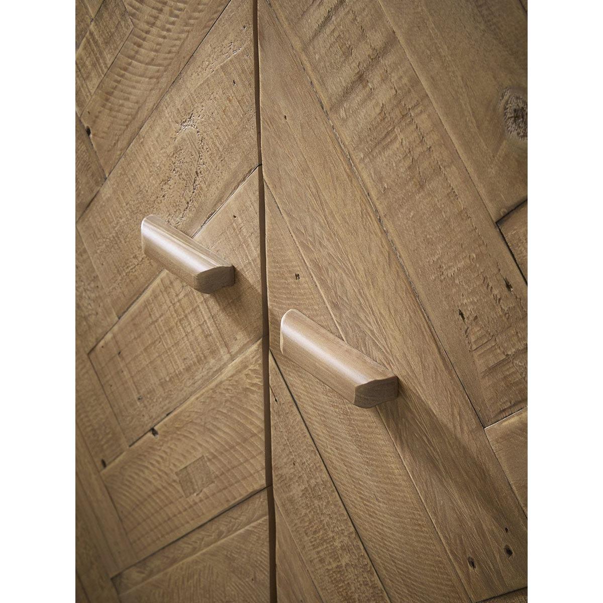 Crafted from reclaimed timbers, this wardrobe has a solid frame that is softened by curved corners and tapered legs. The wardrobe is fronted with parquet-style doors, and they are finished with wooden handles that create a simplicity to the frame. With a rod for hanging and two shelves that offer plenty of room to keep items folded away neatly, pair this wardrobe with the rest of our Nils collection, including a bedside table and a chest of drawers.
