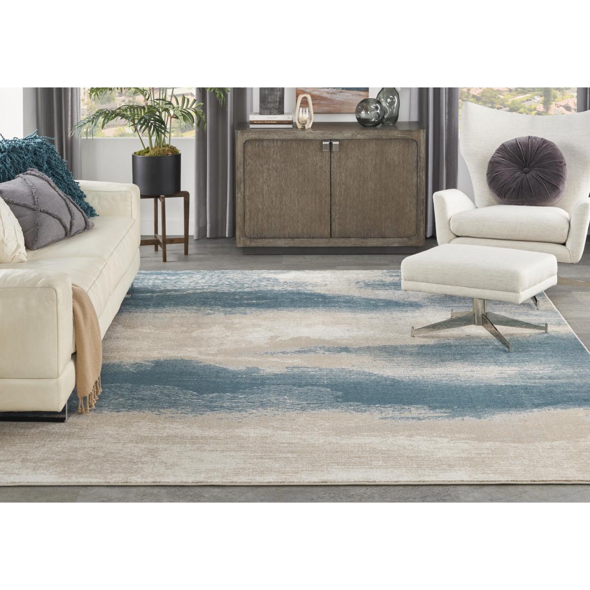 Showcasing a very fashionable teal and ivory colour palette, this modern rug is perfect for living spaces and bedrooms alike. Its cloud-like swirls and patterns are gently abstract. Why you'll love it. Cloud-like swirls drift across this striking abstract teal rug. Modern style. Soft yet hardwearing. Also available in a flint-grey colourway. In a range of sizes. This rug is part of the Furniture Village home accessories collection. What you need to know. 10 mm pile height. Cotton backing. Easy to clean – vacuum regularly. Blot stains; do not rub. For indoor use only.