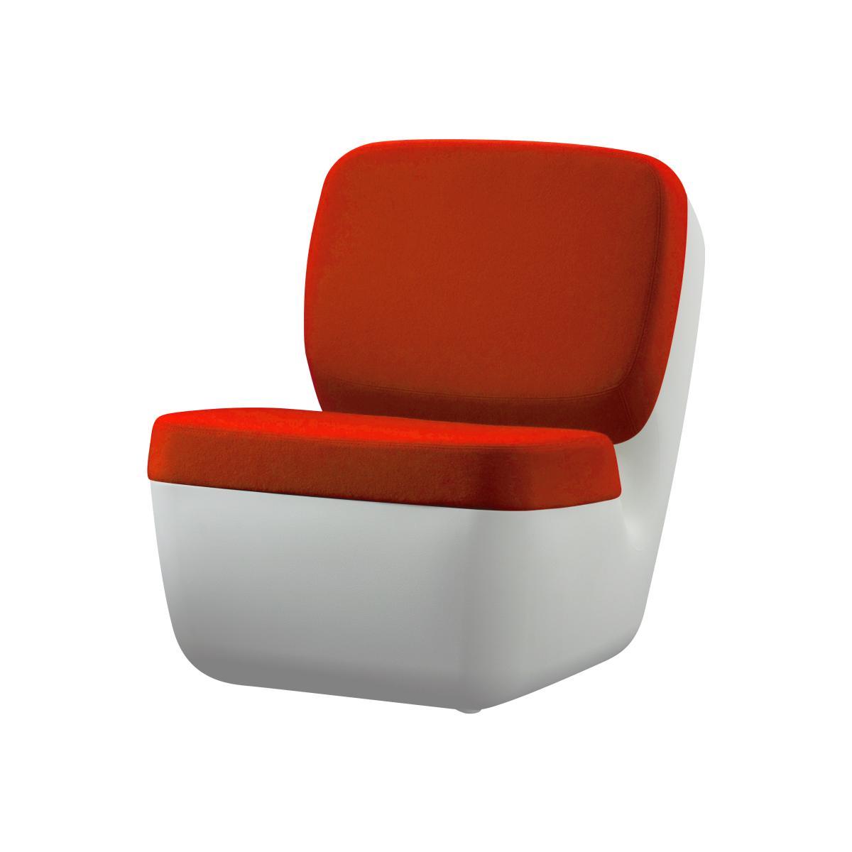 Contemporary this low armchair Nimrod drawn by Marc Newson proposes an original design. The structure is in polyethylene colored white. The back and the seat are formed by cushions in expanded polyurethane cover with a slip-cover in wool removable fabric declined in: red, yellow, green clear, green rushed, blue sky or gray. An unique armchair for a public that does not like the ordinary ! Exist equally with the black structure.