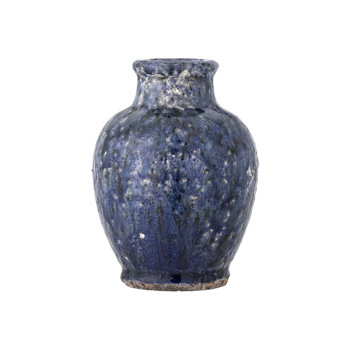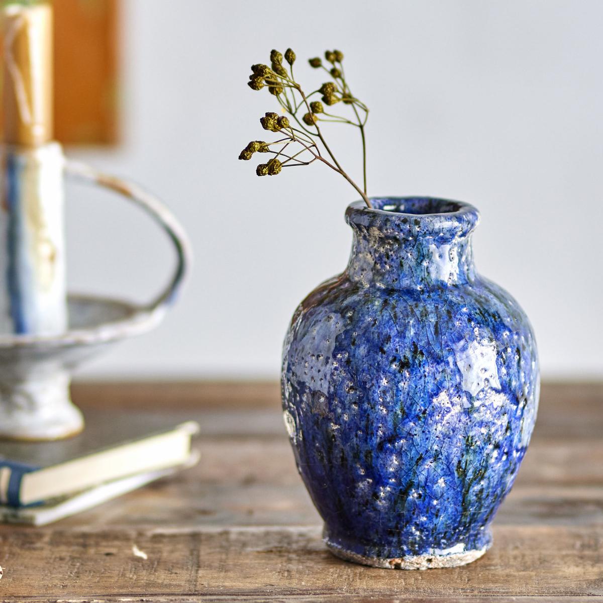 A neo-rustic look for this Terracotta vase with a reactive glaze in deep blue hues. The irregular shades convey a sense of craftsmanship and enhance the raw, authentic aesthetic of this creation.
