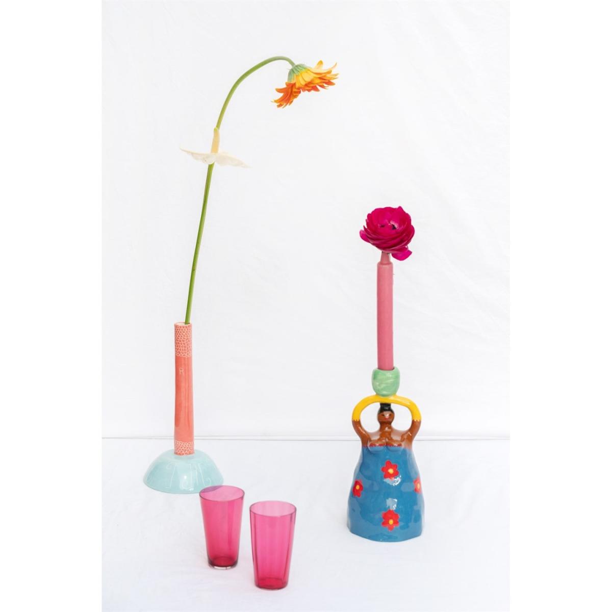 I love this little Nina candlestick holder for adding a playful touch to various interiors. Its colourful, handmade feel makes it ideal for eclectic, boho, or contemporary spaces where a pop of colour and personality is welcome. It works particularly well grouped with other textured ceramics or displayed as a standalone accent on shelves, sideboards, or dining tables. For practical styling tips, try pairing it with tapered candles in bold or neutral tones to highlight its vibrant design, and keep the surrounding decor simple to allow it to stand out. Its lively, artistic vibe makes it perfect for creating a joyful and welcoming atmosphere.
