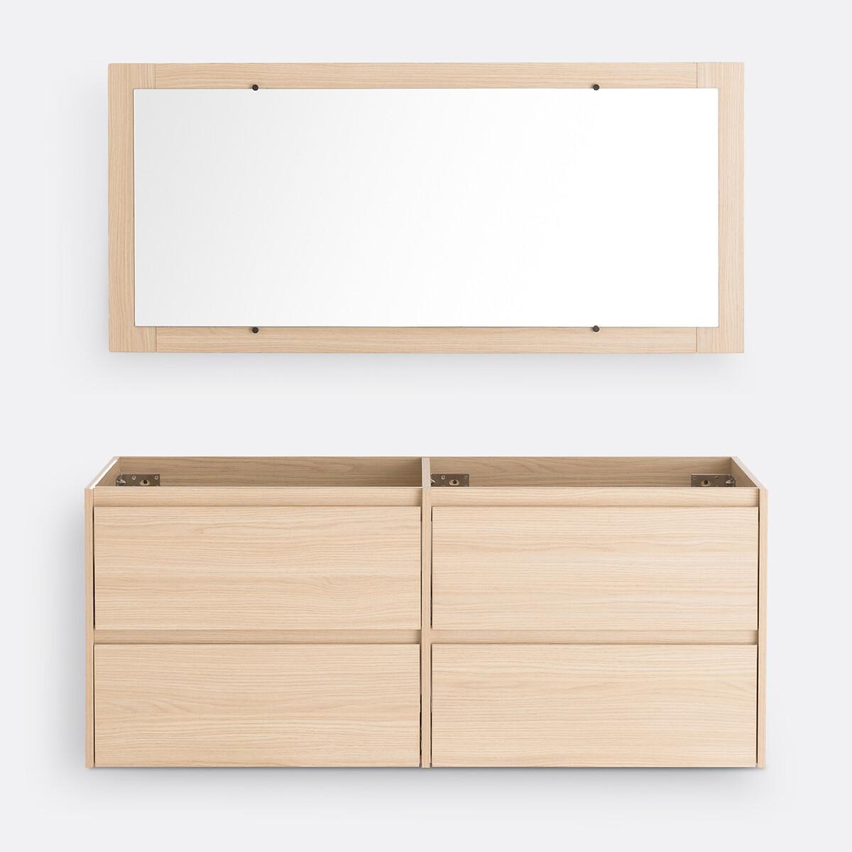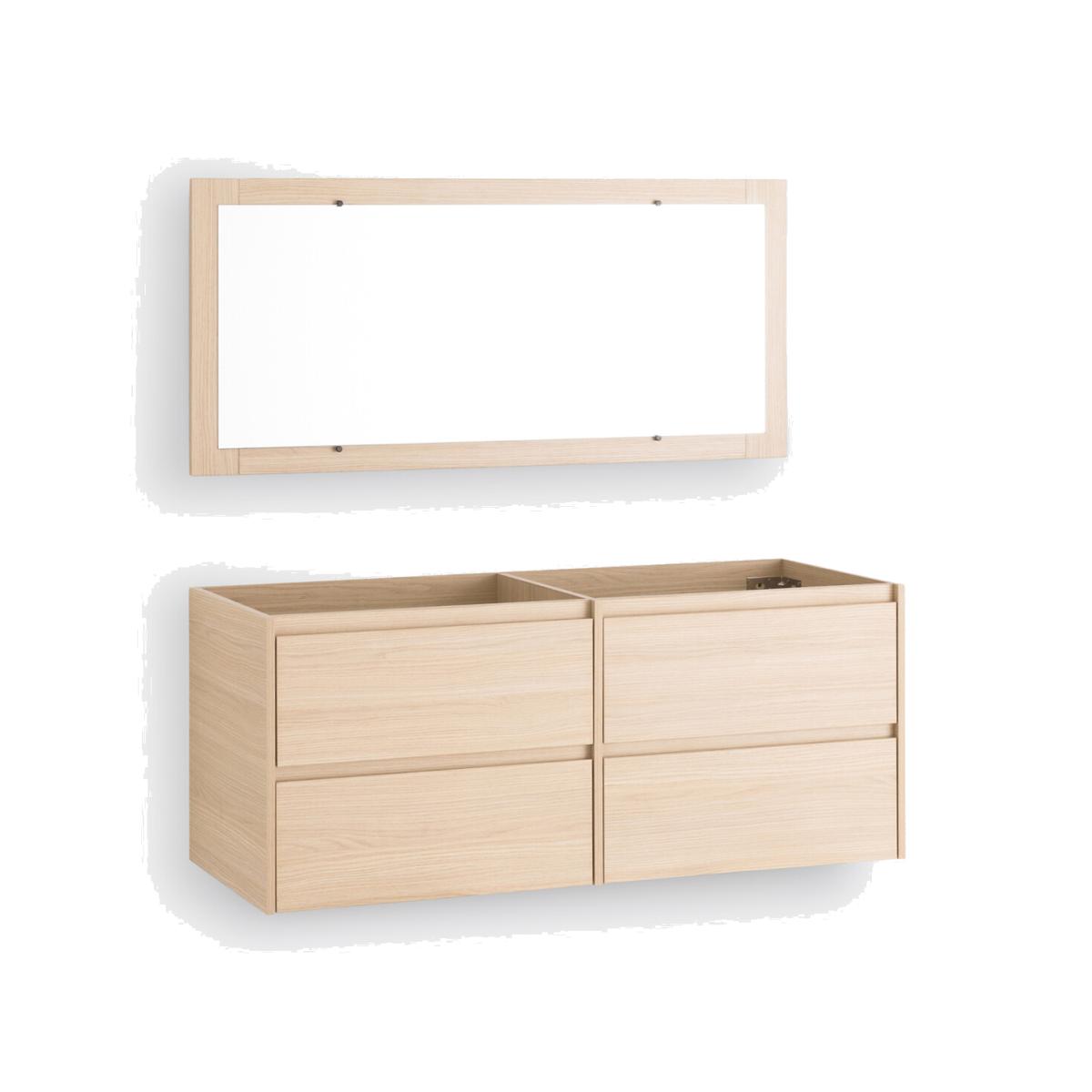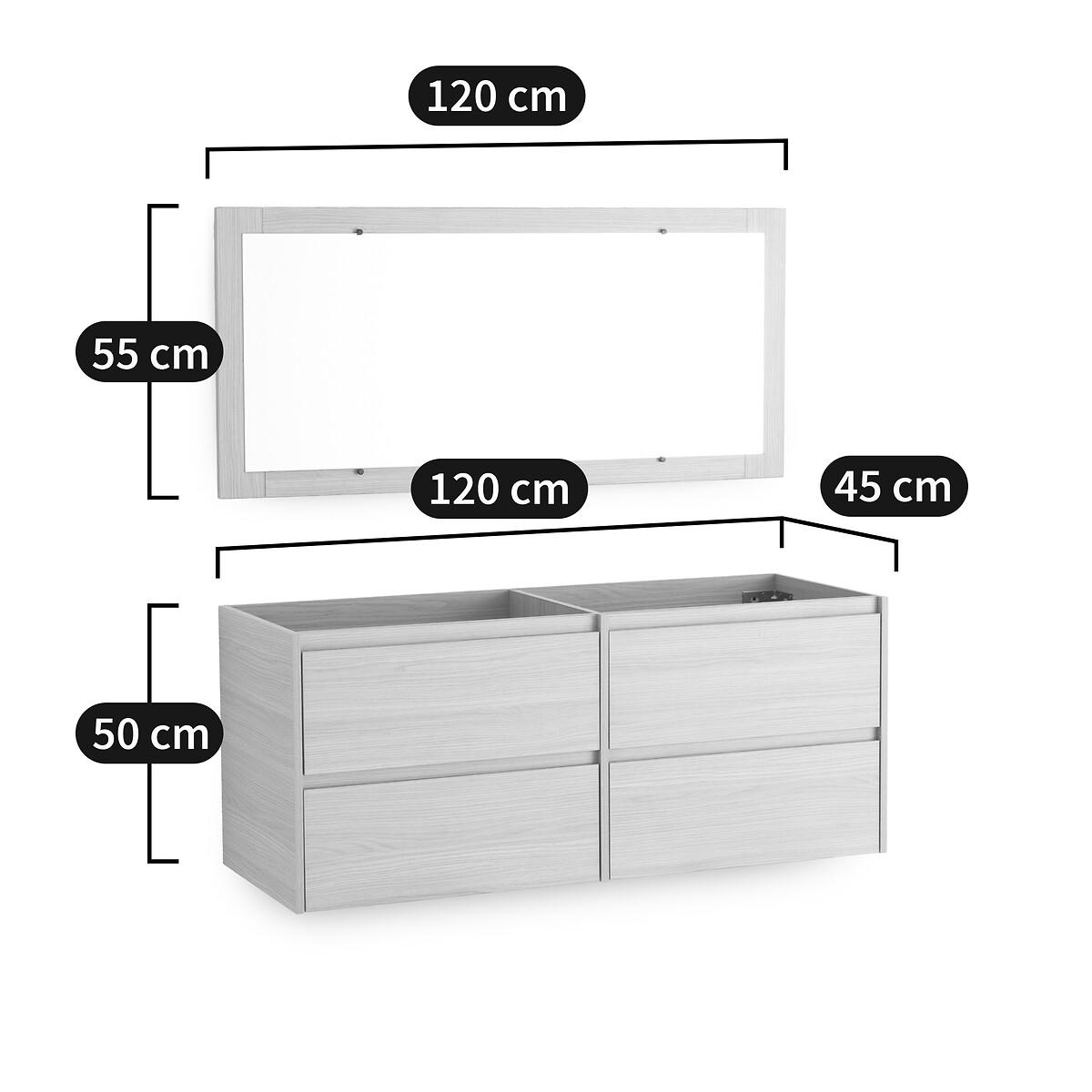A contemporary design. 4 drawers offering plenty of storage space. On-trend light oak colour with coordinated mirror. Space-saving and ultra practical, the Nirio cabinet attaches to the wall to fit into all bathrooms. Product Details • 4 drawers with invisible steel slides, soft closing system • In melamine particle board, light oak decor • FSC® certified wood • With coordinating mirror • Wall fixing (screws and plugs not supplied) • Delivered without drains and taps Quality Info • Soft-closing : smooth, quiet drawer closing system that also prevents fingers from being trapped. DimensionsOverall Unit • Width: 120cm • Height: 50cm • Depth: 45cm • Weight: 28.8kg Mirror • Width: 120cm • Height: 55cm • Depth: 2cm • Weight: 8.1kg. Usable space • Drawer:L53.5 x H14 x D33.5cmDelivery:. This product required assembly. Available for home delivery. • WOOD FROM SUSTAINABLY MANAGED FORESTS. FSC® certified wood comes from forests that are environmentally, socially and economically well managed. Dimensions and weight of parcel1 parcel • L136 x H20.5 x D72cm. 43.3kg