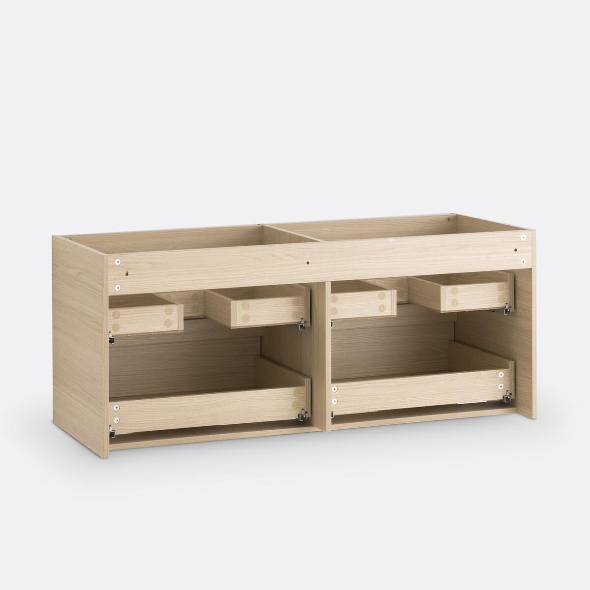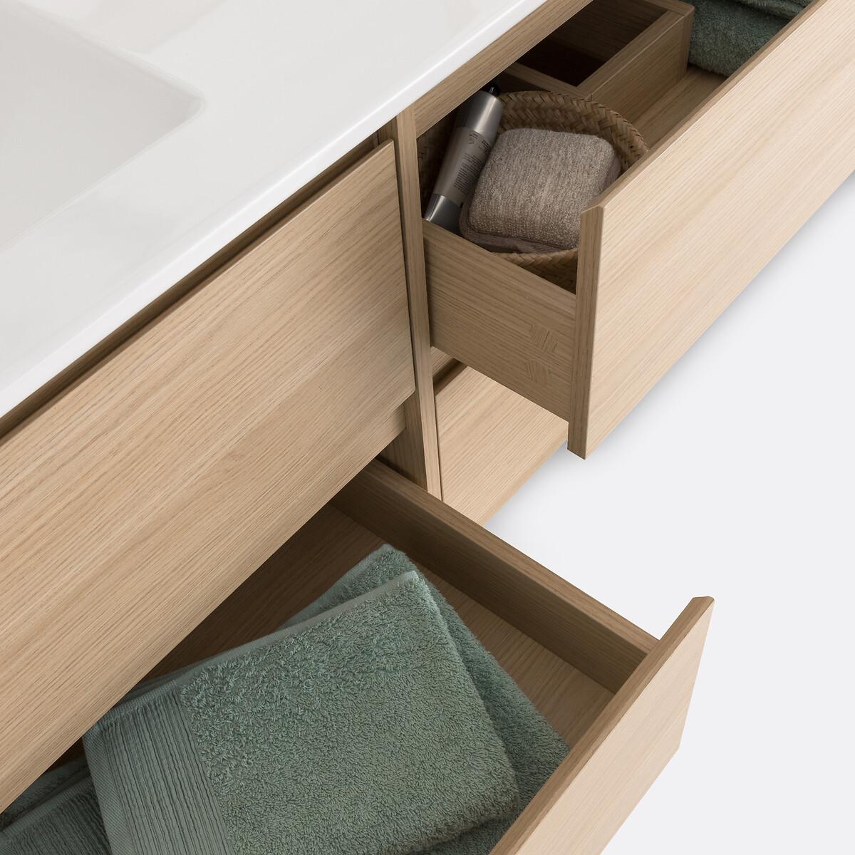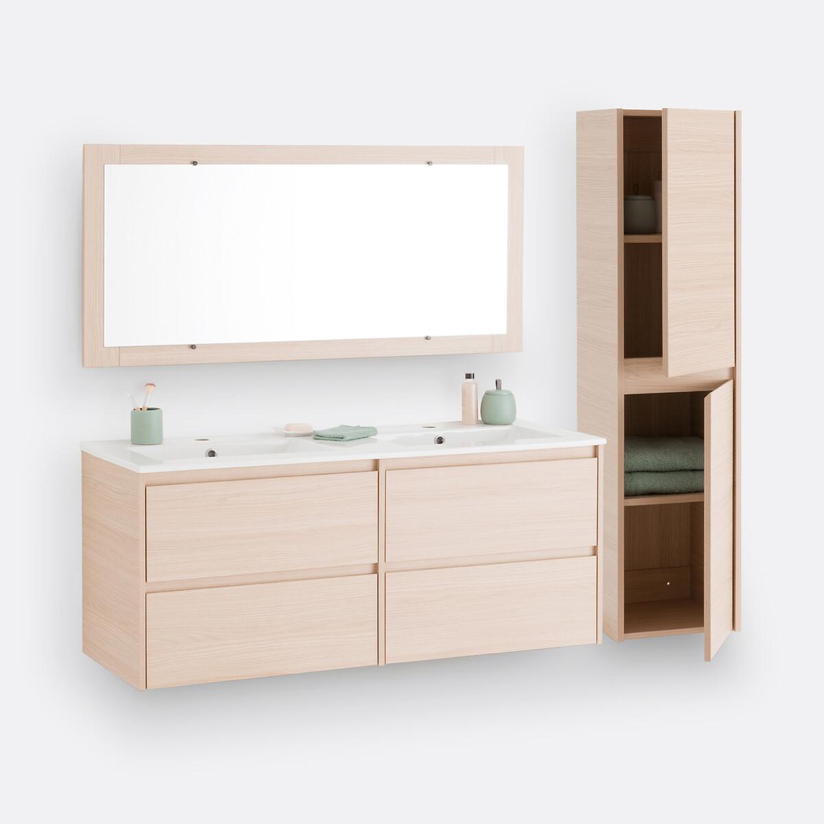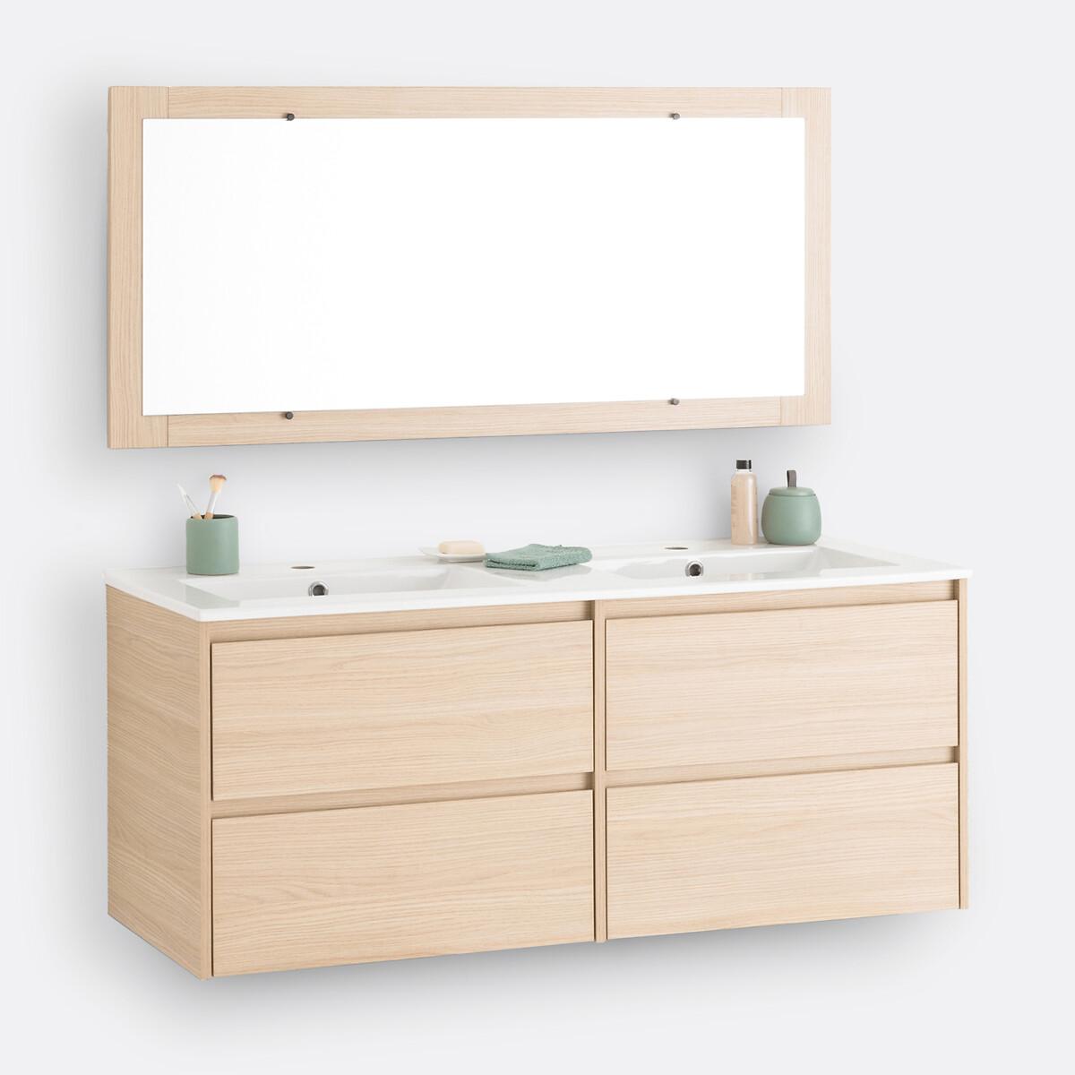 A contemporary design. 4 drawers offering plenty of storage space. On-trend light oak colour with coordinated mirror. Space-saving and ultra practical, the Nirio cabinet attaches to the wall to fit into all bathrooms. Product Details • 4 drawers with invisible steel slides, soft closing system • In melamine particle board, light oak decor • FSC® certified wood • With coordinating mirror • Wall fixing (screws and plugs not supplied) • Delivered without drains and taps Quality Info • Soft-closing : smooth, quiet drawer closing system that also prevents fingers from being trapped. DimensionsOverall Unit • Width: 120cm • Height: 50cm • Depth: 45cm • Weight: 28.8kg Mirror • Width: 120cm • Height: 55cm • Depth: 2cm • Weight: 8.1kg. Usable space • Drawer:L53.5 x H14 x D33.5cmDelivery:. This product required assembly. Available for home delivery. • WOOD FROM SUSTAINABLY MANAGED FORESTS. FSC® certified wood comes from forests that are environmentally, socially and economically well managed. Dimensions and weight of parcel1 parcel • L136 x H20.5 x D72cm. 43.3kg