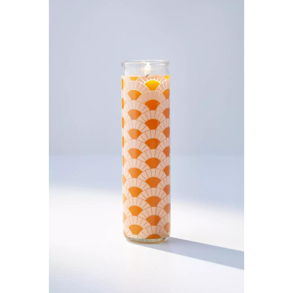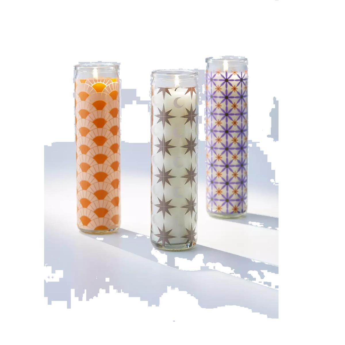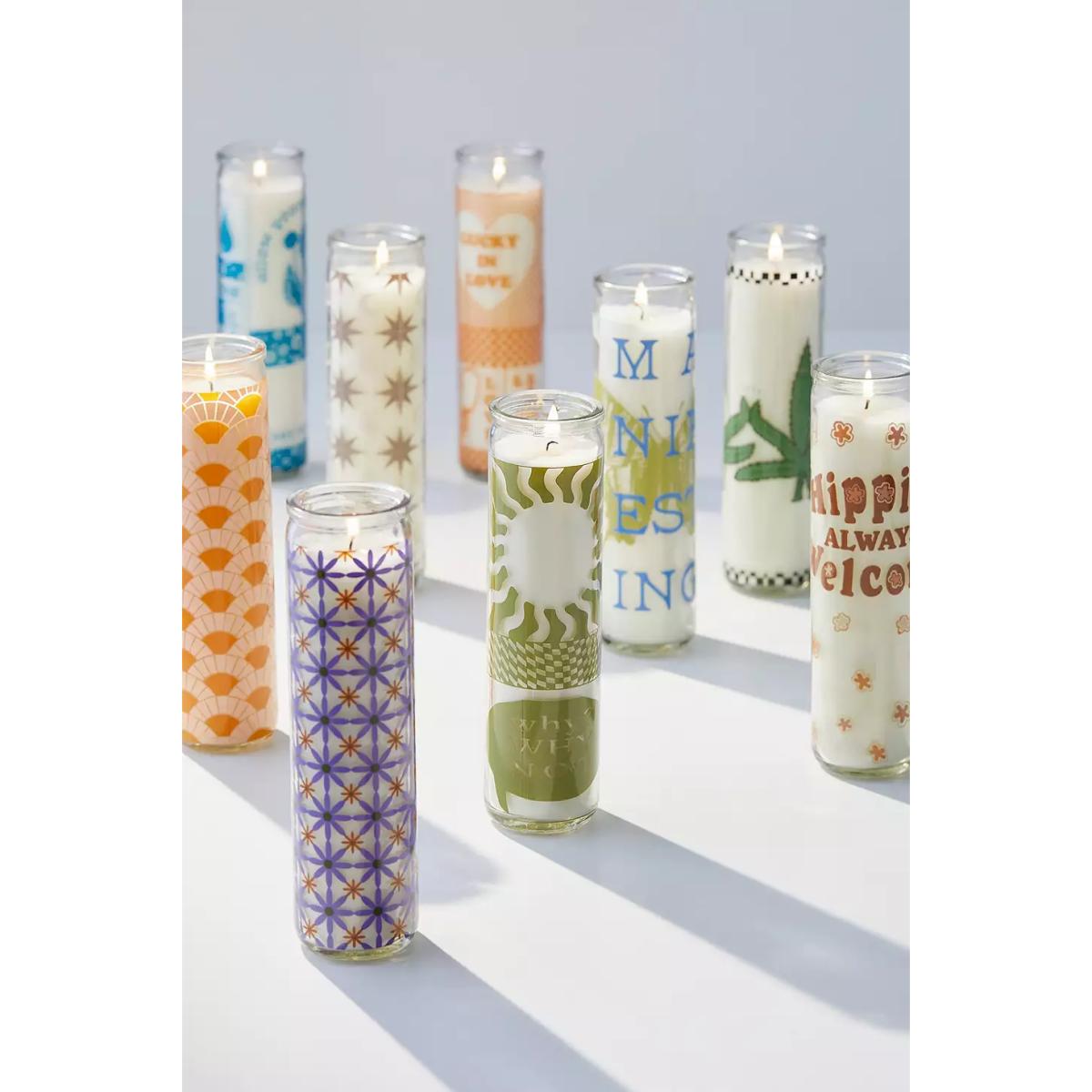 Printed glass pillar candle with scented wax for filling your space with a vibey scent. Features a pillar silhouette with a glass construction and printing all-around. **Content + Care** \- Nirvana:Patchouli, tonka, sweet jasmine, tropical nectar \- 118hr burn time \- Glass, Wax \- Wipe clean **Size** \- Dimensions:Dia: 6.4cm x H: 21cm