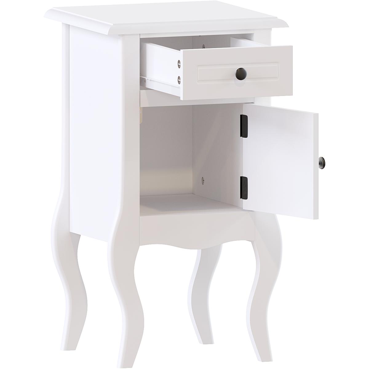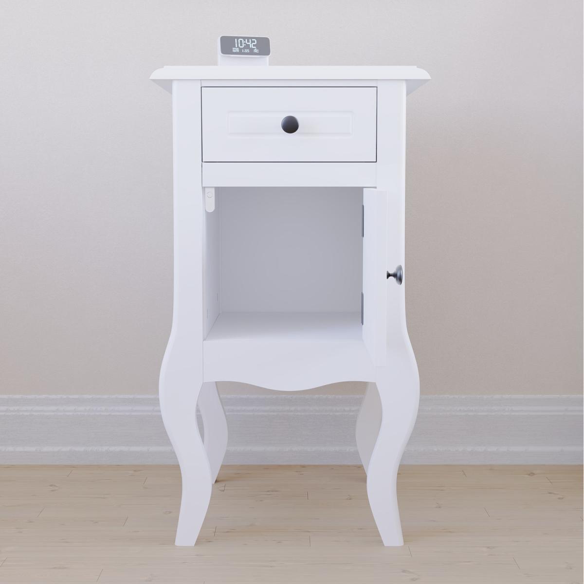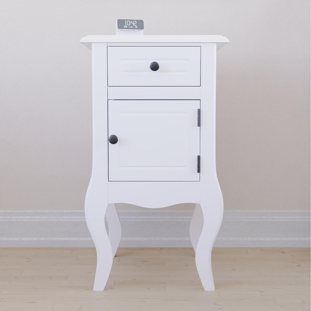 This stunning Nishano 1 Drawer 1 Door Bedside Cabinet features a painted white finish and an elegant contemporary style. This bedside table, which is finished with brass knobs, will add a touch of elegance to whichever room it is used in, be it the bedroom, nursery, or living room. It has ample storage space including a tabletop for displaying objects like a lamp, picture frame, charging station, or clock, a cabinet with one door and one drawer for your personal items, and curving legs for a touch of elegance.