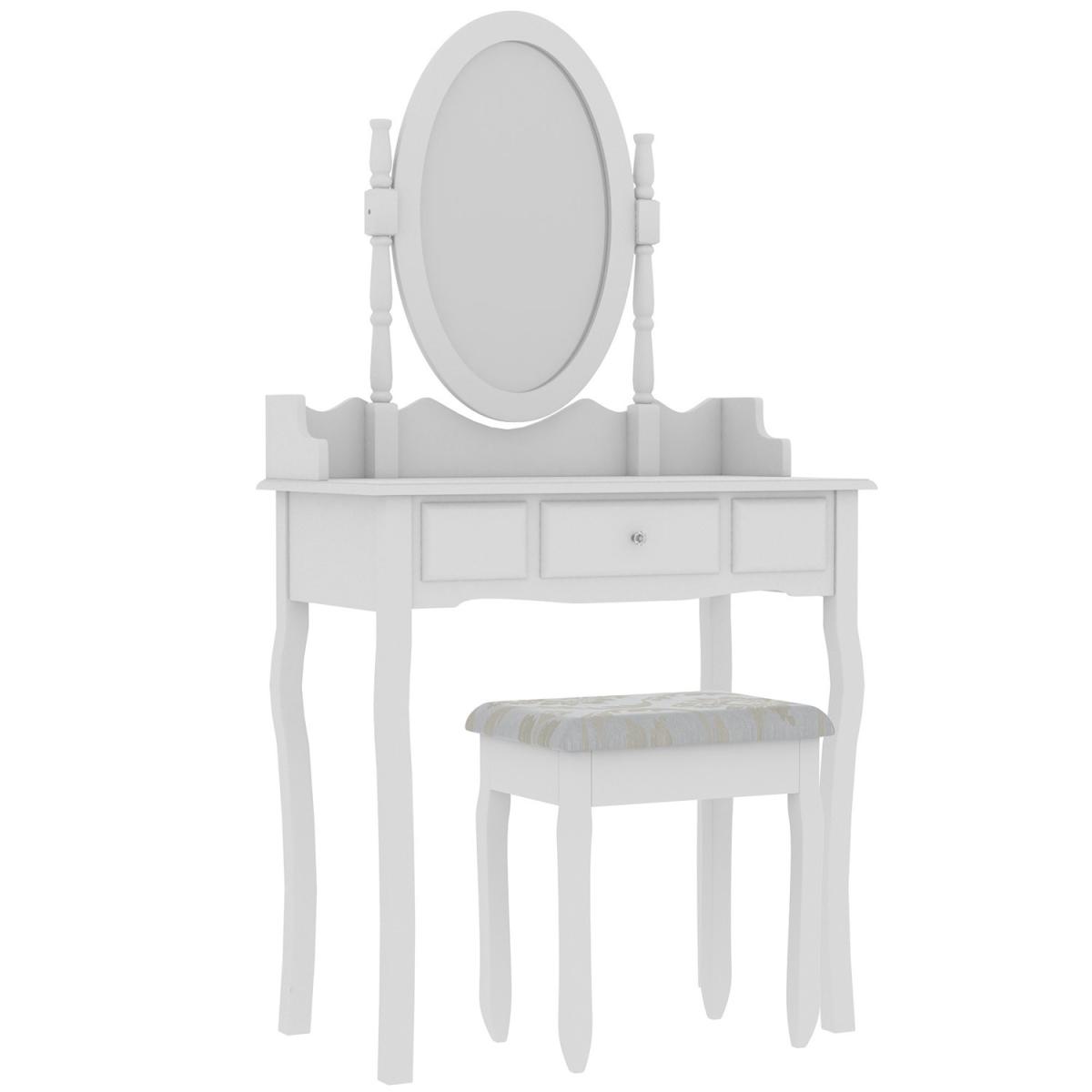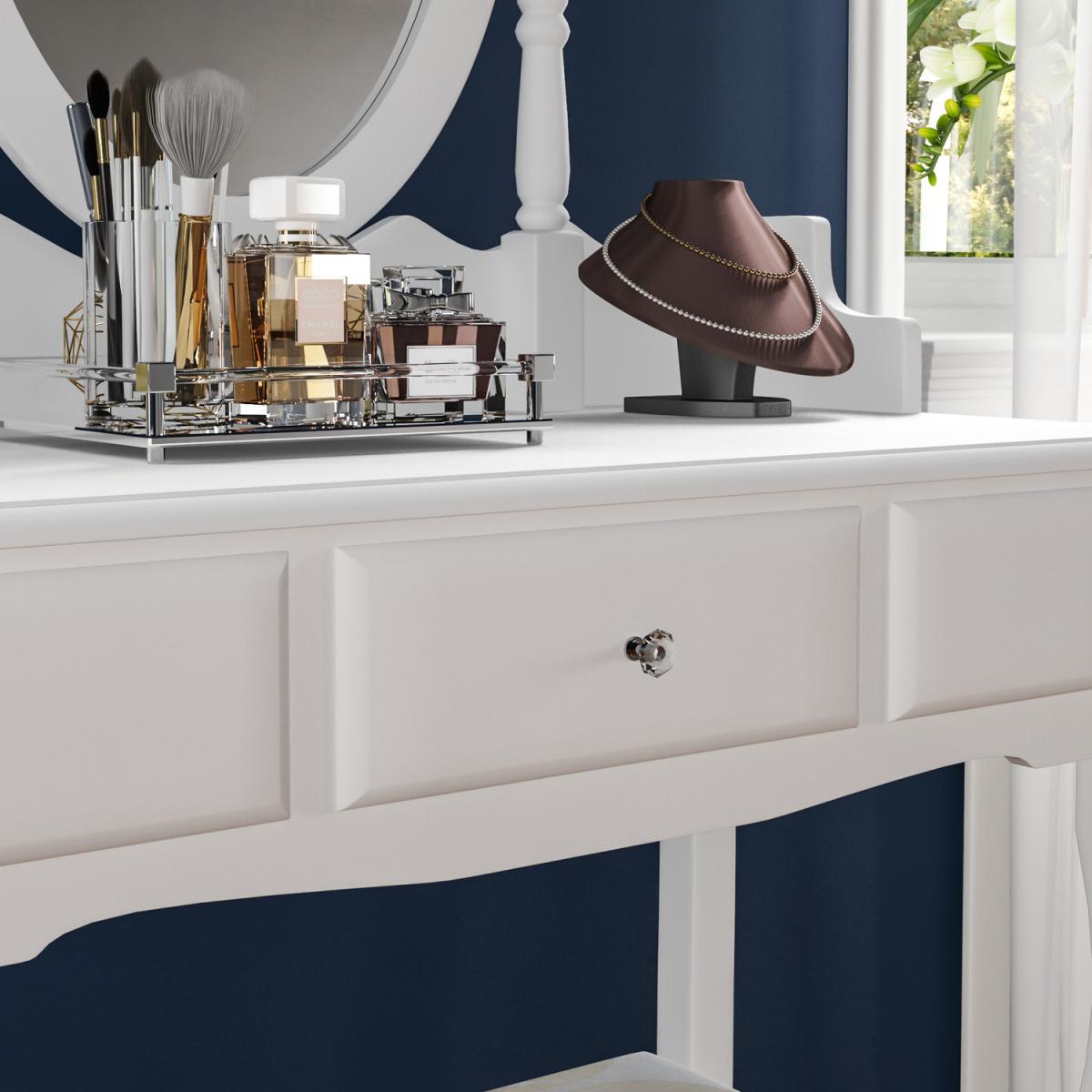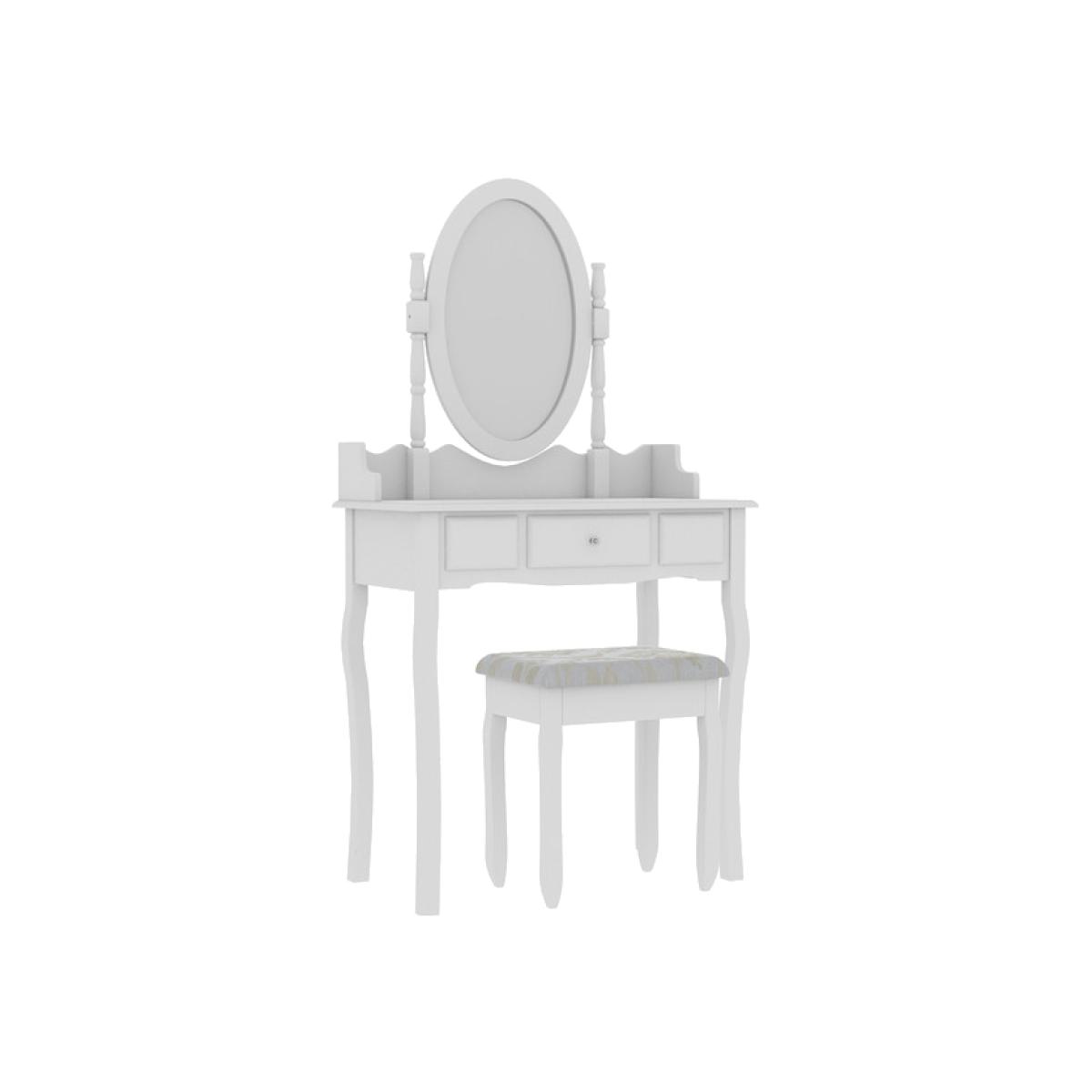 Get ready in traditional style at the Nishano 1 Drawer White Dressing Table, crafted from wood with a hint of ornate style. This dressing table features a central drawer to store all of your beauty products and accessories and its oval mirror brings elegance to your room while providing a clear reflection as you prep for the day. This unit is finished all over in pure white and comes complete with a matching stool, creating a beautiful feature for your bedroom or dressing room.