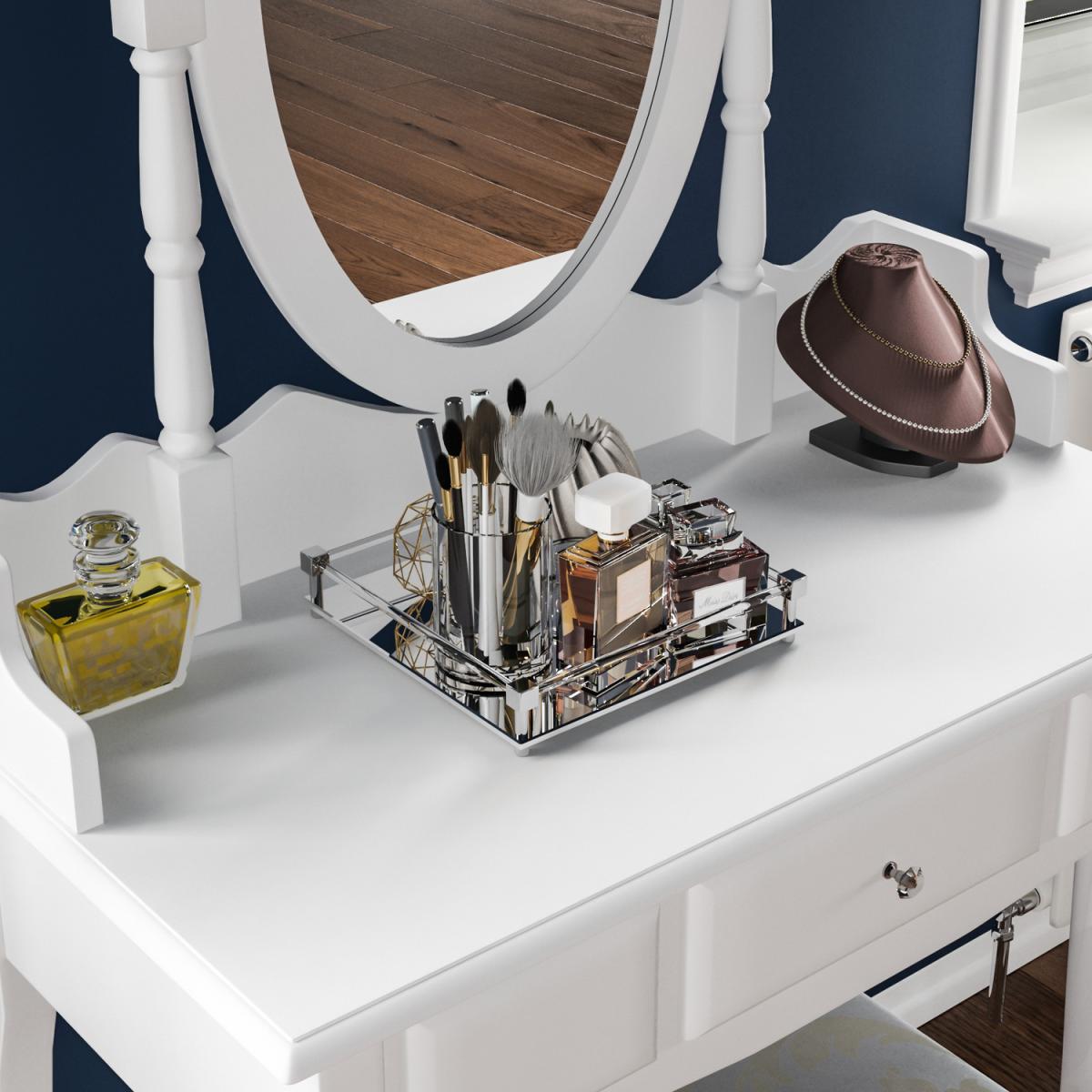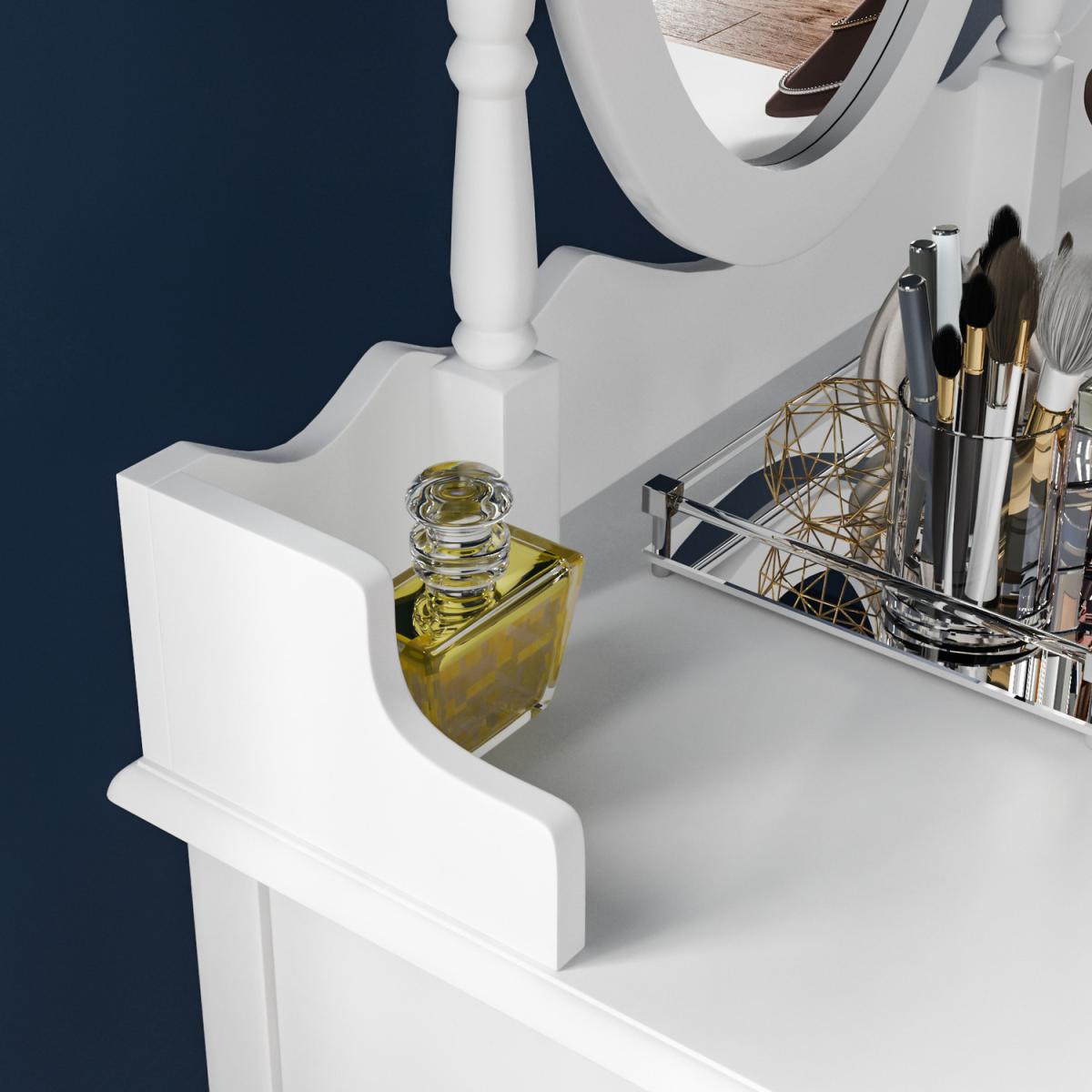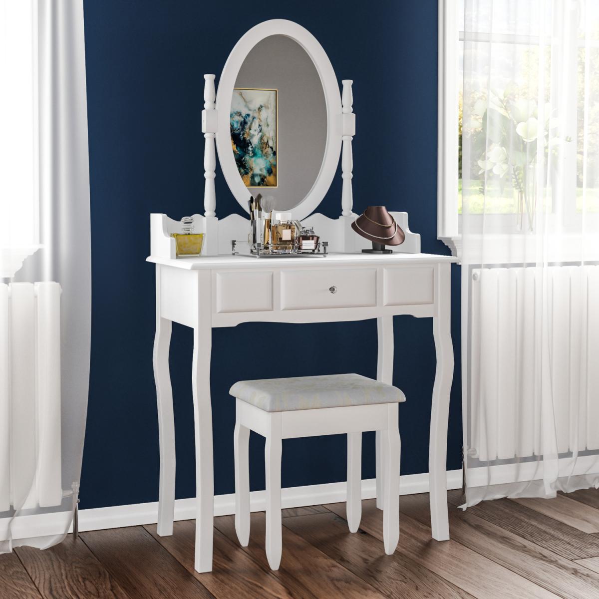 Get ready in traditional style at the Nishano 1 Drawer White Dressing Table, crafted from wood with a hint of ornate style. This dressing table features a central drawer to store all of your beauty products and accessories and its oval mirror brings elegance to your room while providing a clear reflection as you prep for the day. This unit is finished all over in pure white and comes complete with a matching stool, creating a beautiful feature for your bedroom or dressing room.