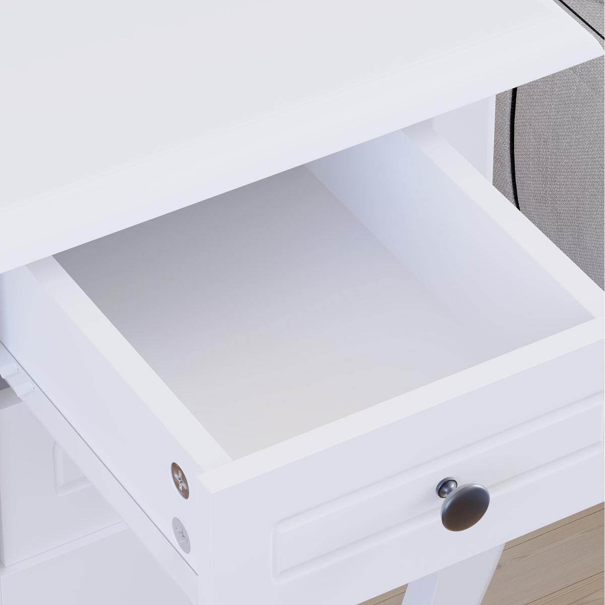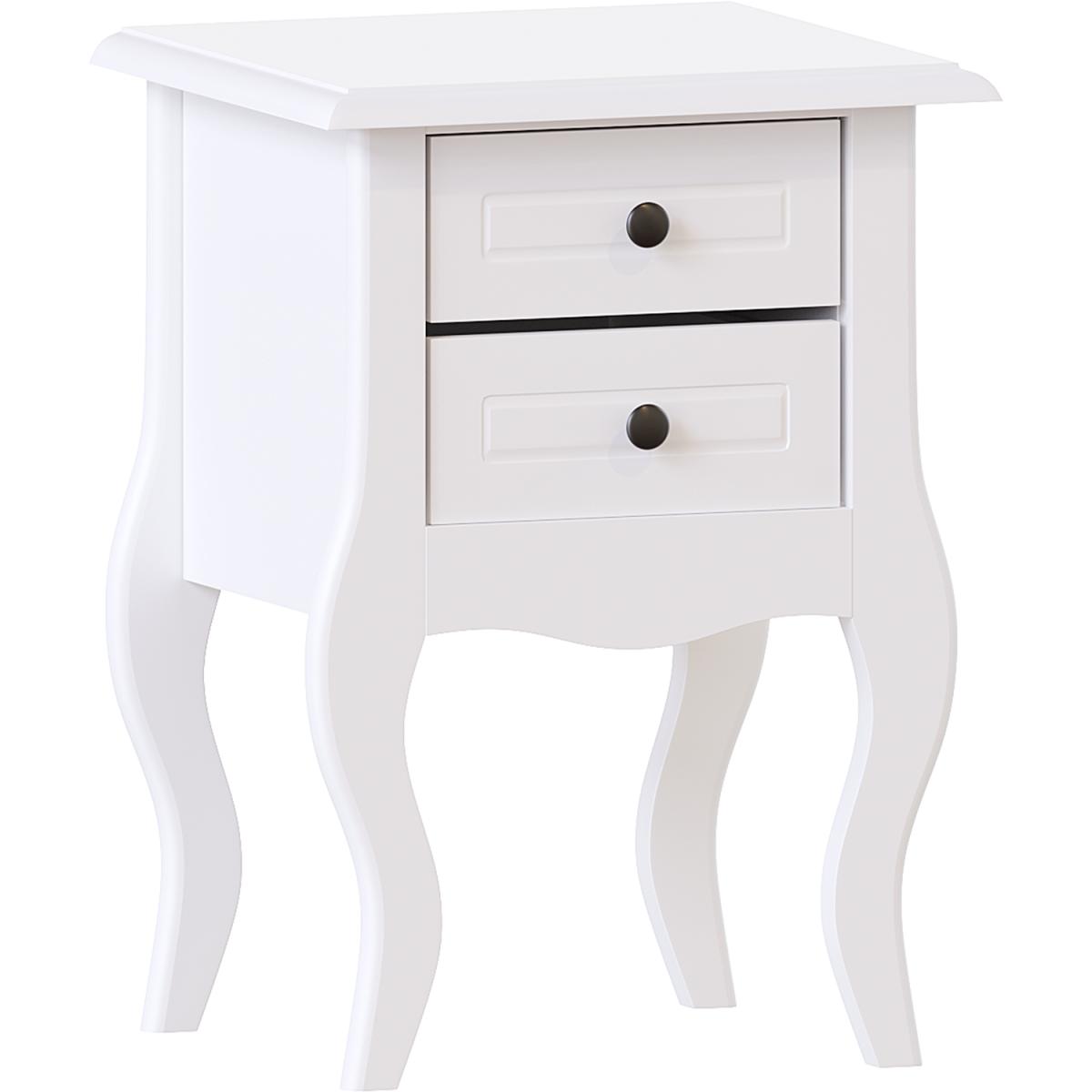 This stunning Nishano 2 Drawer Cabinet features a painted white Finish and an Elegant Contemporary Style. This bedside table, which is finished with brass knobs, will add a touch of elegance to whichever room it is used in, be it the bedroom, nursery, or living room. It has ample storage space including a tabletop for displaying objects like a lamp, picture frame, charging station, or clock, two drawers for your personal items, and curving legs for a touch of elegance.