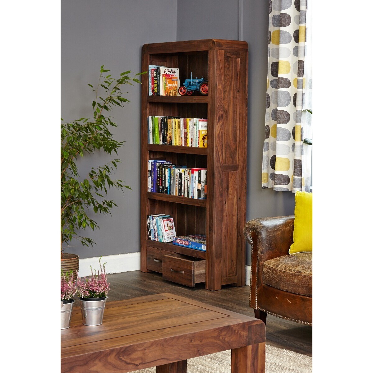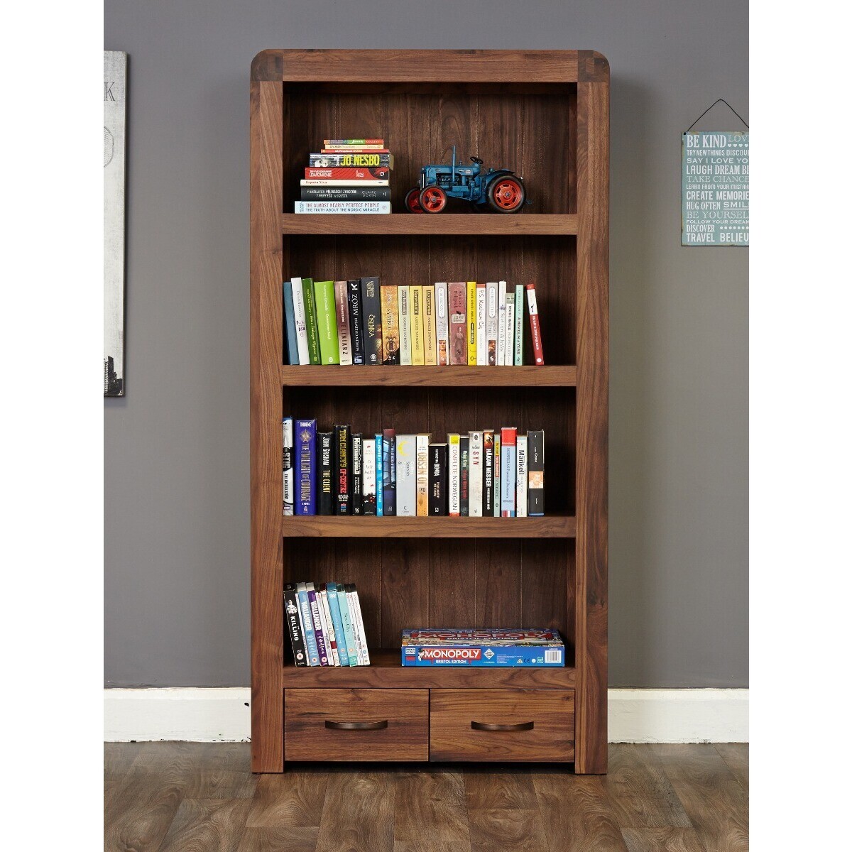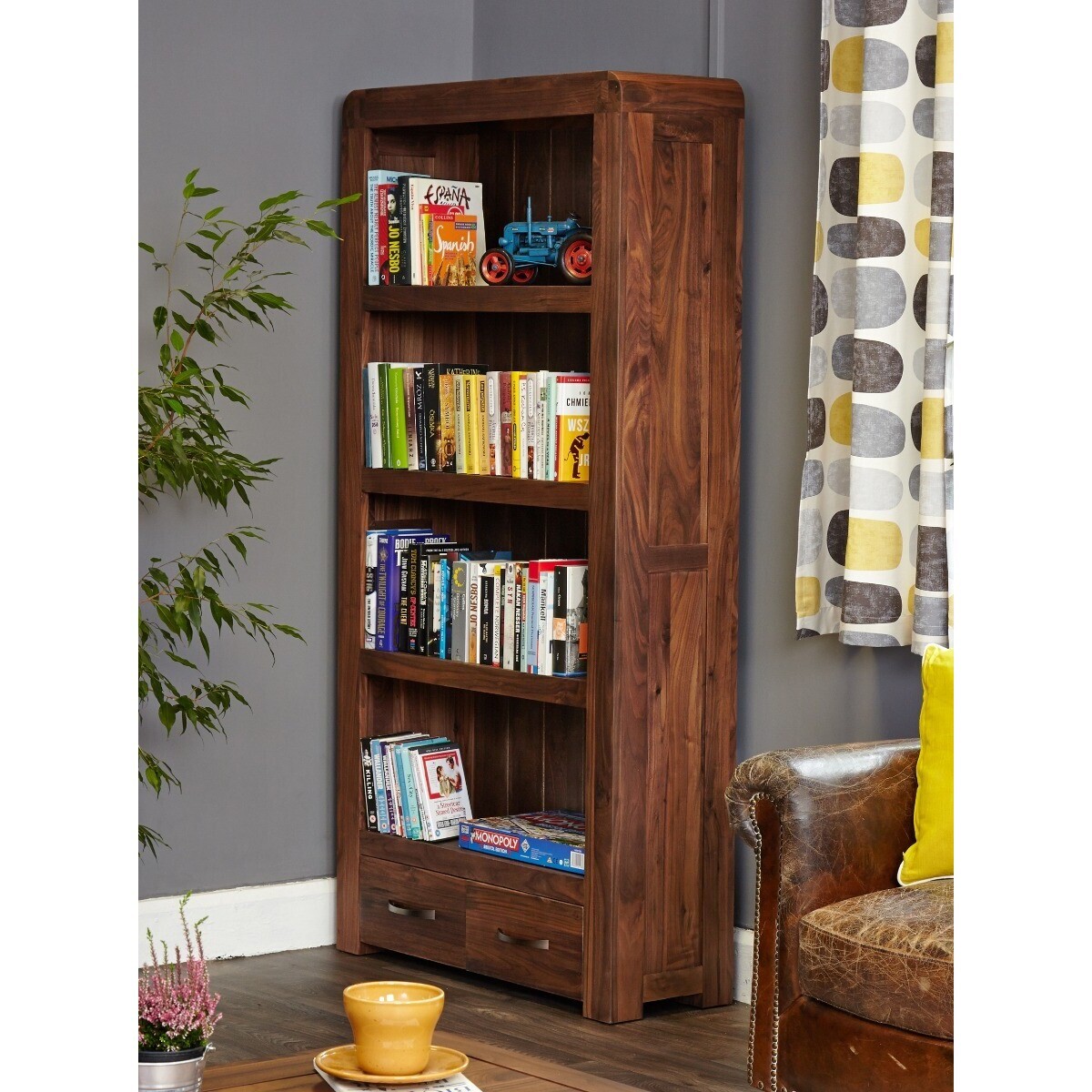The Nishio range is a truly outstanding collection of furniture manufactured to the highest standards. The impressive bookcase has a timeless design perfect for contemporary settings and features ample storage space with 4 fixed shelves and two drawers at the base. The bookcase is made from top grade solid walnut and has been designed to last a life time. A resilient satin lacquered finish highlights the complex grain pattern and rich hue for which the timber is famed. A classic tongue and groove back, fully dovetailed drawers and antique bronze handles are in keeping with the quality of the range. Matching items for the living and dining rooms are available. Please note – This item is delivered by a one-man delivery service to the threshold of the property and NOT to a room of choice.