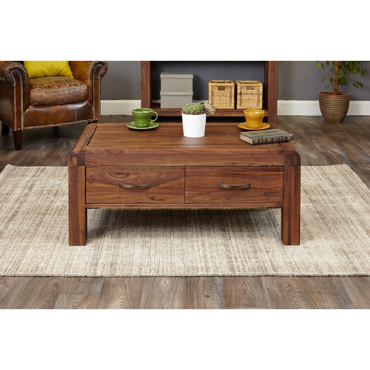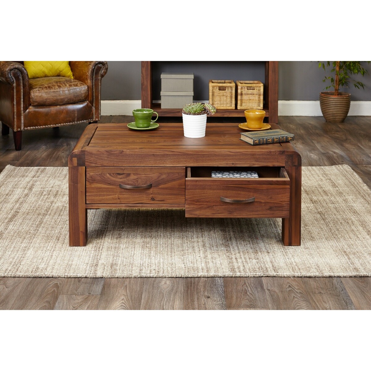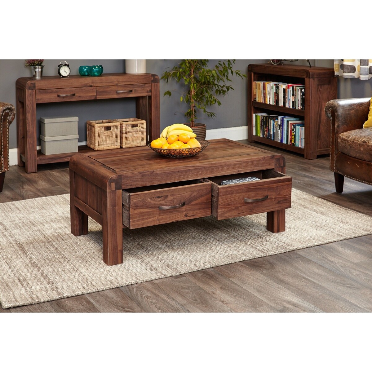 The Nishio range is a collection of furniture that makes no compromises on quality and style. The stunning Nishio coffee table offers practical storage in its four drawers and features an extra thick top and matching frame. Elegantly rounded corners slightly soften the visuals of what is a substantial piece of furniture that's sure to grace your living room for decades to come. Crafted from specially selected 100% solid walnut, the table is finished with a resilient satin lacquer. The finish accentuates the natural characteristics of the timber, including a deeply rich hue and beautifully complex grain pattern. The drawers are fully dovetailed and finished with antique bronze handles. The Nishio complements any dark wood furniture but matching items from the range for the living and dining rooms are available. Please note -. This item is delivered by a one-man delivery service to the threshold of the property and. NOT. To a room of choice.