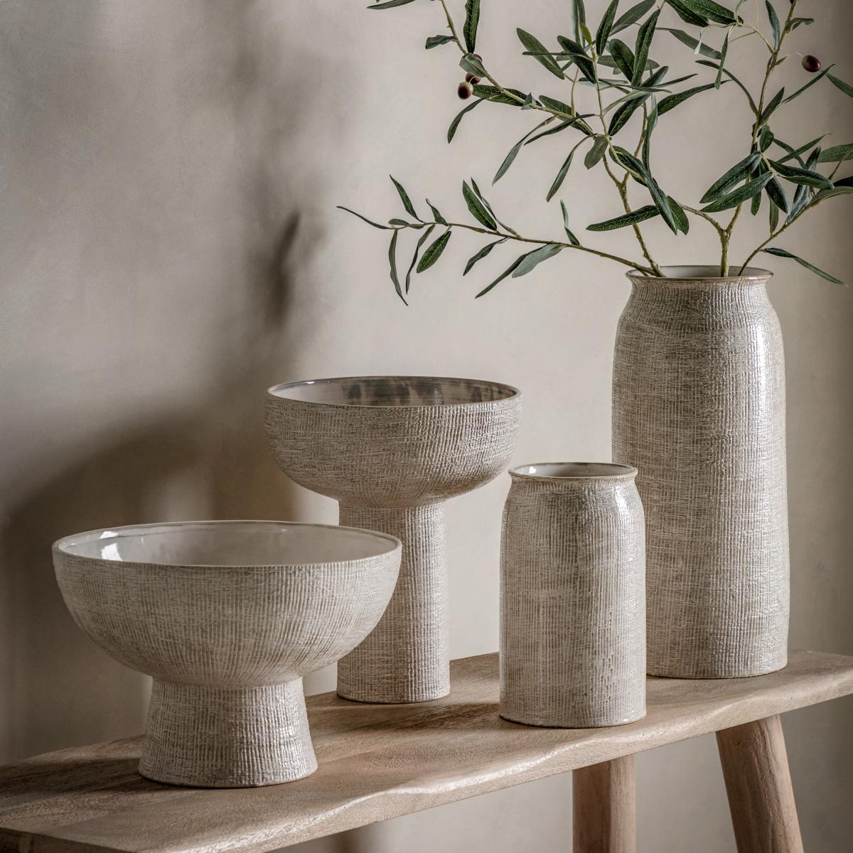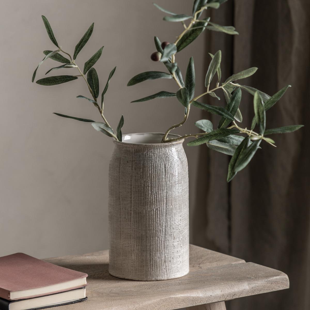 I love this little vase for its understated elegance and tactile texture, making it a versatile piece for various interiors. It works particularly well in minimalist, Scandinavian, or modern rustic spaces where its neutral tone and simple shape can stand out subtly. For styling tips, try pairing it with fresh or dried greenery, like olive branches or wildflowers, to enhance its natural aesthetic. It’s also great as a standalone piece on a side table or shelf, where its understated design can shine without competing with other decor. Keep in mind the vase's smaller size, making it perfect for single-stem arrangements or small bunches to add a touch of colour and life to your space without overwhelming it.