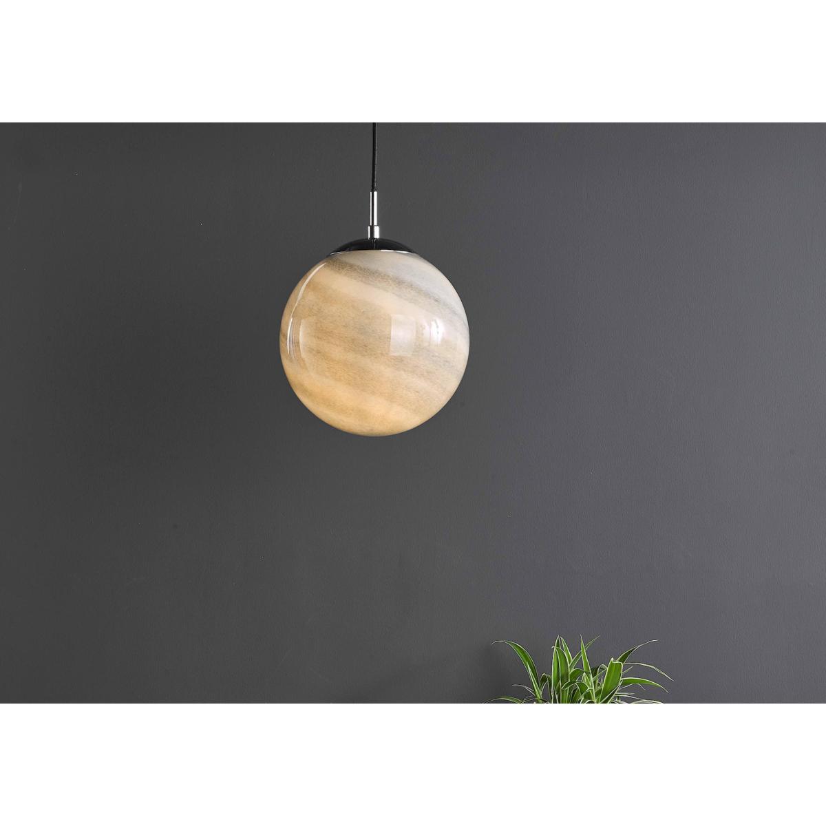 This beautiful pendant light is inspired by the planet Saturn. Its shining, ornate glass shade is a swirling symphony of blues and oranges and is accentuated by a bright polished chrome ring. Why you'll love it Saturn-inspired ceiling pendant is bold and beautiful. A single white glass light shade is embellished with swirls of blue and orange. Prefer a less planetary look? The ring is removable. Polished chrome details. Height-adjustable at installation. This pendant light is part of the Furniture Village lighting collection. What you need to know Steel base, glass shade. Professional installation advised. Requires 1 x E27 GLS max. 40 W bulb (not included). Please do not exceed this wattage. To clean, wipe gently with a clean soft cloth. Be sure to disconnect from the power outlet before cleaning. Dimensions Height: 138 cm (55 in). Diameter: 45 cm (18 in). Item code: NIVA1PNDCRM-001