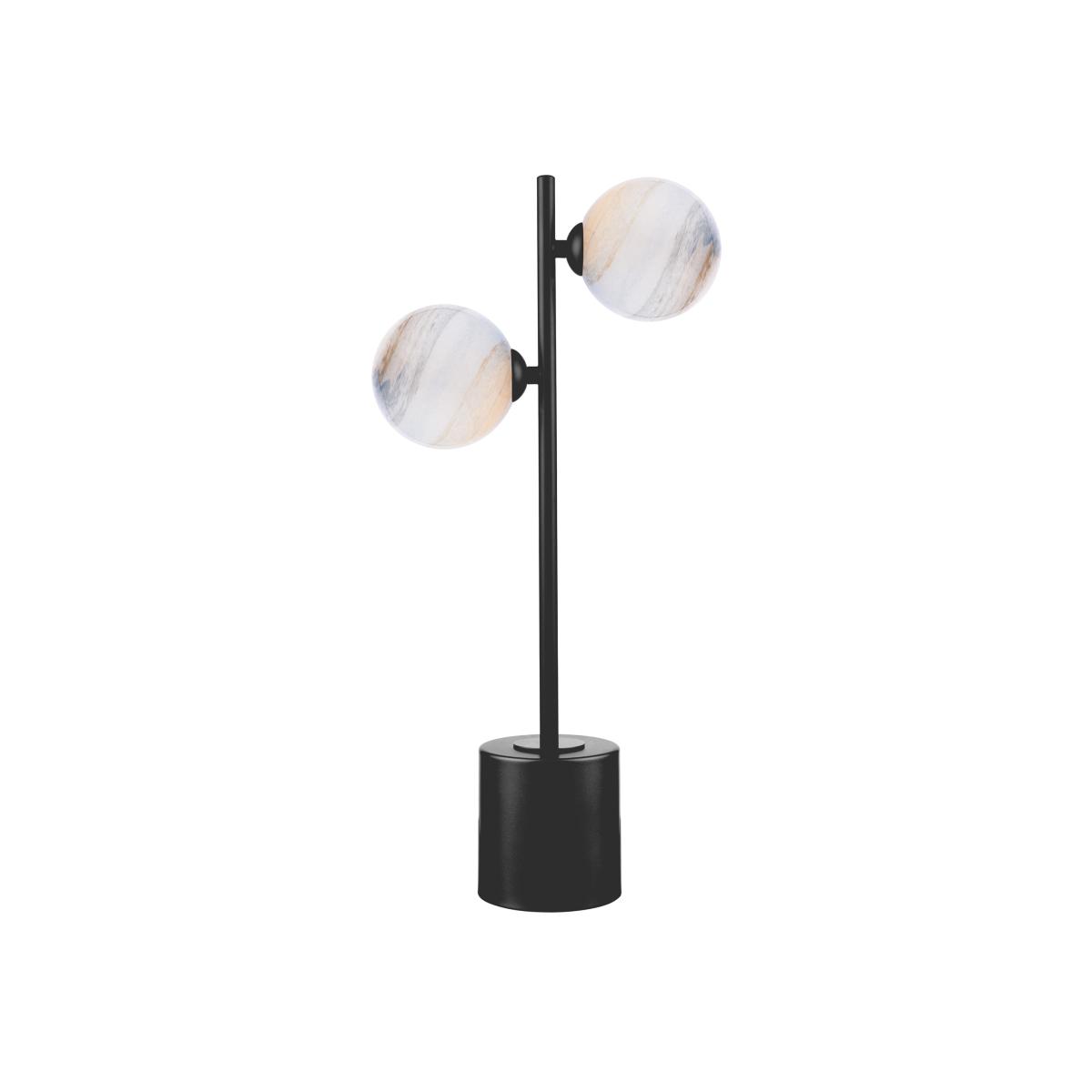 Elegant and contemporary, this table lamp delivers understated gam style thanks to its planet-inspired marbled glass shades and black satin-finish base. Why you'll love it Planet-inspired 2-light table lamp is bold and beautiful. 2 marbled glass shades mounted on a slender stem. Stem and plinth have an elegant satin finish. Sleek contemporary design for any room. This table lamp is part of the Furniture Village lighting collection. What you need to know Steel base, glass shades. Supplied with 150 cm cable. Requires 2 x G9 max. 40 W bulbs (not included). Please do not exceed this wattage. To clean, wipe gently with a clean soft cloth. Be sure to disconnect from the power outlet before cleaning. Dimensions Height: 48 cm (19 in). Diameter: 22 cm (9 in). Item code: NIVA2TBLBLK-001