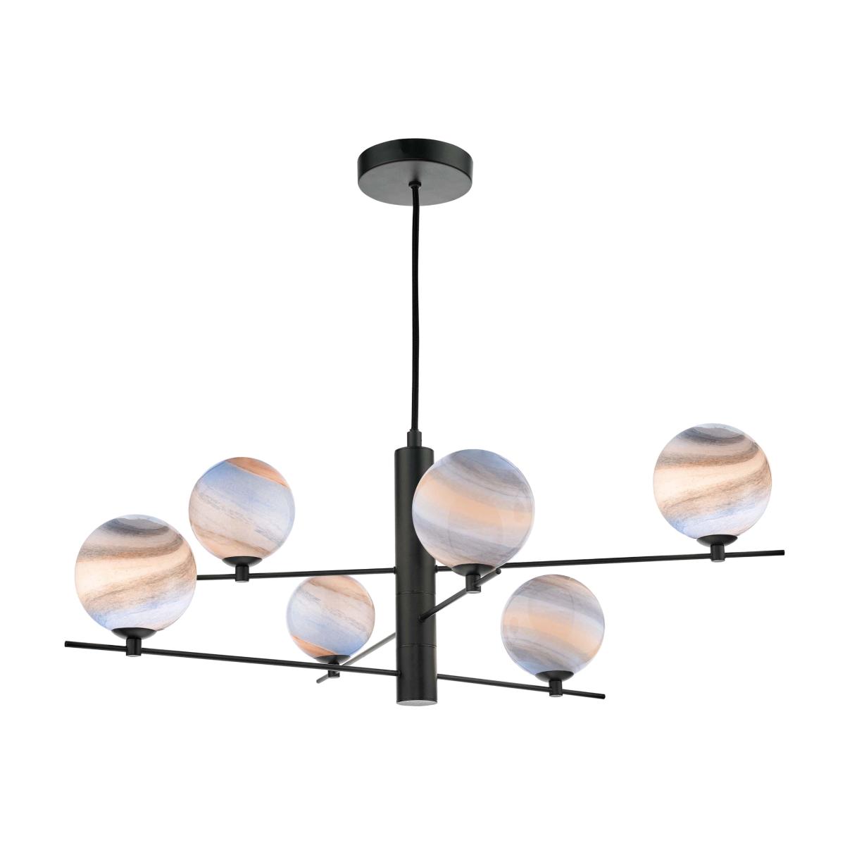 Bring showstopping style to your living room or dining room in the form of this stunning six-light ceiling pendant, a sleek combination of marbled glass and matte back metal. Why you'll love it Planet-inspired 6-light ceiling pendant light is bold and beautiful. 6 marbled glass shades surround a minimalist central column. Supporting arms, central column and celling rose have a matt black finish. Sleek contemporary design for any room. Height adjustable at installation. This pendant light is part of the Furniture Village lighting collection. What you need to know Steel base, glass shades. Professional installation advised. Requires 6 x G9 max. 25 W bulbs (not included). Please do not exceed this wattage. To clean, wipe gently with a clean soft cloth. Be sure to disconnect from the power outlet before cleaning. Dimensions Height: 130 cm (52 in). Width: 60 cm (24 in). Depth: 64 cm (25 in). Item code: NIVA6PNDBLK-001