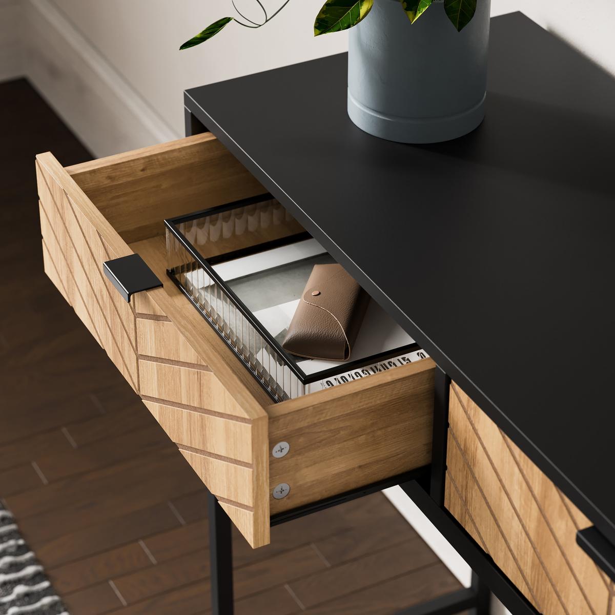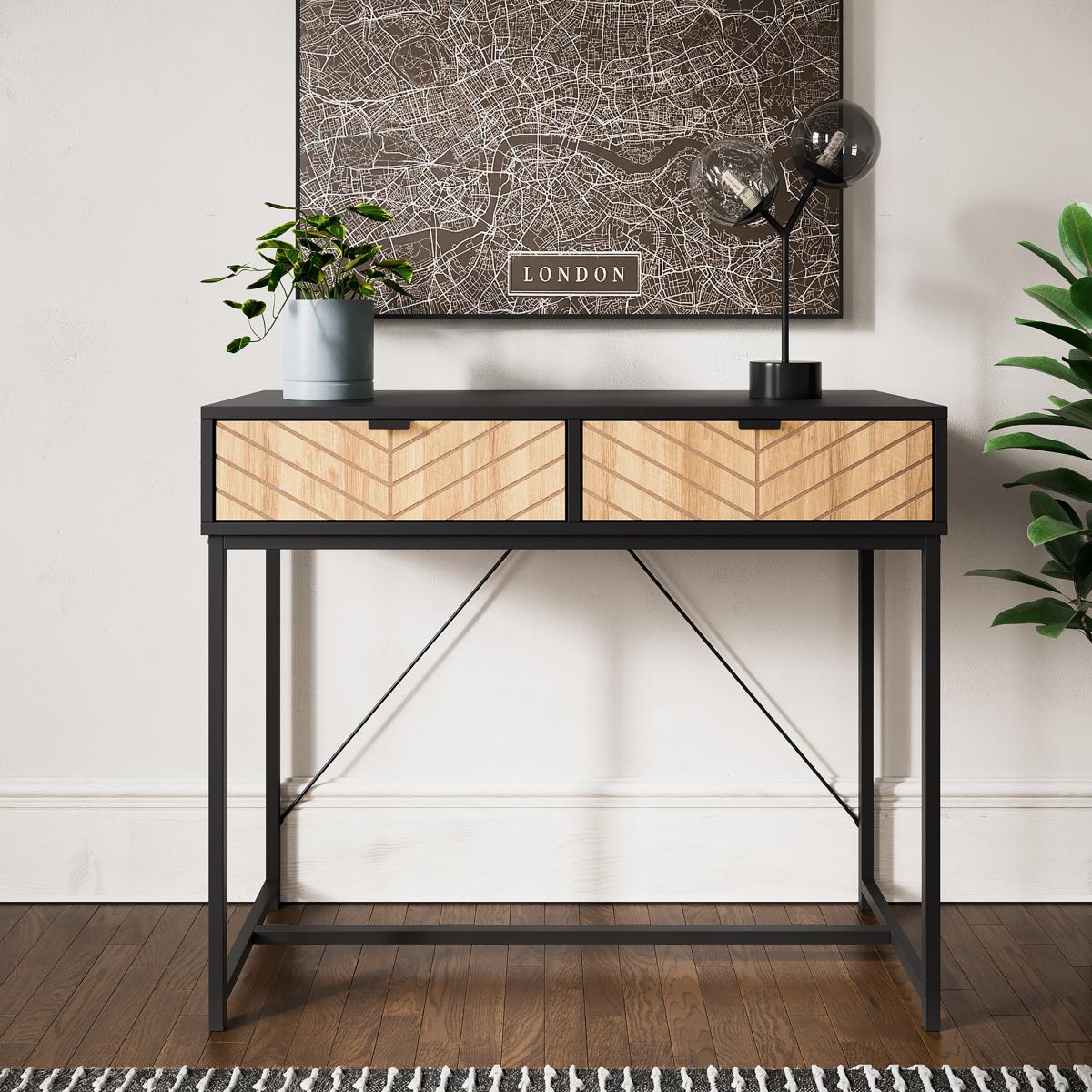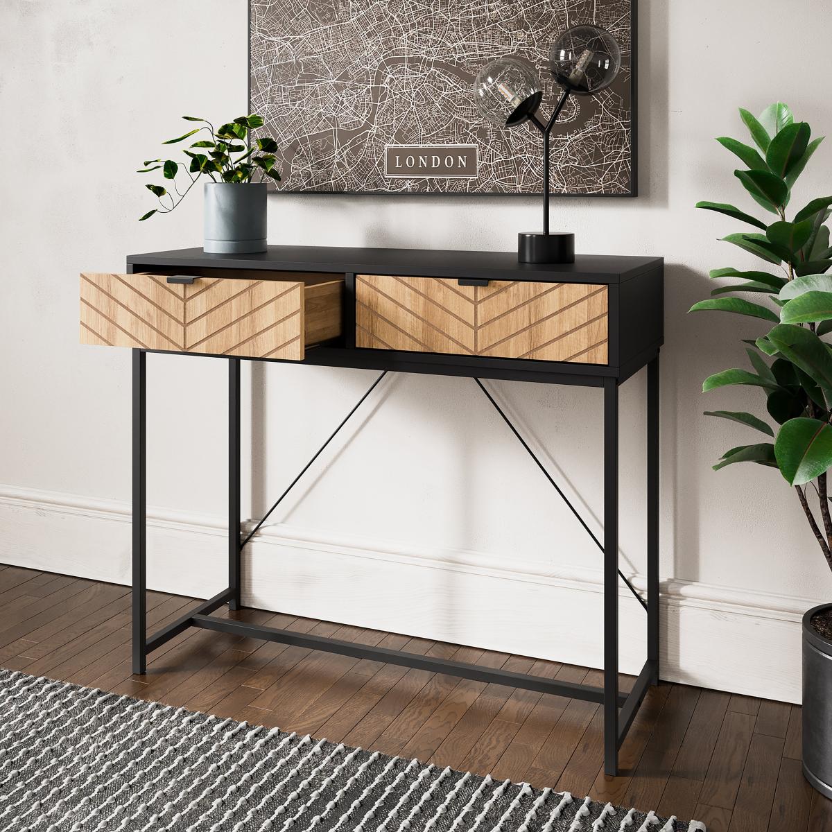 I’m a fan of the Nixon console for its neat mix of black metal and chevron-effect oak fronts - it brings just enough texture without overpowering a space. Its slim profile is ideal for a hallway or tucked behind a sofa in a living area, and the two drawers are perfect for stashing keys, mail or remote controls. Style it with a sleek lamp, a small plant and a framed print above to keep things looking fresh; if you need extra storage, slide in a couple of woven baskets on the lower shelf for scarves or magazines.